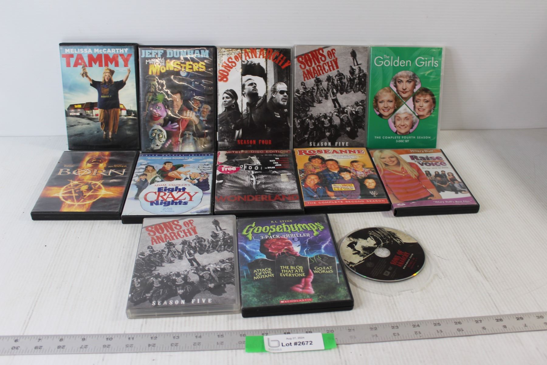 Assorted DVD Movies TV Shows: Tammy, Adam Sandler's Eight Crazy Nights, Sons of Anarchy Full Season 4 and 5, Goosebumps/Sons Of Anarchy Season 1/Roseanne Missing Some Discs