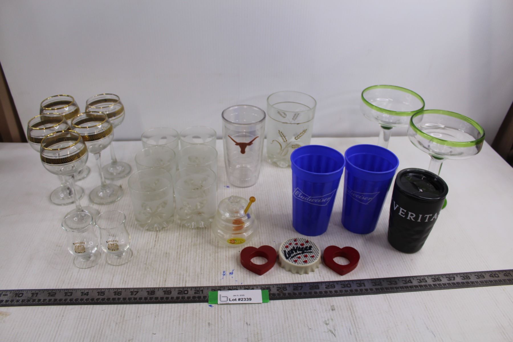 Assorted Glass Ware (5 - Wine Glasses, Set of 6 Drinking Tumblers, 2 Mike's Hard Margarita Glasses, 4 Plastic, 2 Bailey's Sippers, Oversized Wheat Sheaf) Misc.