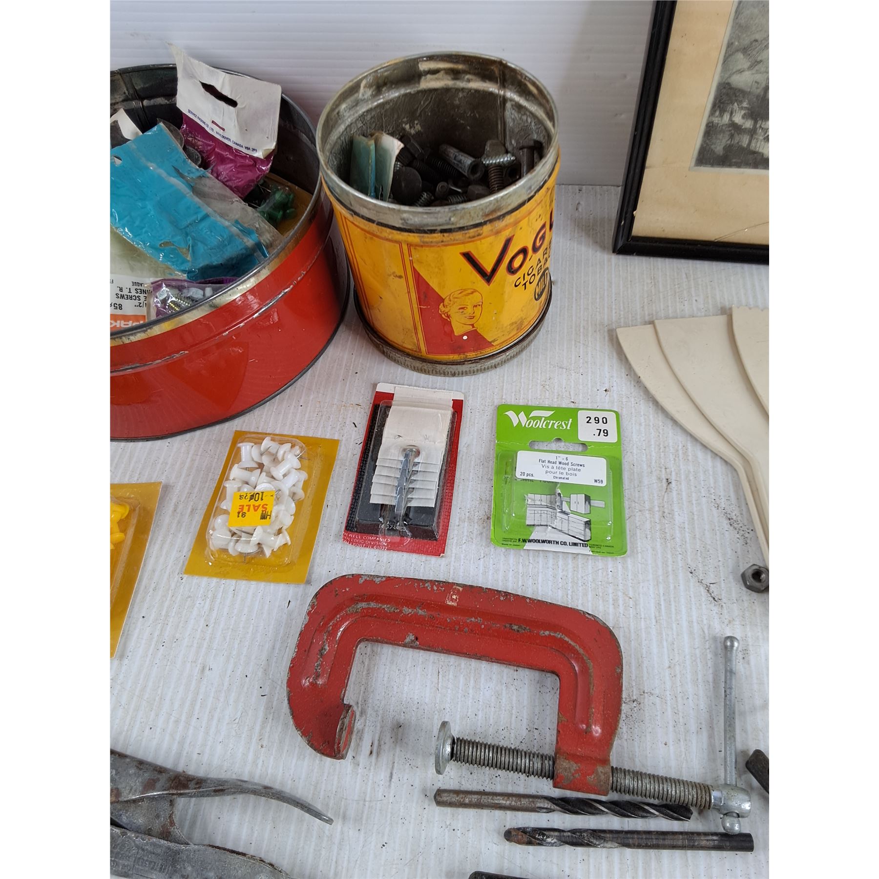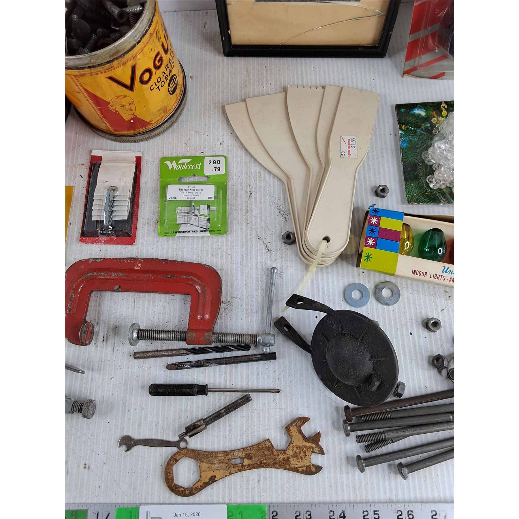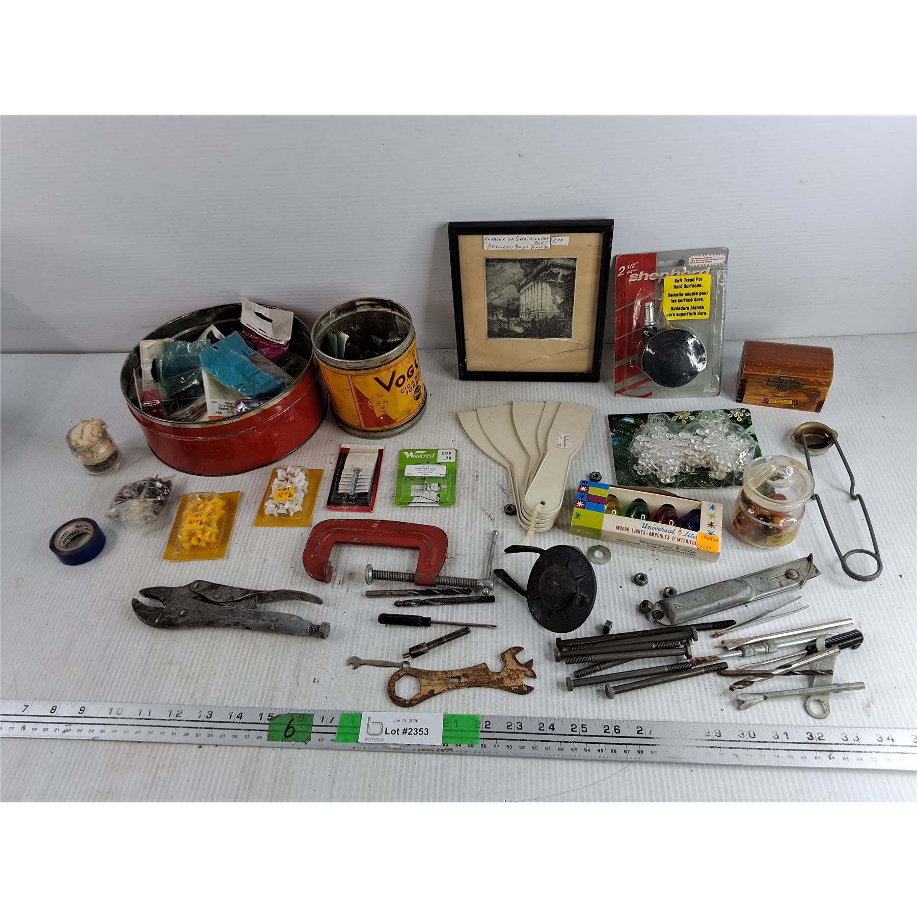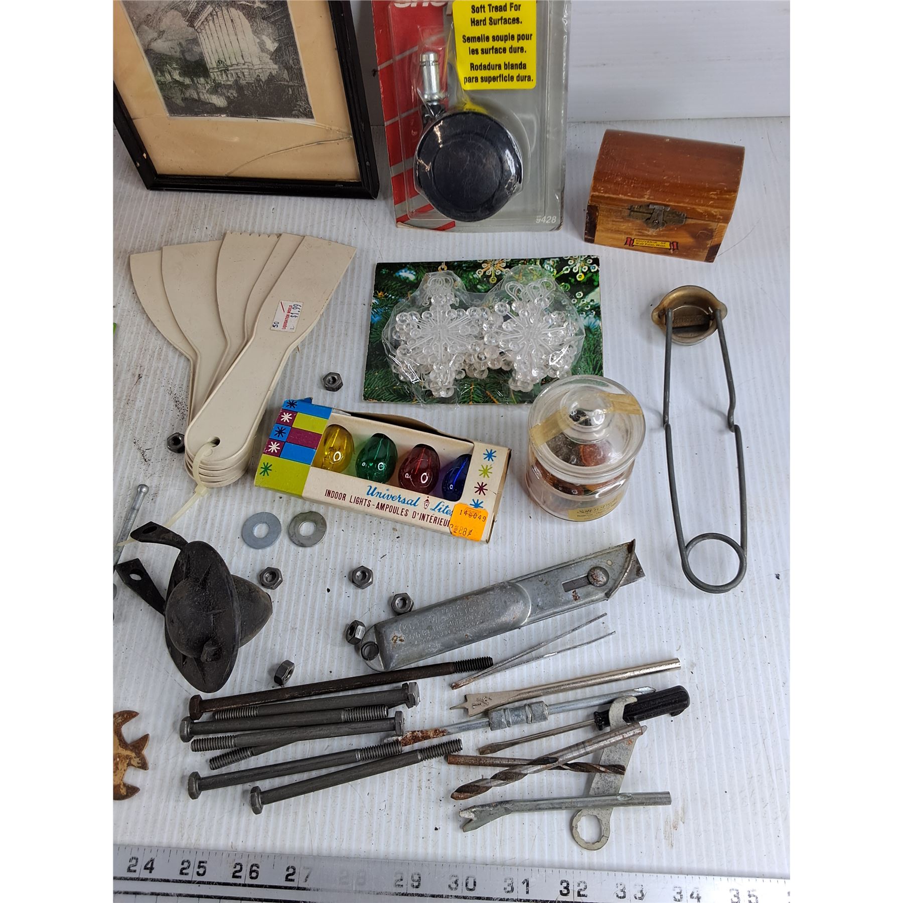 Assorted Hardware, Vise Grips, 3" C Clamp, Drill Bits, Lighter, Box Cutter, Indoor Lights Bulbs