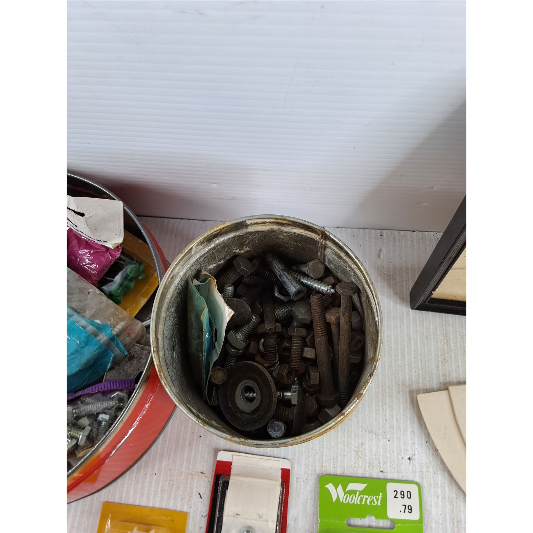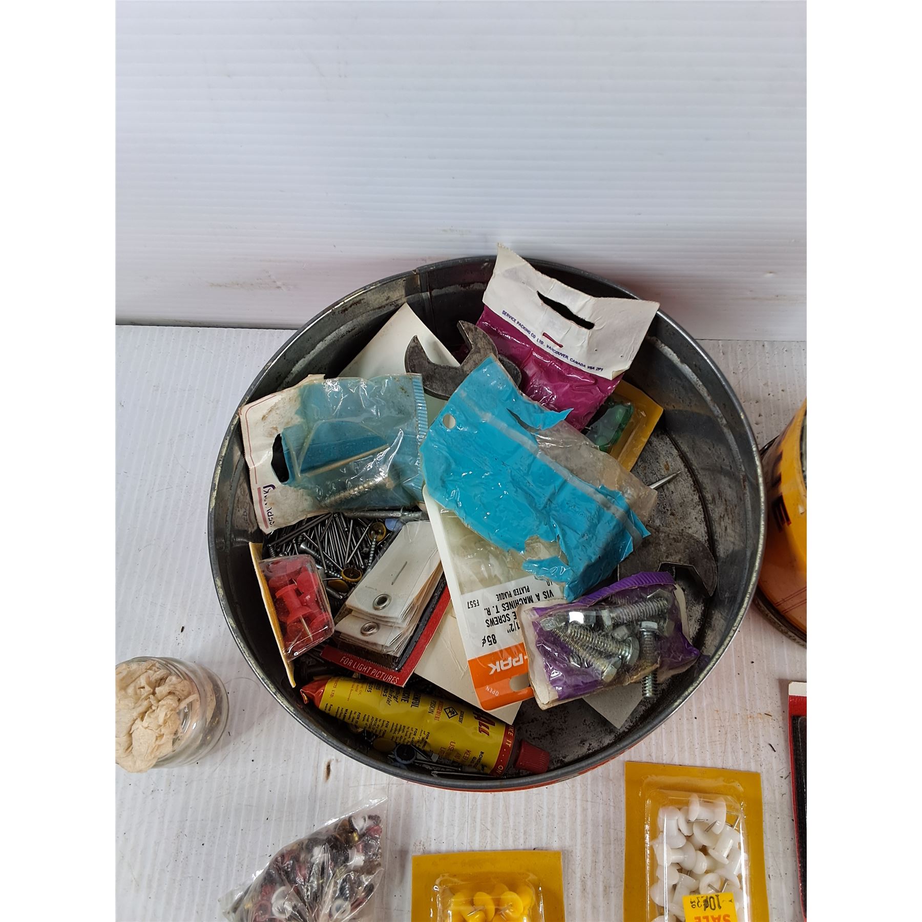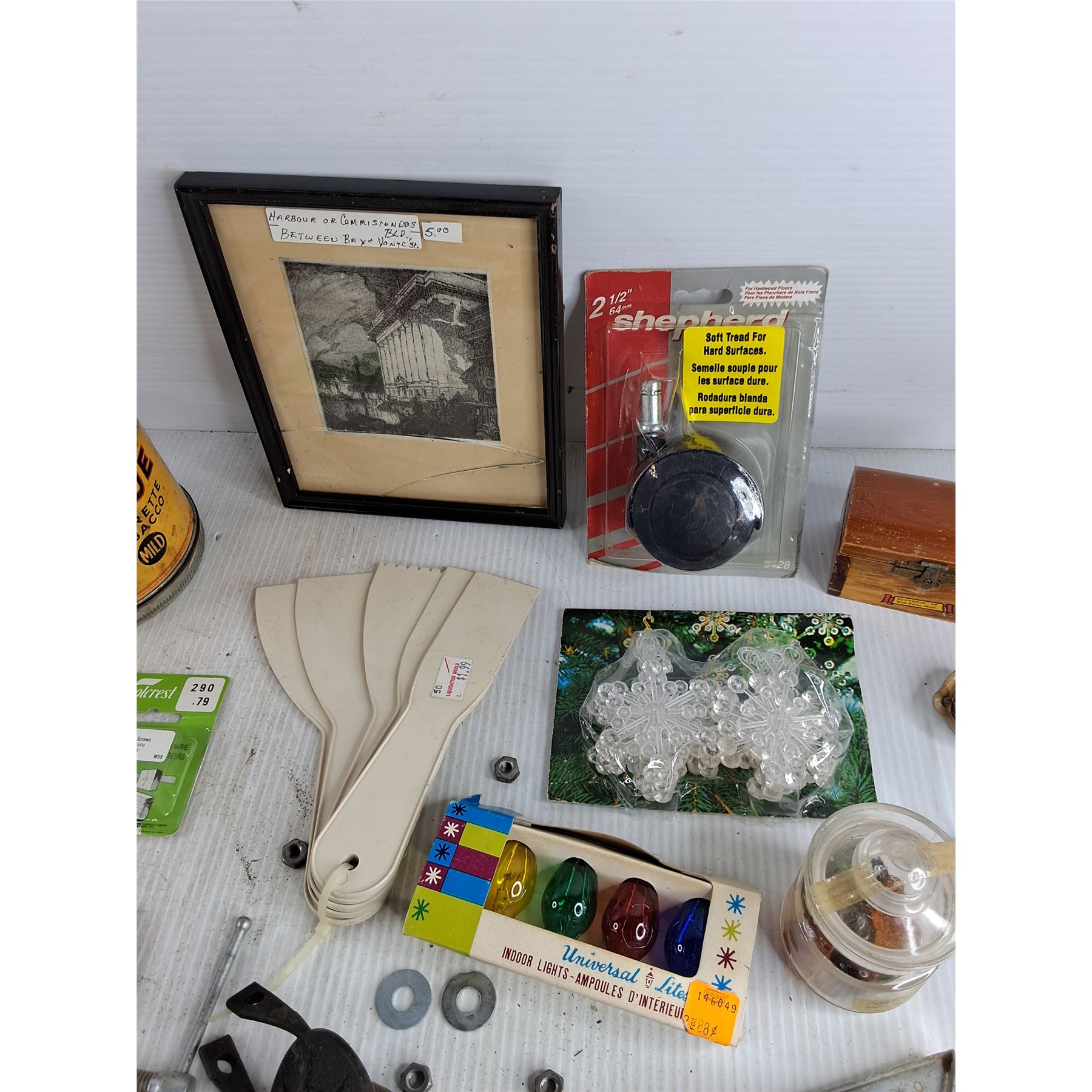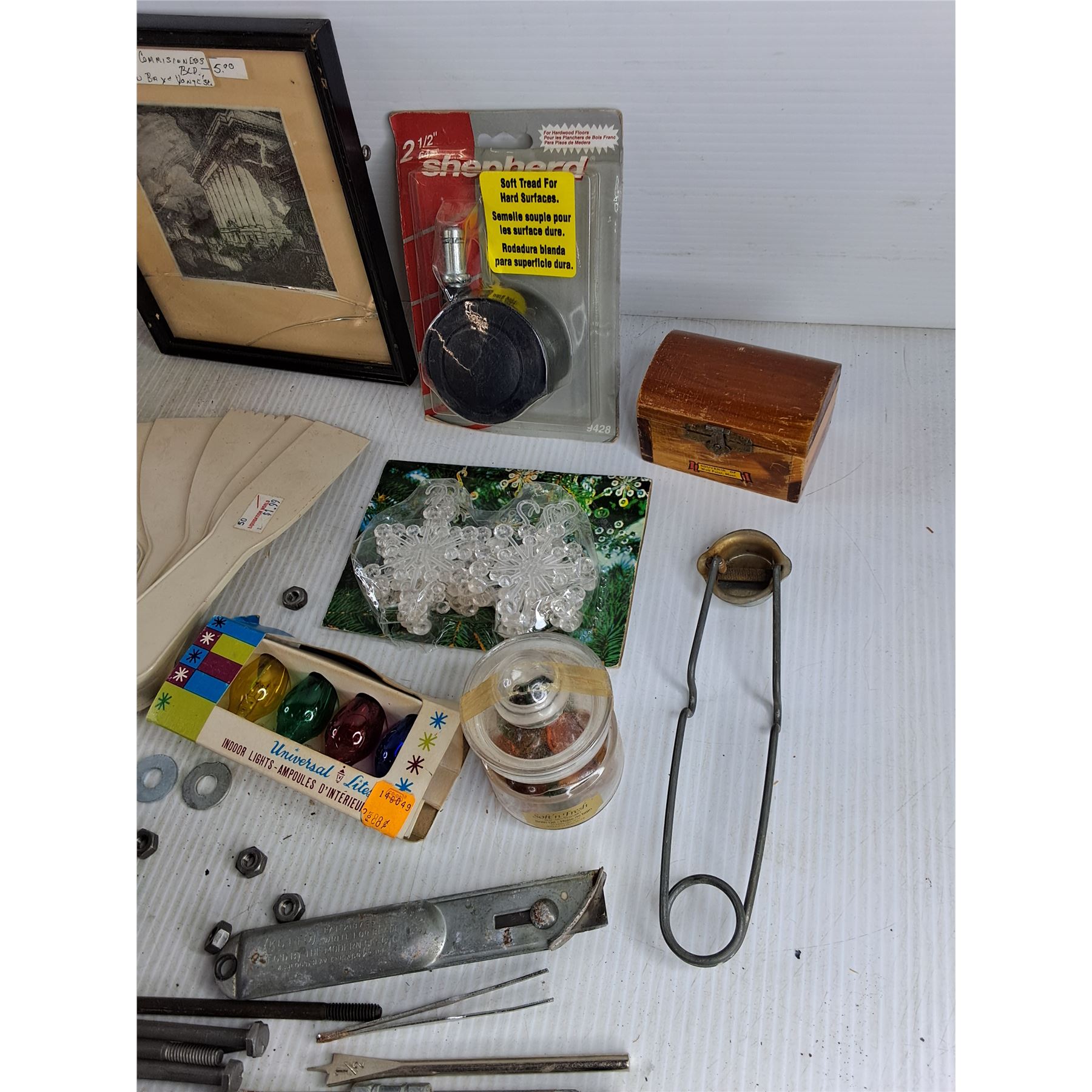 Assorted Hardware, Vise Grips, 3" C Clamp, Drill Bits, Lighter, Box Cutter, Indoor Lights Bulbs