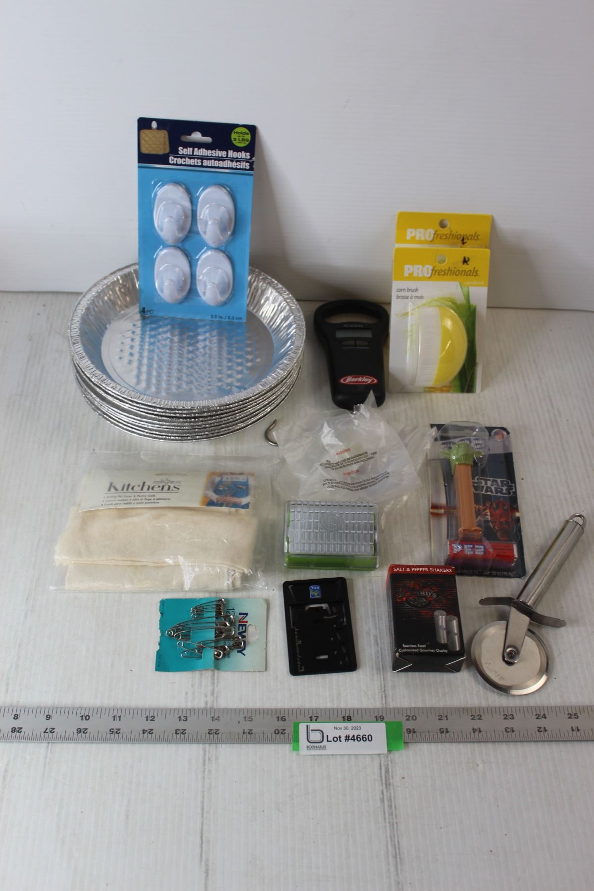Assorted Housewares - Adhesive Hooks, Berkley Scale, Salt & Pepper Shakers, Star Wars Pez Dispenser, Pizza Cutter, Brushes, etc.