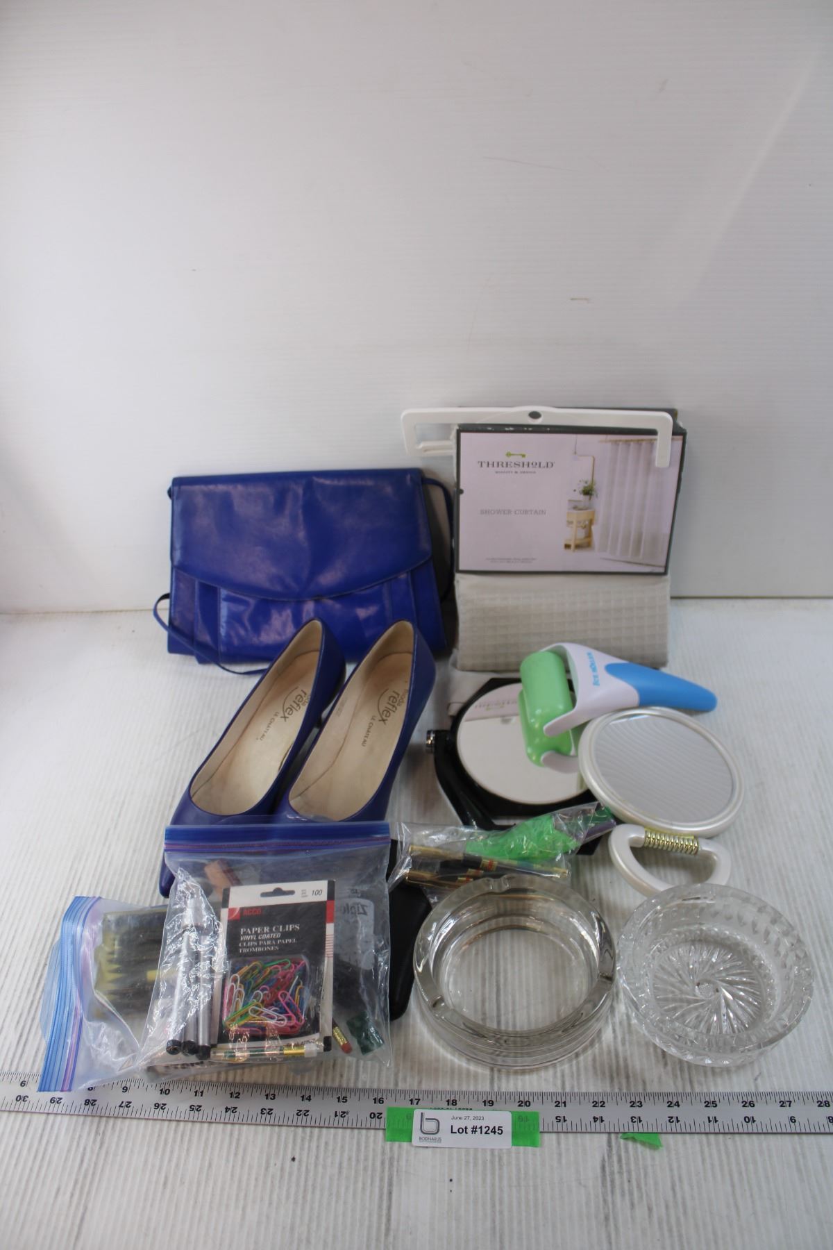 Assorted Items - Women's Shoes, Purse, Shower Curtain
