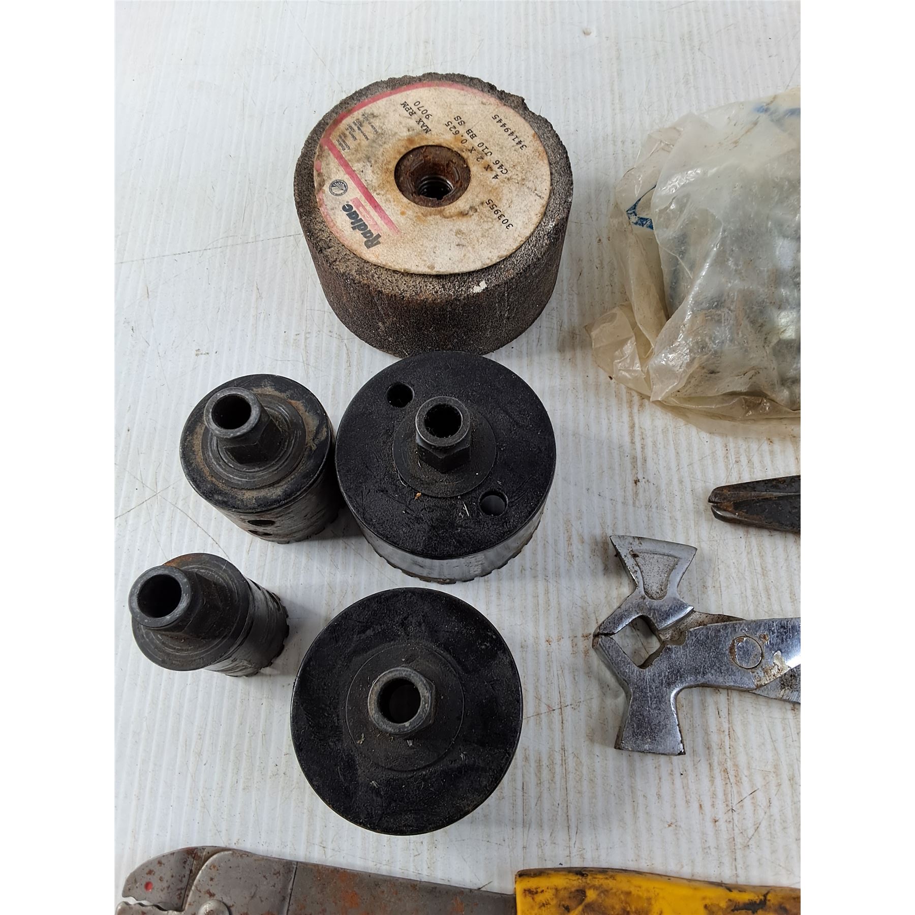 Frinding Stones, hole saws, fshears, pliers,5"lag bolts and a tolerance guage.