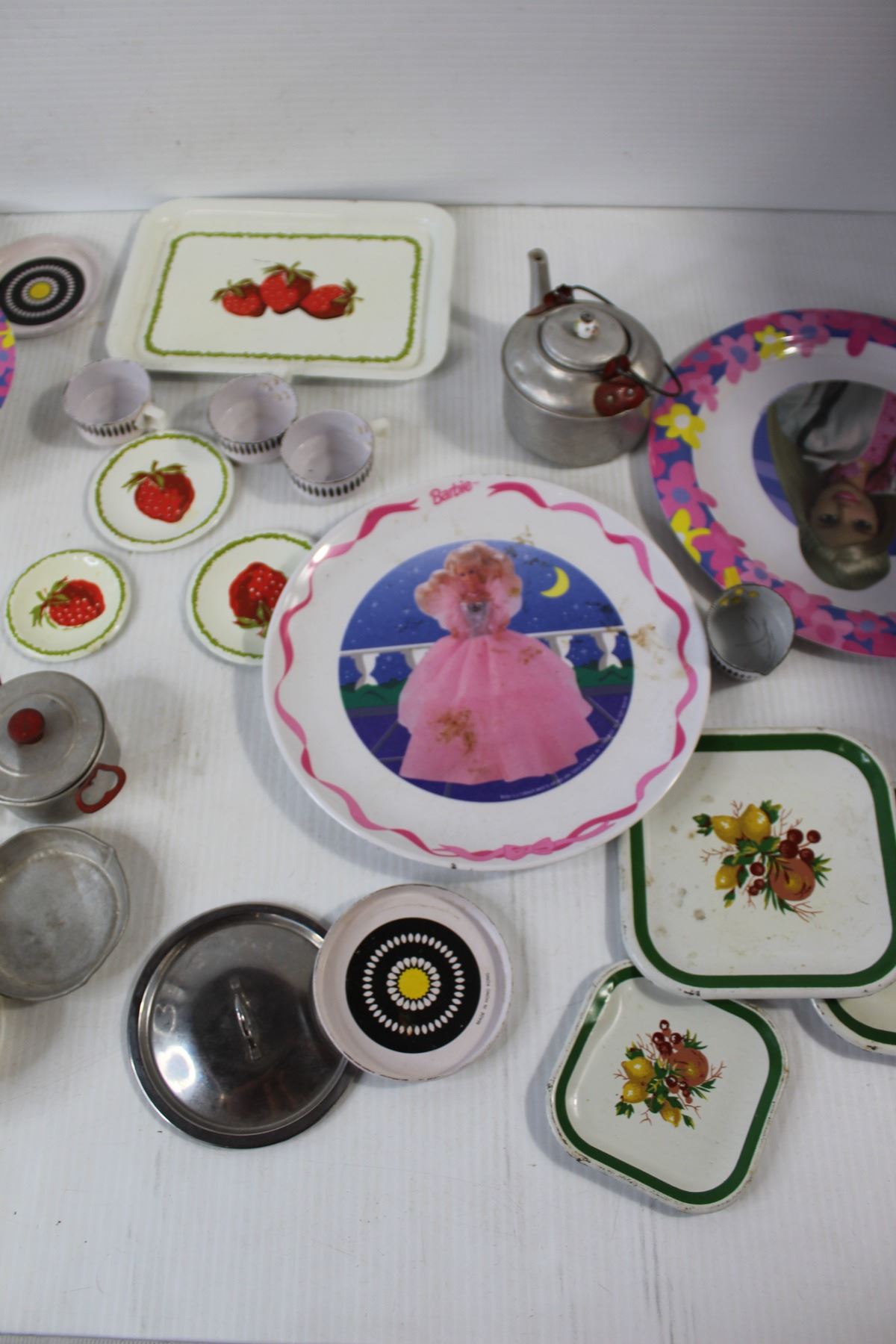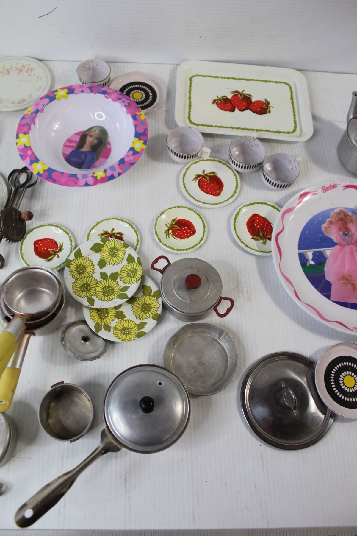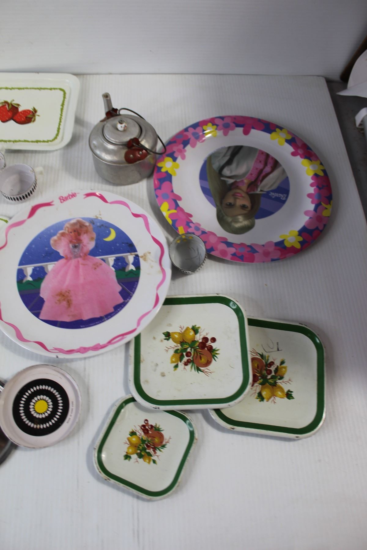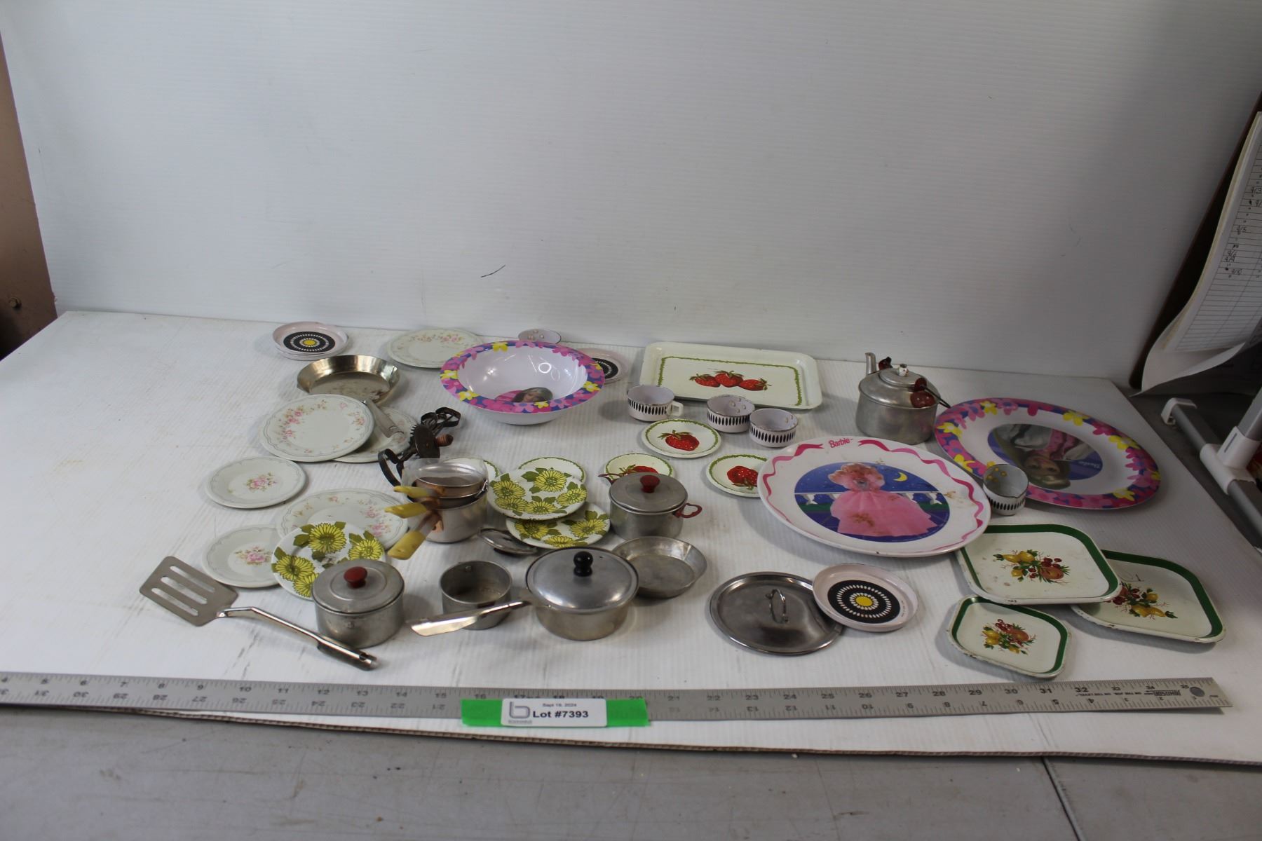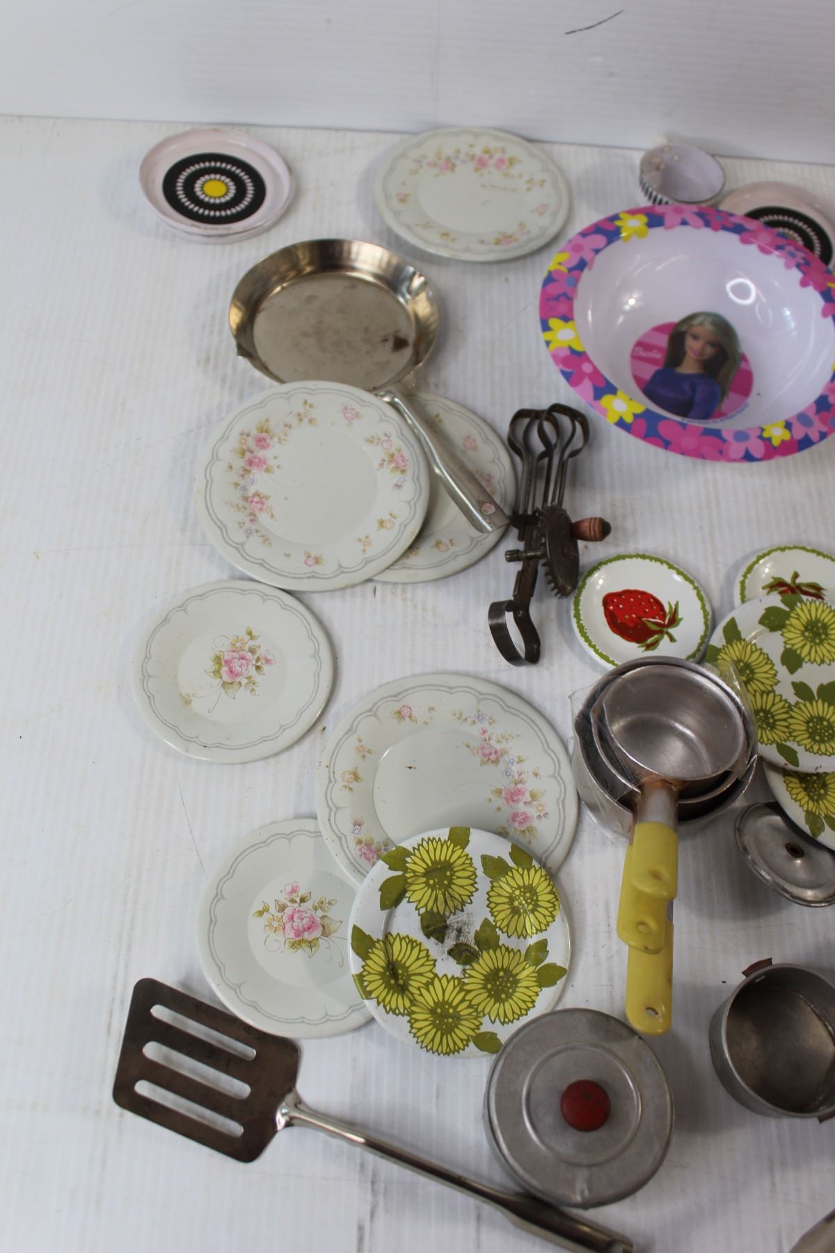Assorted Toy Kitchen Ware - Cups, Plates, Pots, etc. (2) Barbie Plates, Barbie Bowl