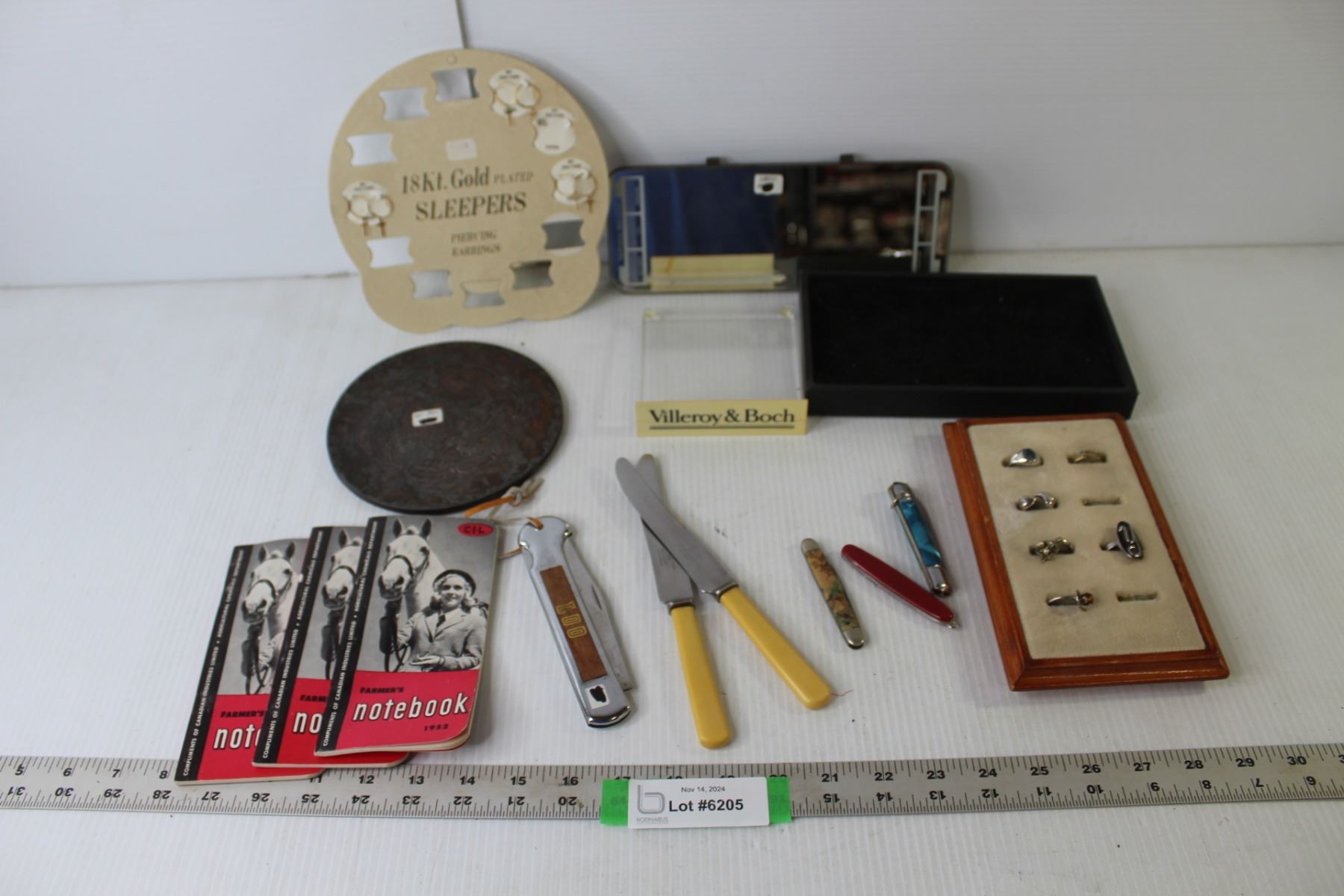 Assorted Vintage/Antique Items (Jewelry, Pocket Knives, Jewelry Storage, Hot Plate, Drivers Mirror,