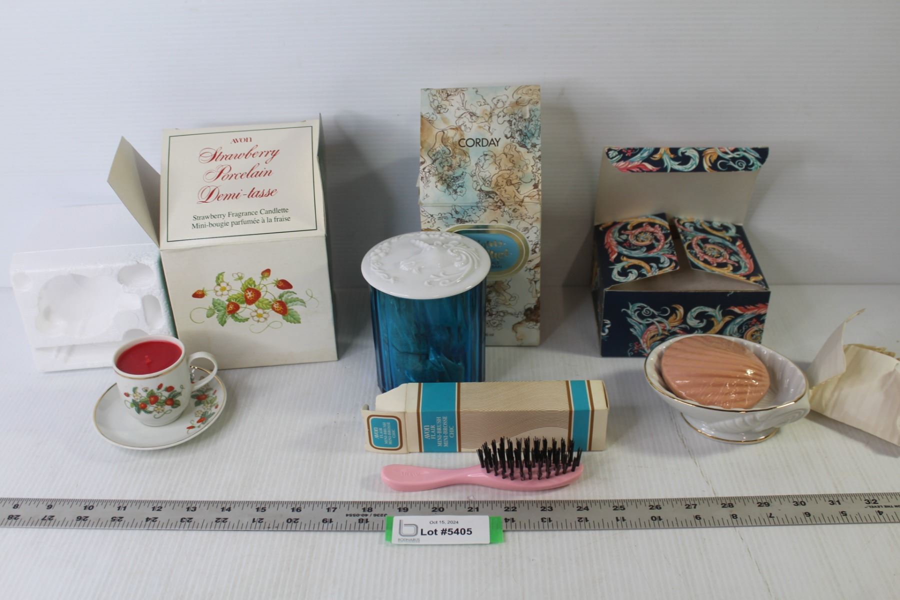 Avon - Glass Jar of Bath Salts w/Ceramic Unicorn Lid - Ceramic Soap Dish W/Soap - Small Brush - Cup & Saucer Candle