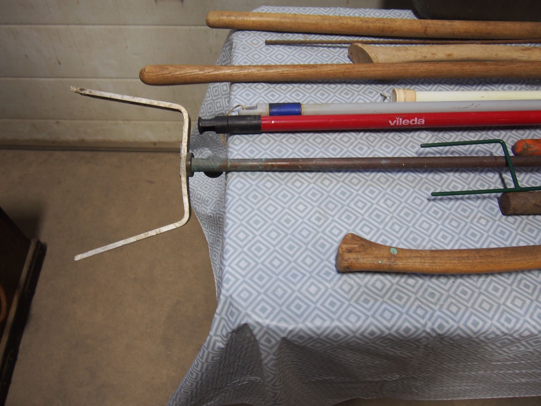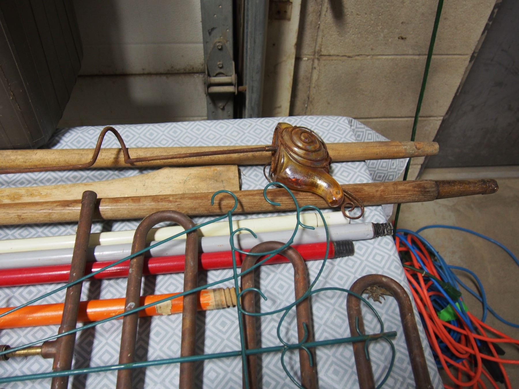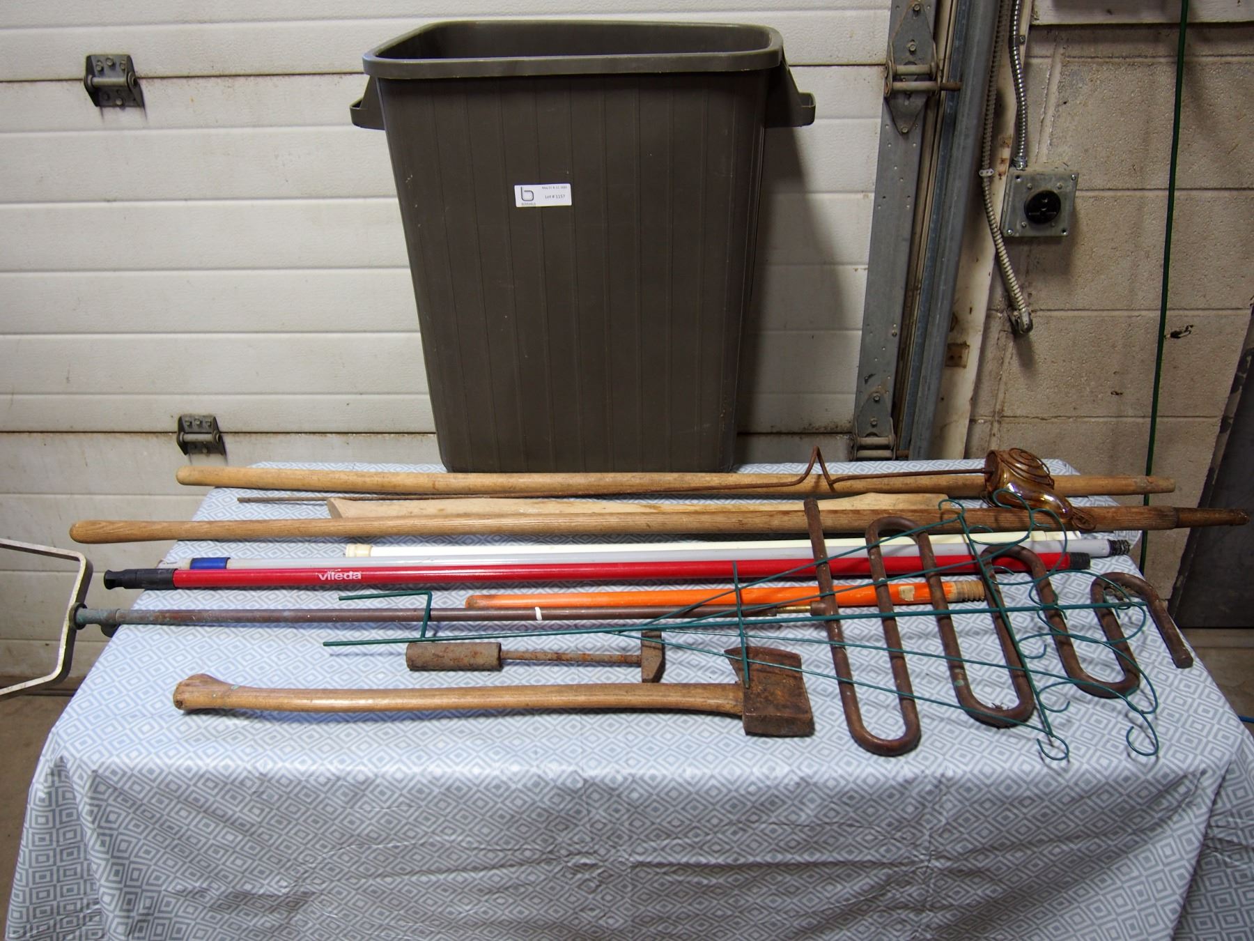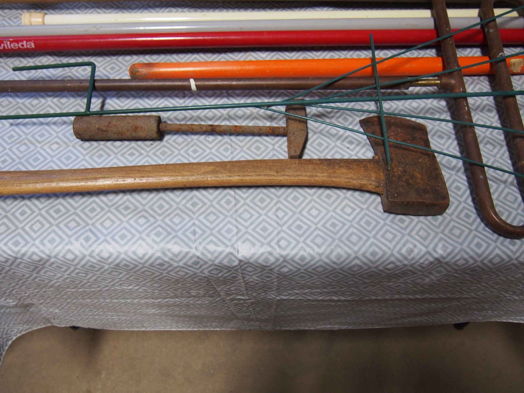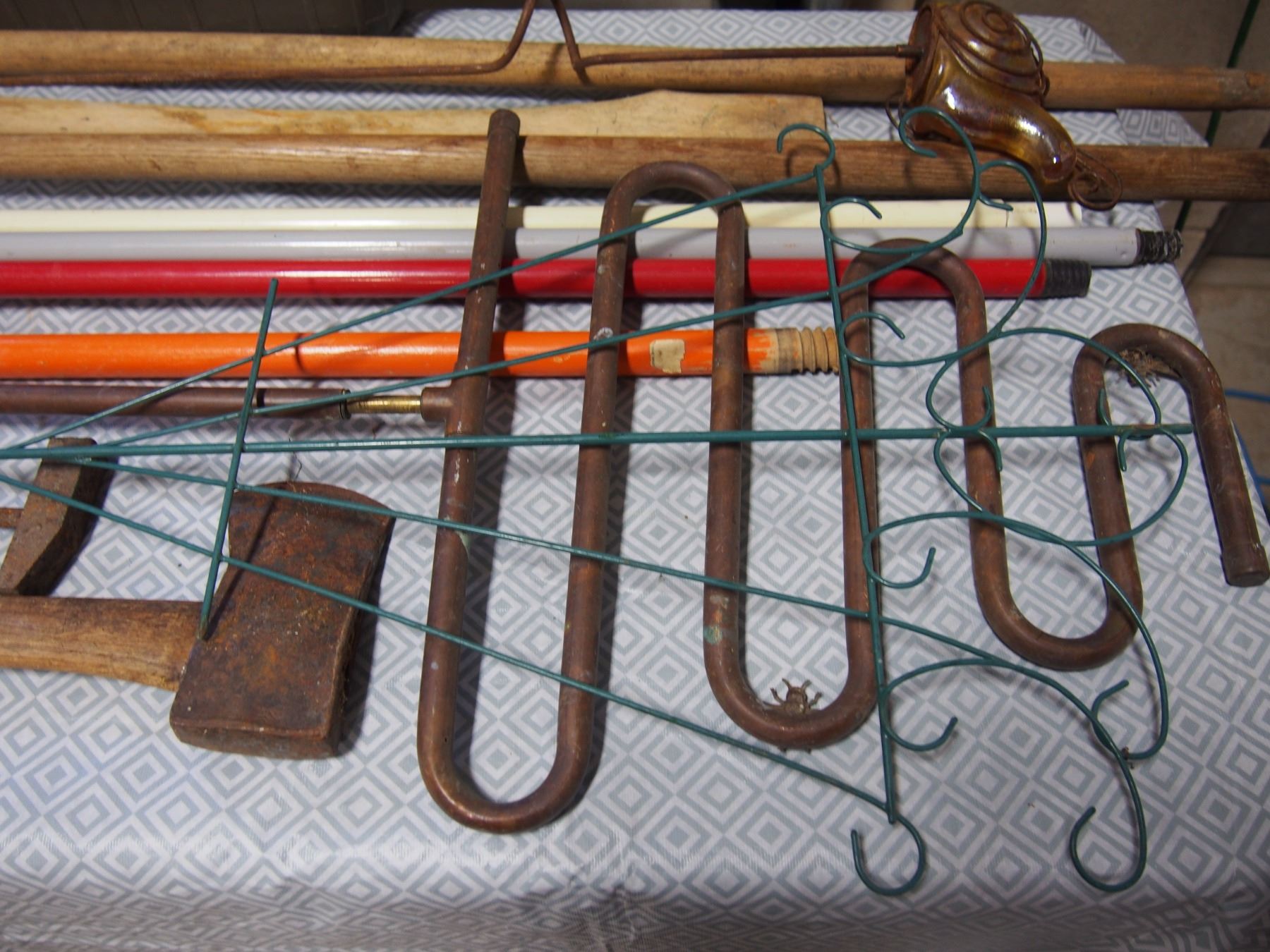Axe,Various Handles,Copper Sprinkler Set up,Garbage Can Etc