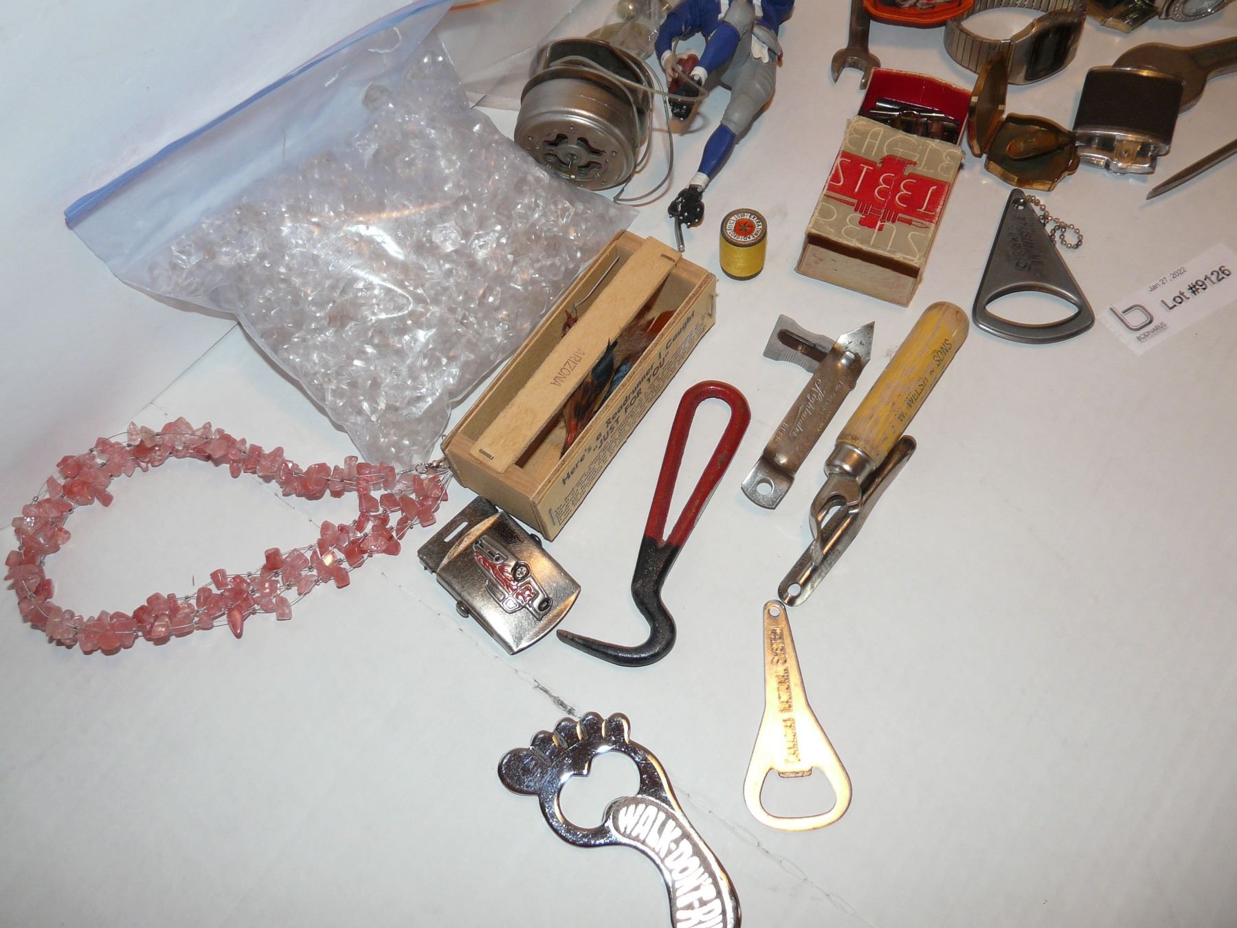 Box of Vintage Miscellaneous - Bottle Openers, Portable Clothes Line, Dream Catcher, Pen Nibs, Scale, Crafting Items, Tools