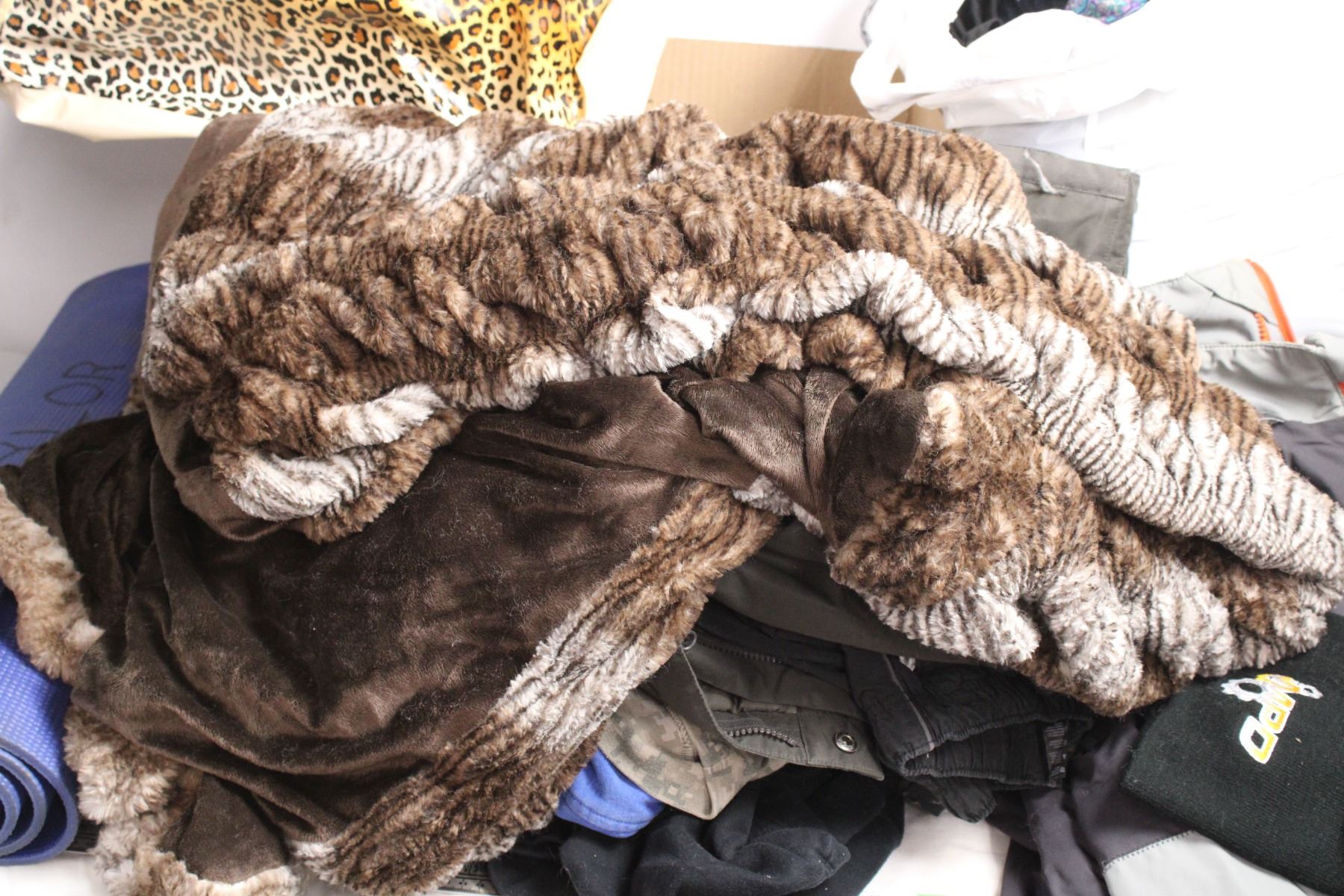 Bag of kids clothes, Box of coathangers, fuzzy blanket, kids winter clothes