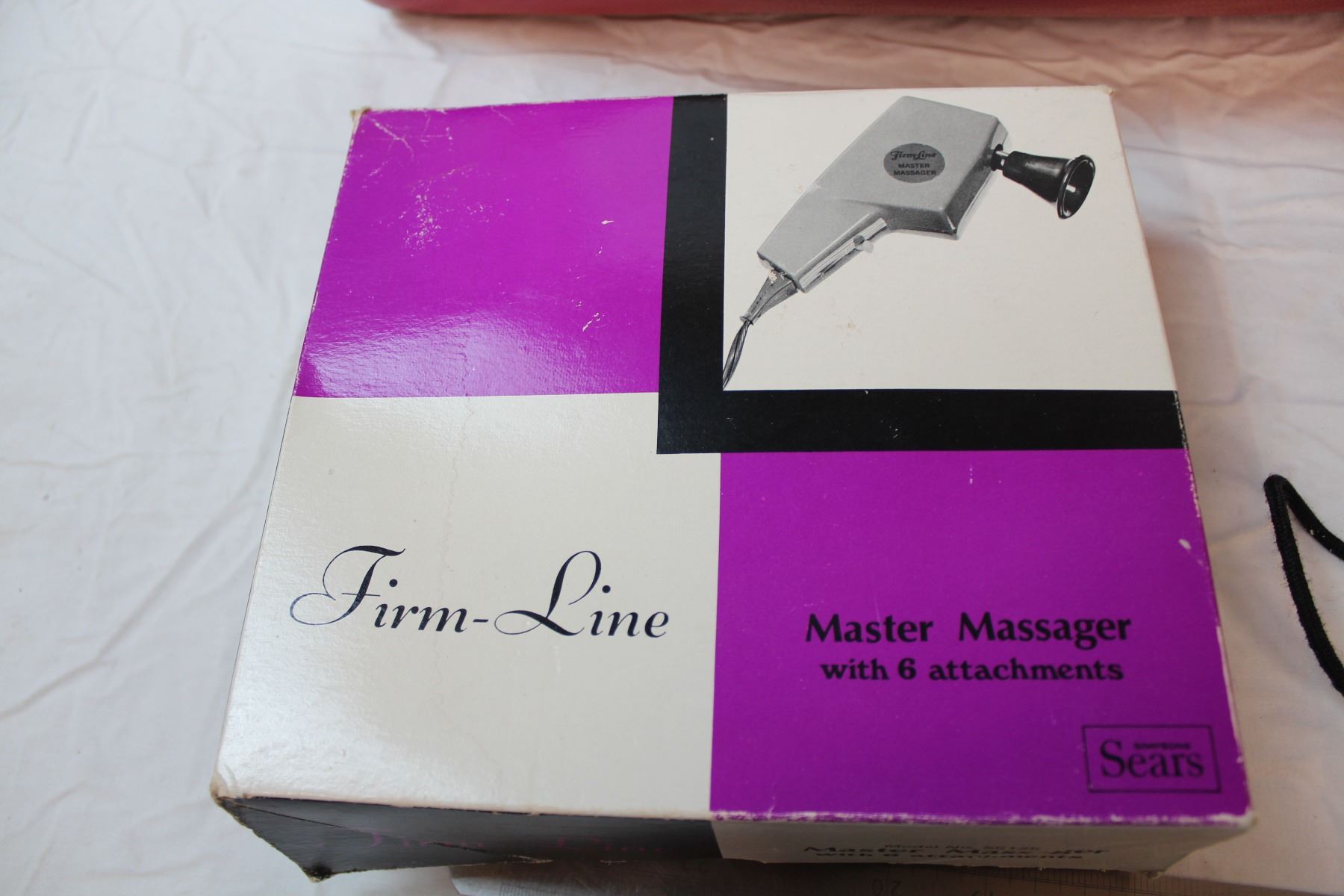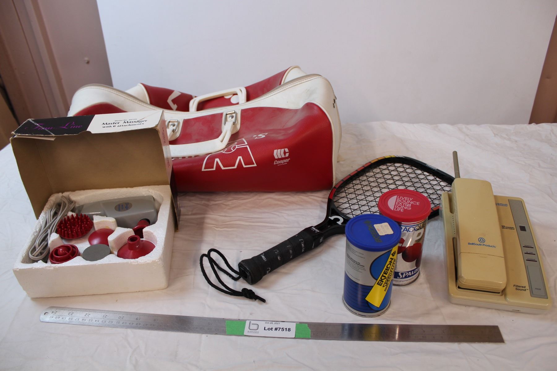 Ball duffle bag, sears firm-line master massager, Racquet + racquet balls, cordless phone