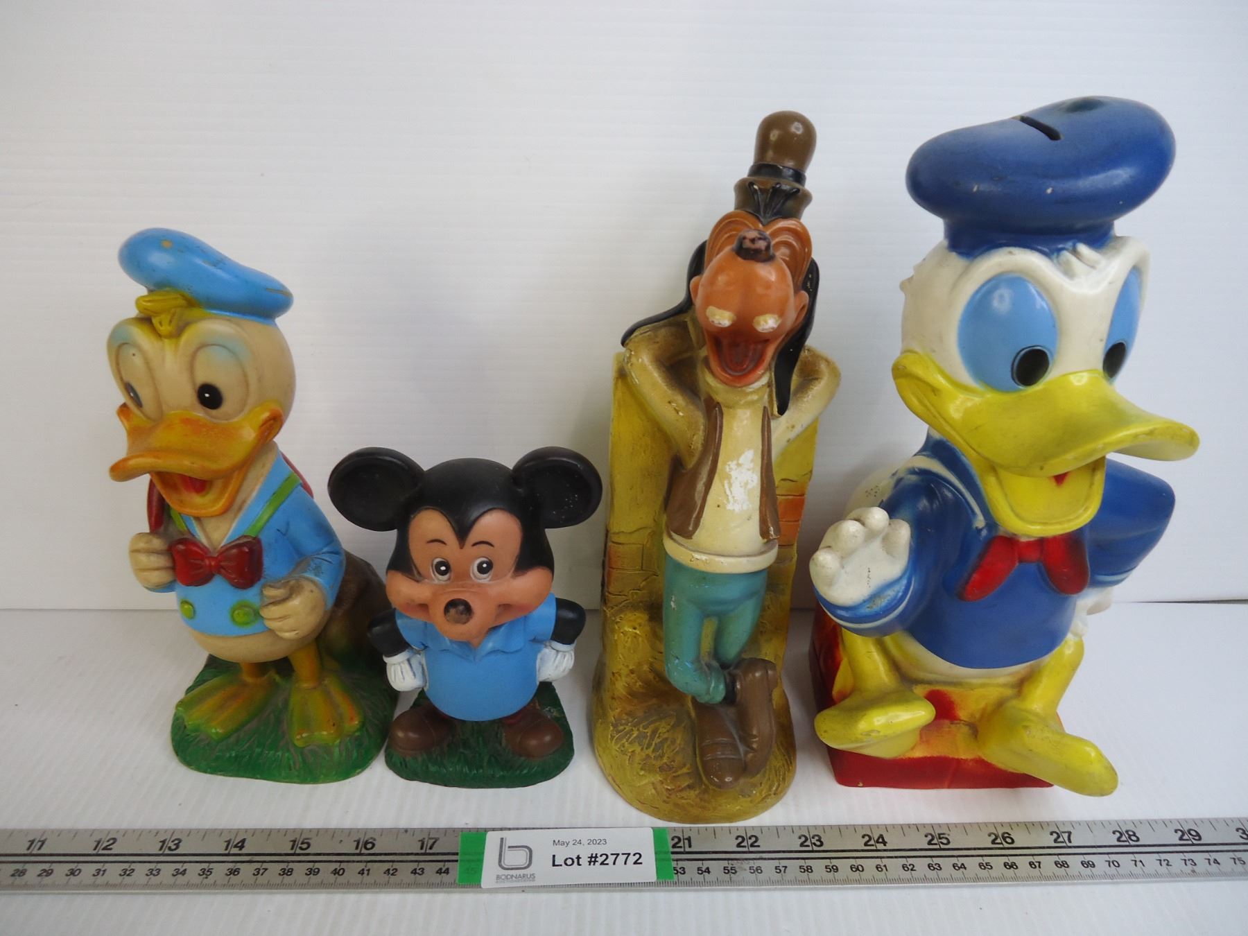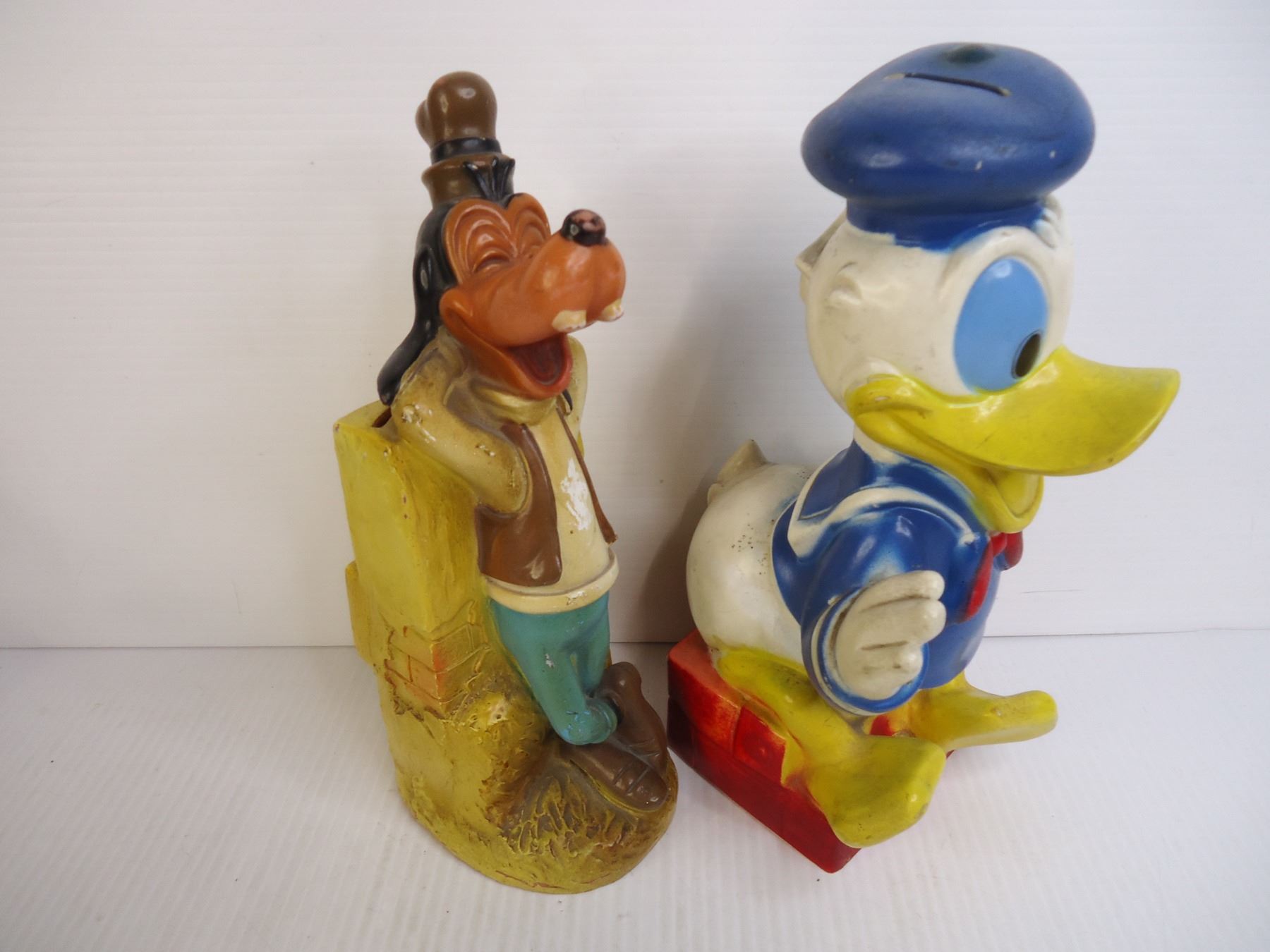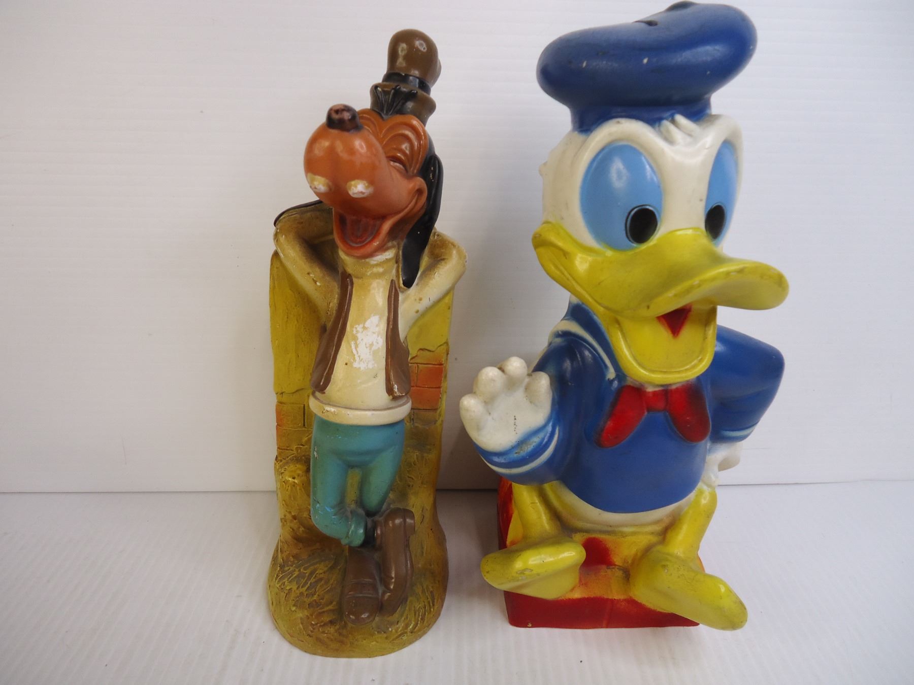 Banamex bank(Mexico) rare Donald Duck(no stopper) and Goofy(with stopper) plastic money bank, Playpal Donald Duck and vintage Mickey Mouse squeeze toy