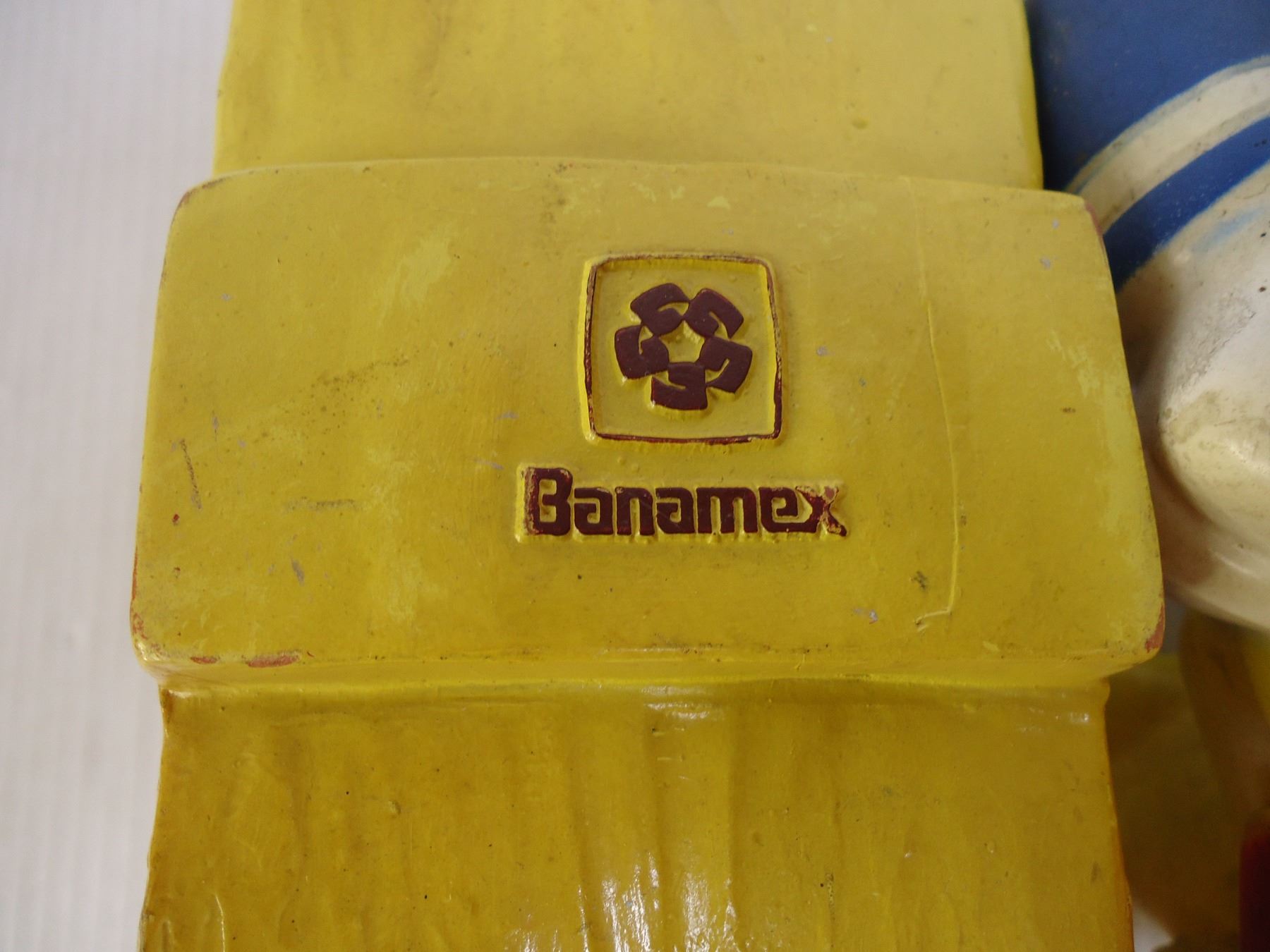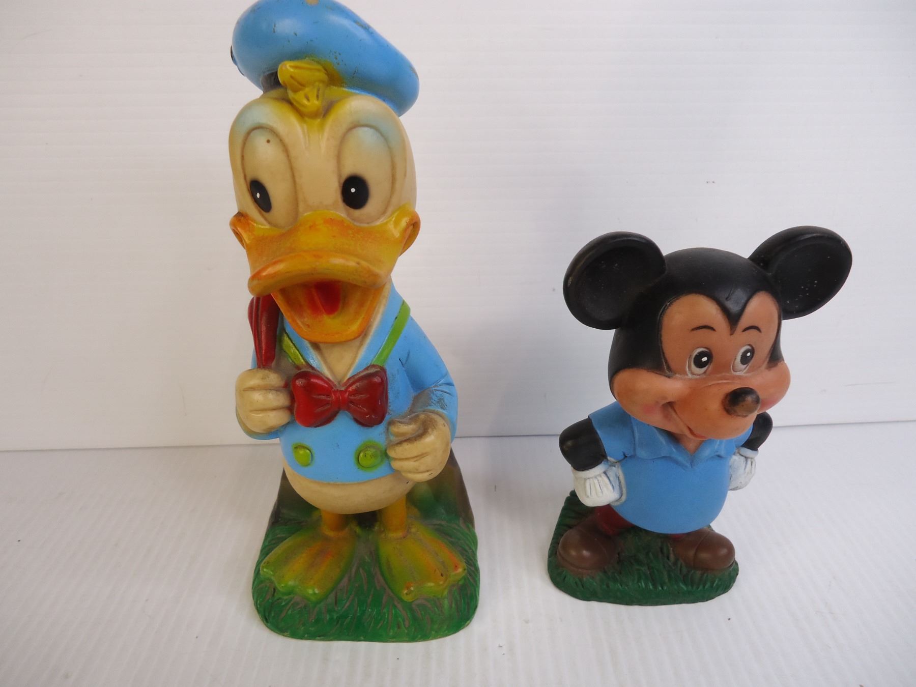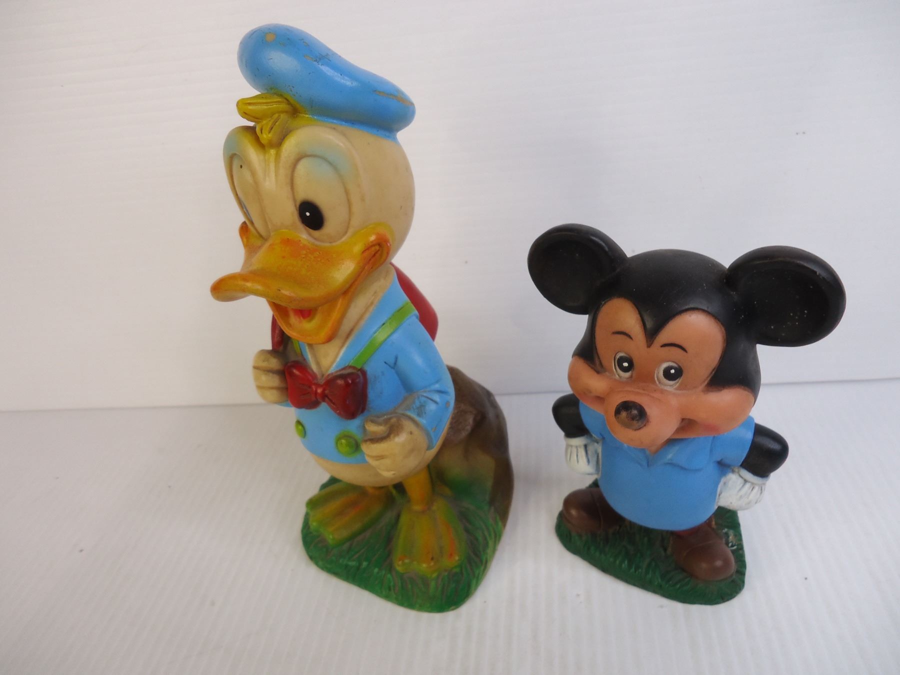 Banamex bank(Mexico) rare Donald Duck(no stopper) and Goofy(with stopper) plastic money bank, Playpal Donald Duck and vintage Mickey Mouse squeeze toy