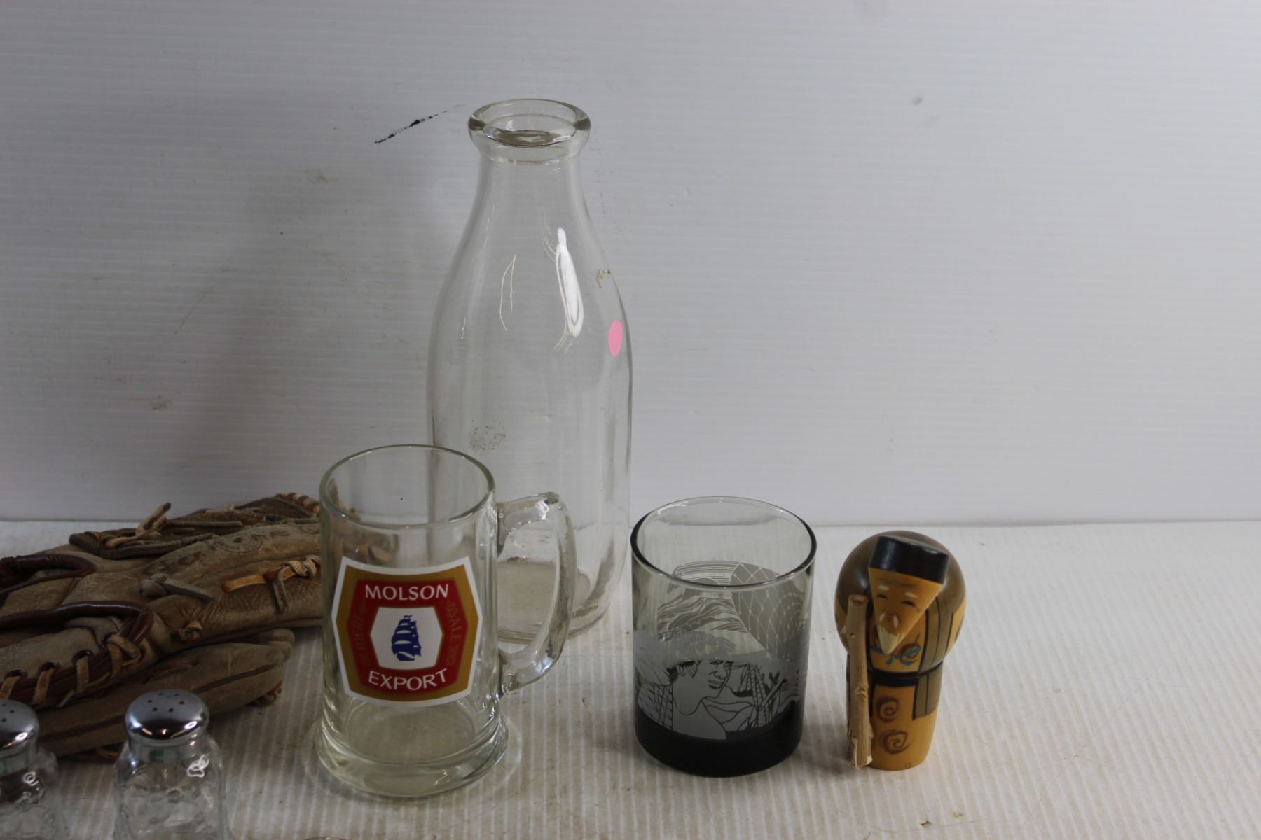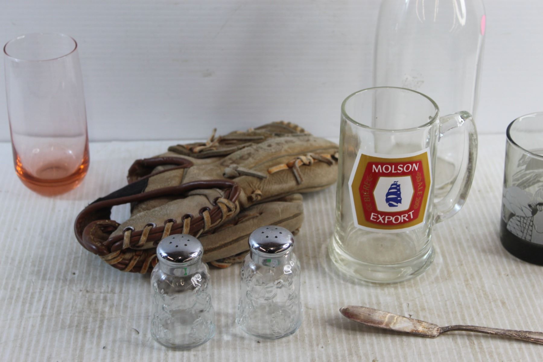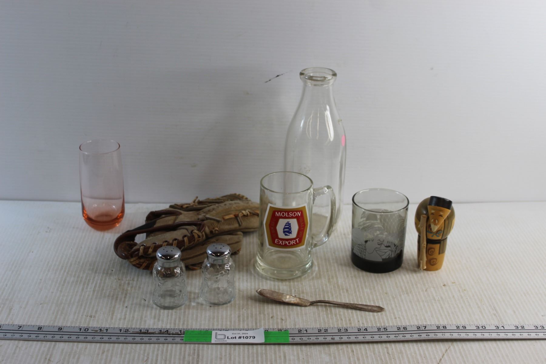 Baseball Glove, Vintage Milk Bottle, Silver Butter Knife, Salt & Pepper Shakers, Mug and Assorted Items