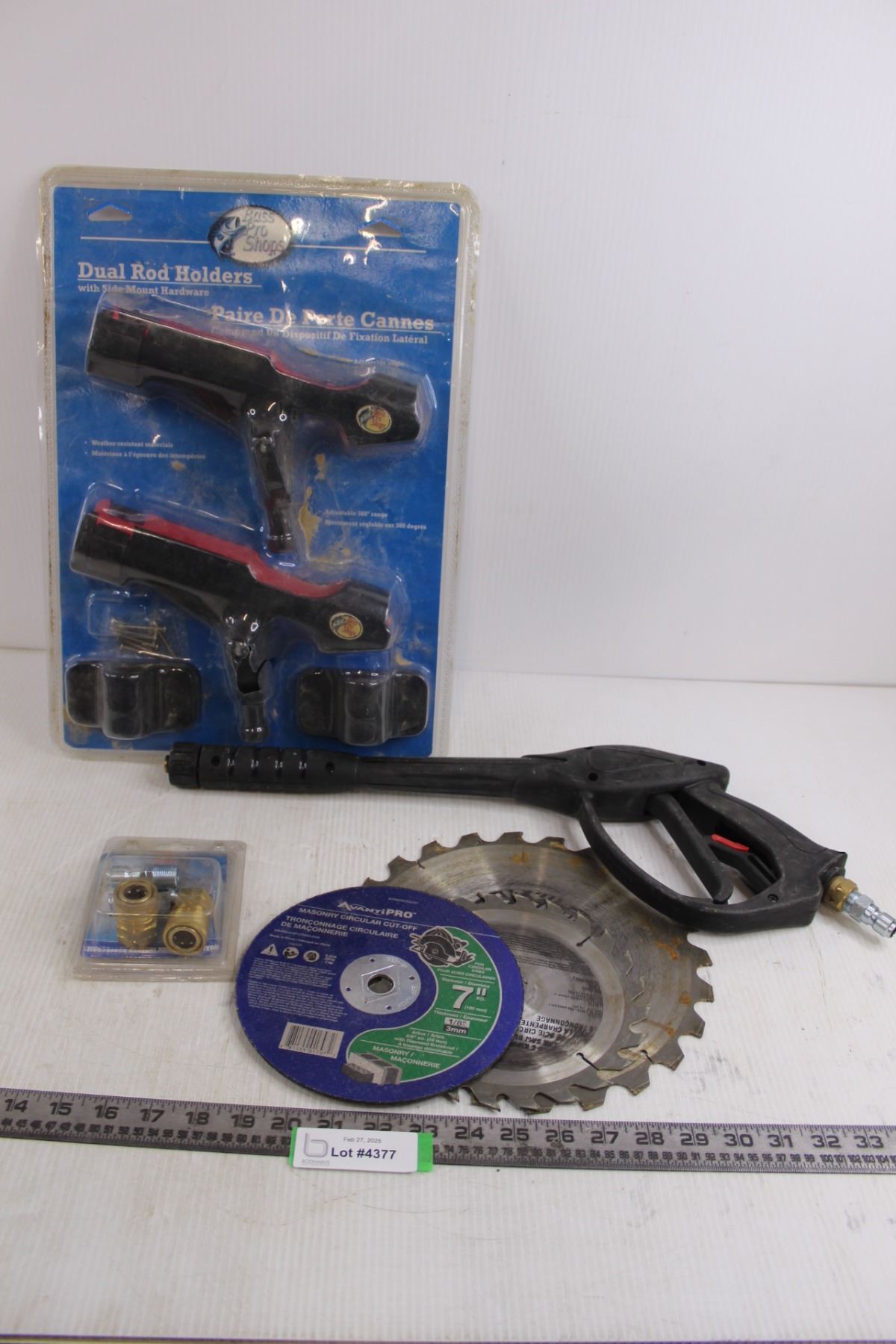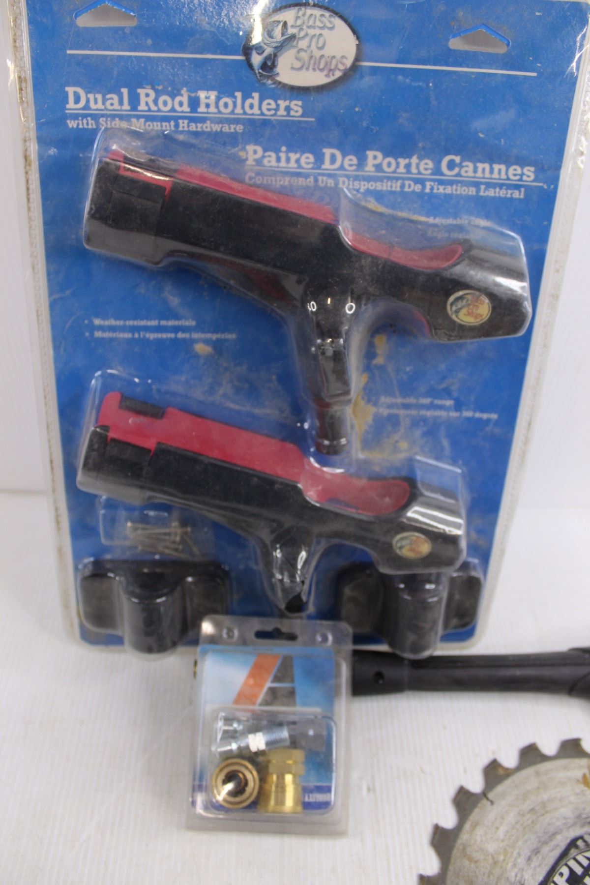 Bass Pro Shops Dual Rod Holders (NIB but cracked), (3) Saw Blades (7" & 10"), Pressure Washer Gun & Fittings