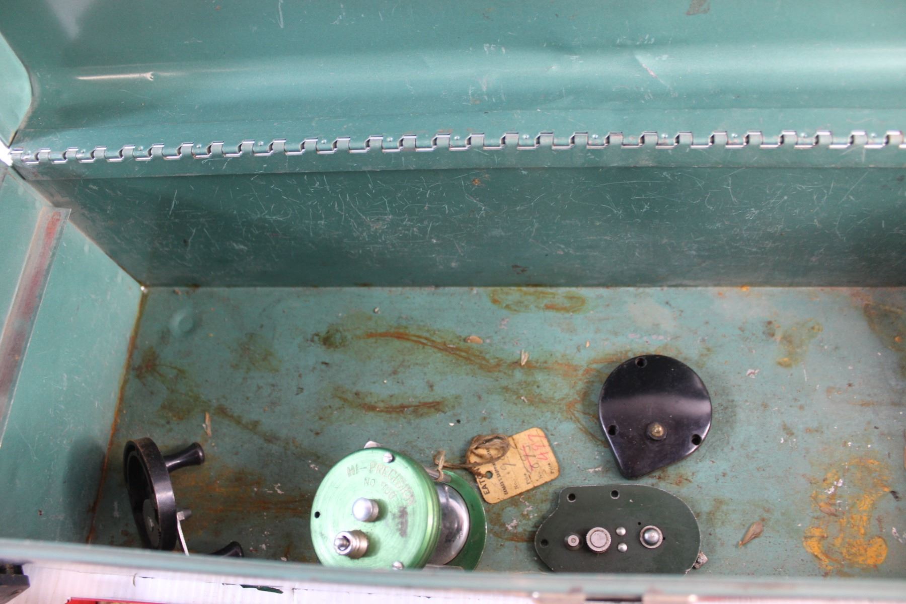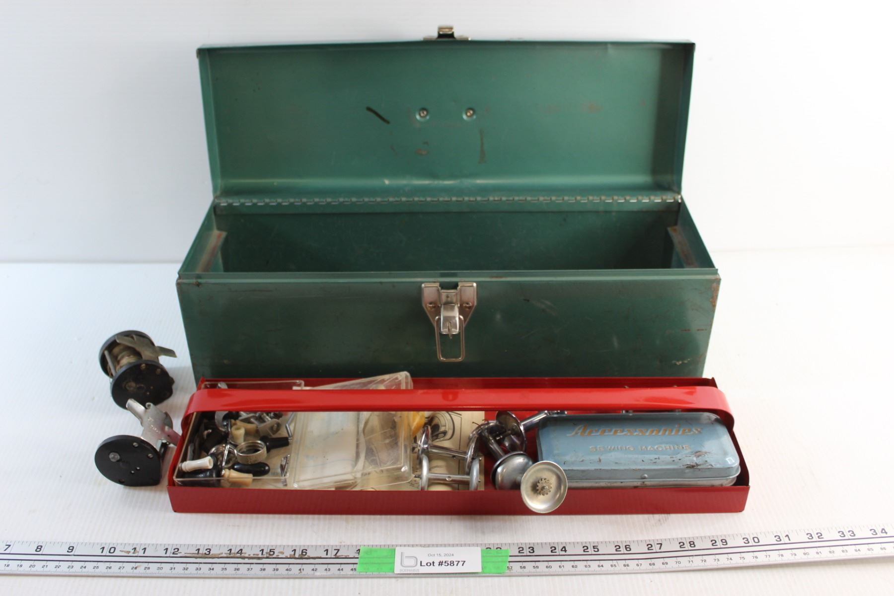Beach Metal Tool Box, Vintage Fishing Reels and Sewing Accessories