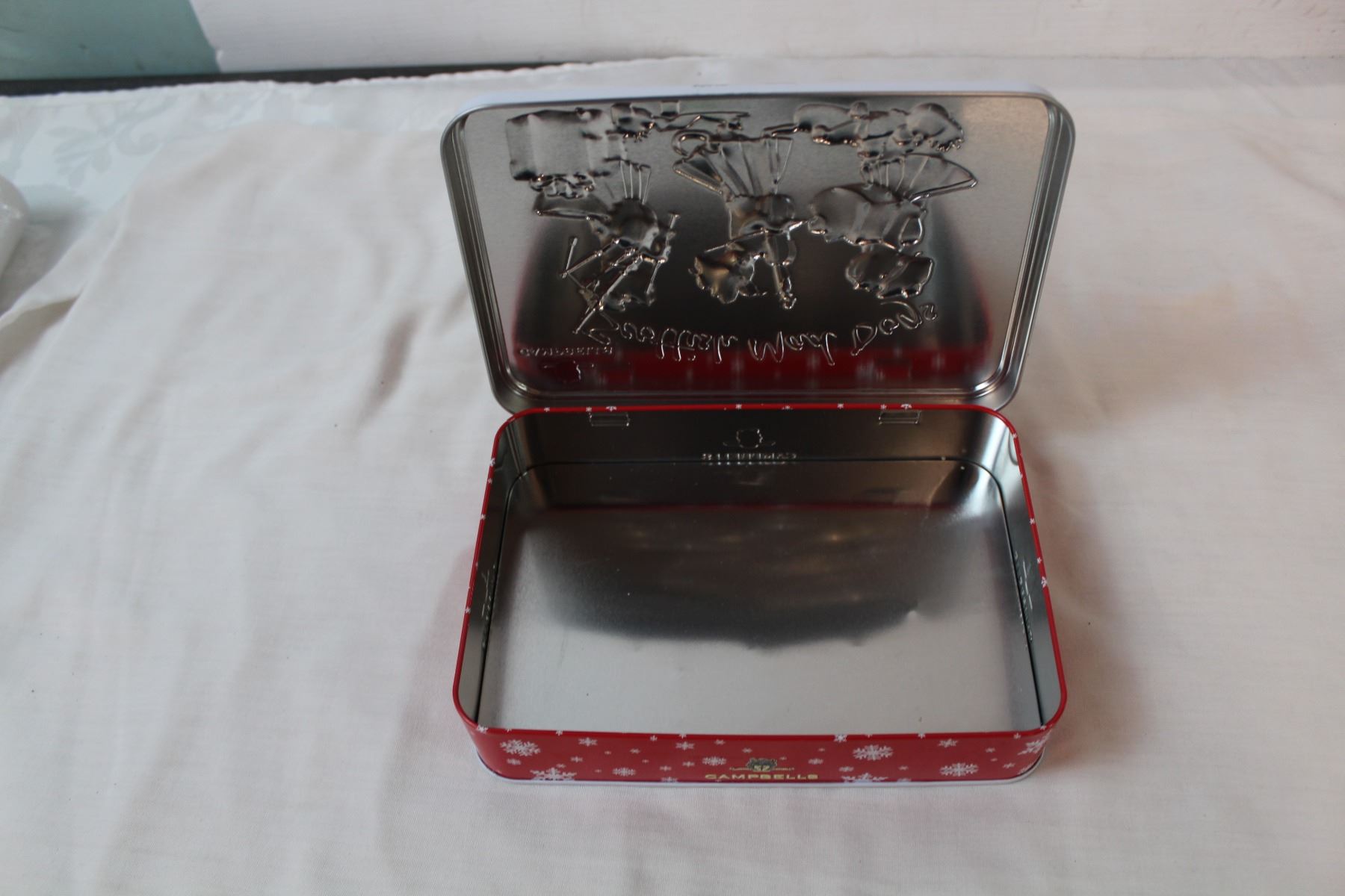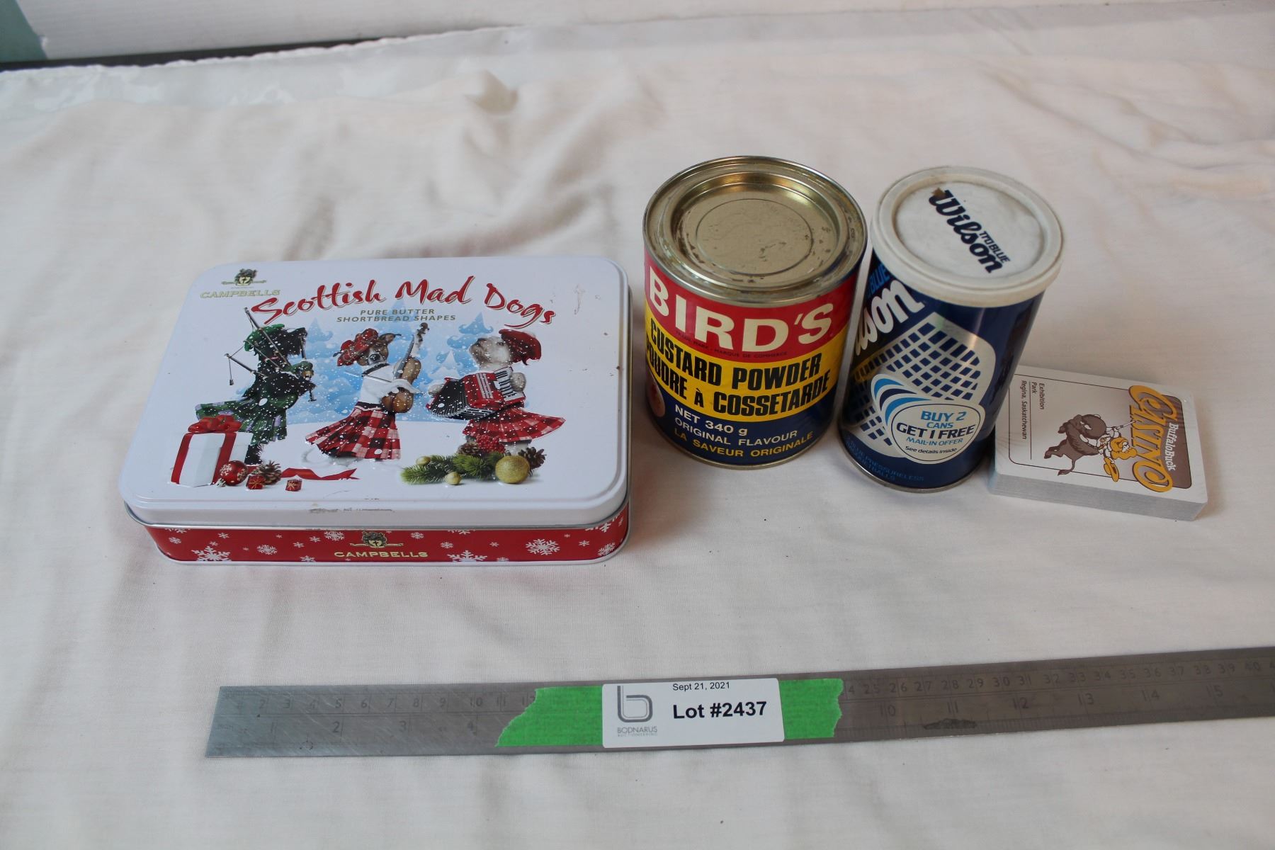 Birds custard container (1/4 full) + Scottish mad dogs tin, with racquetball + casino cards