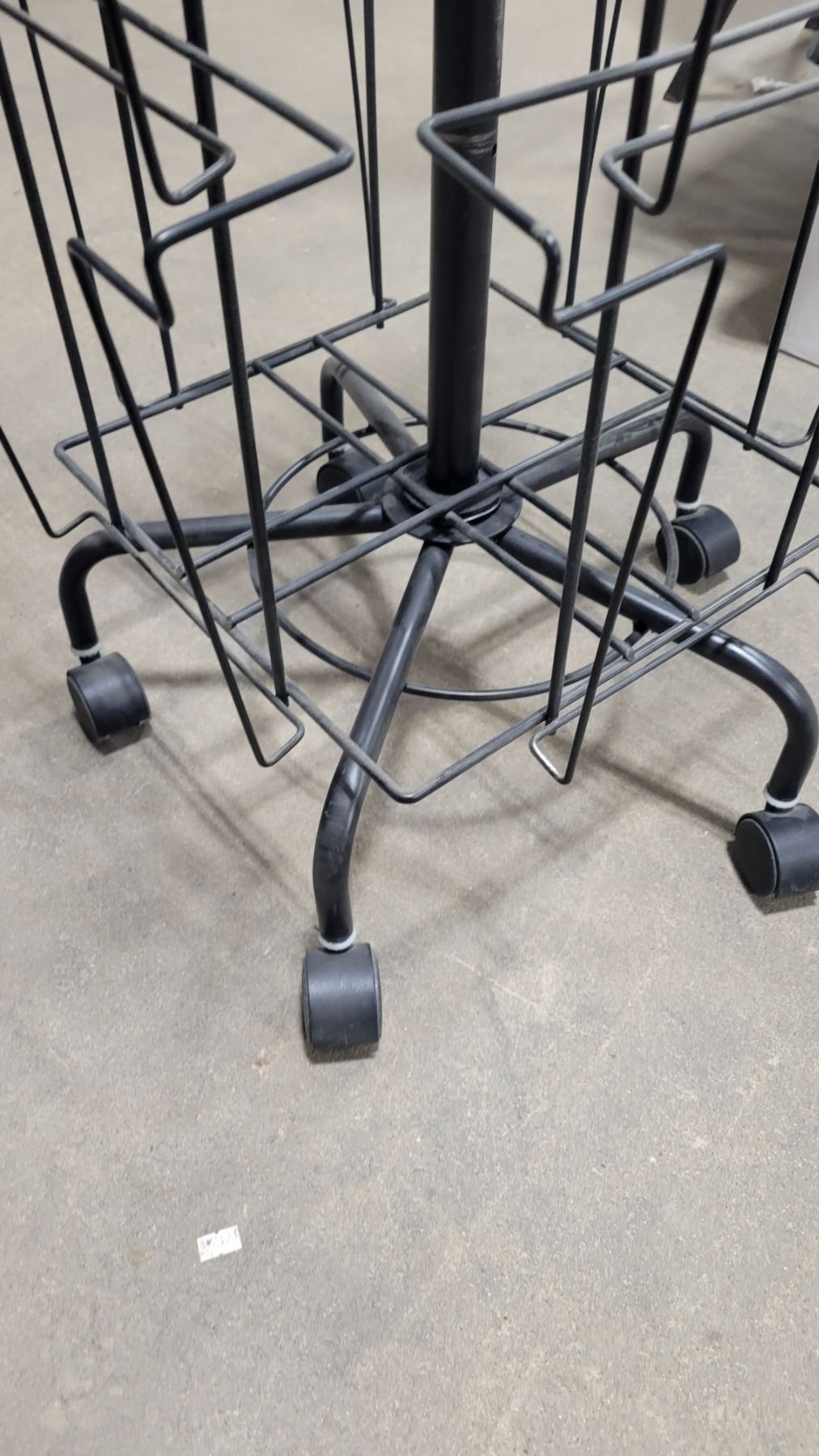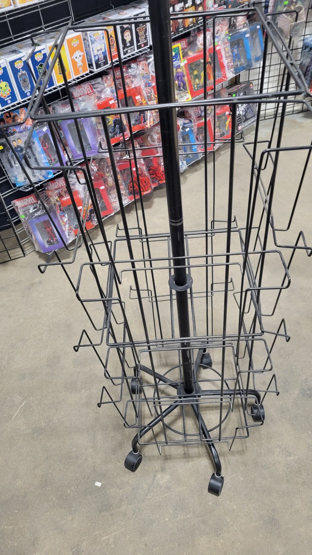 Black 4 Sided Spinning Rack on Wheels- 4-sided retail rack, large openings for books or frames, has wheels and topper.
