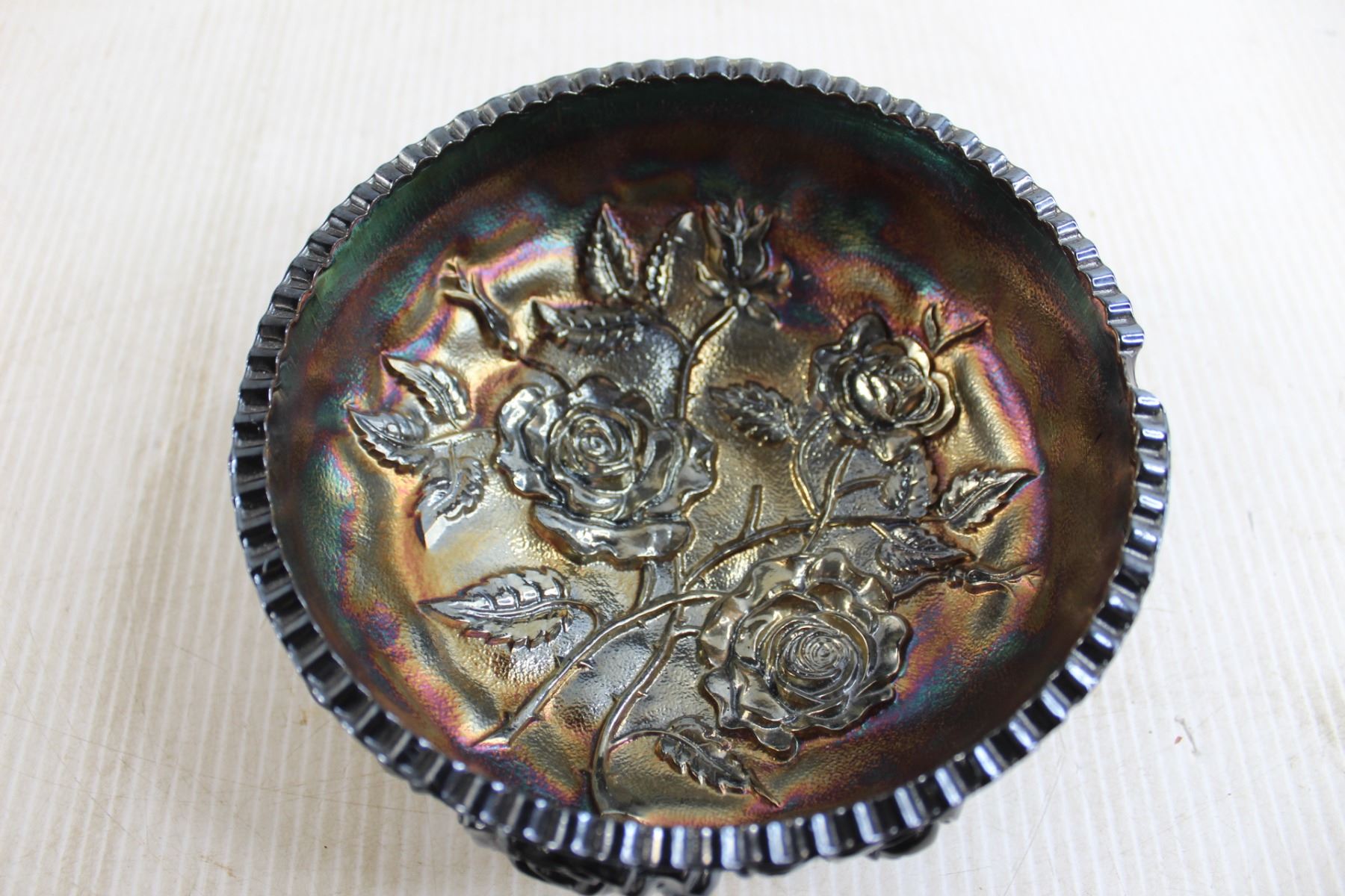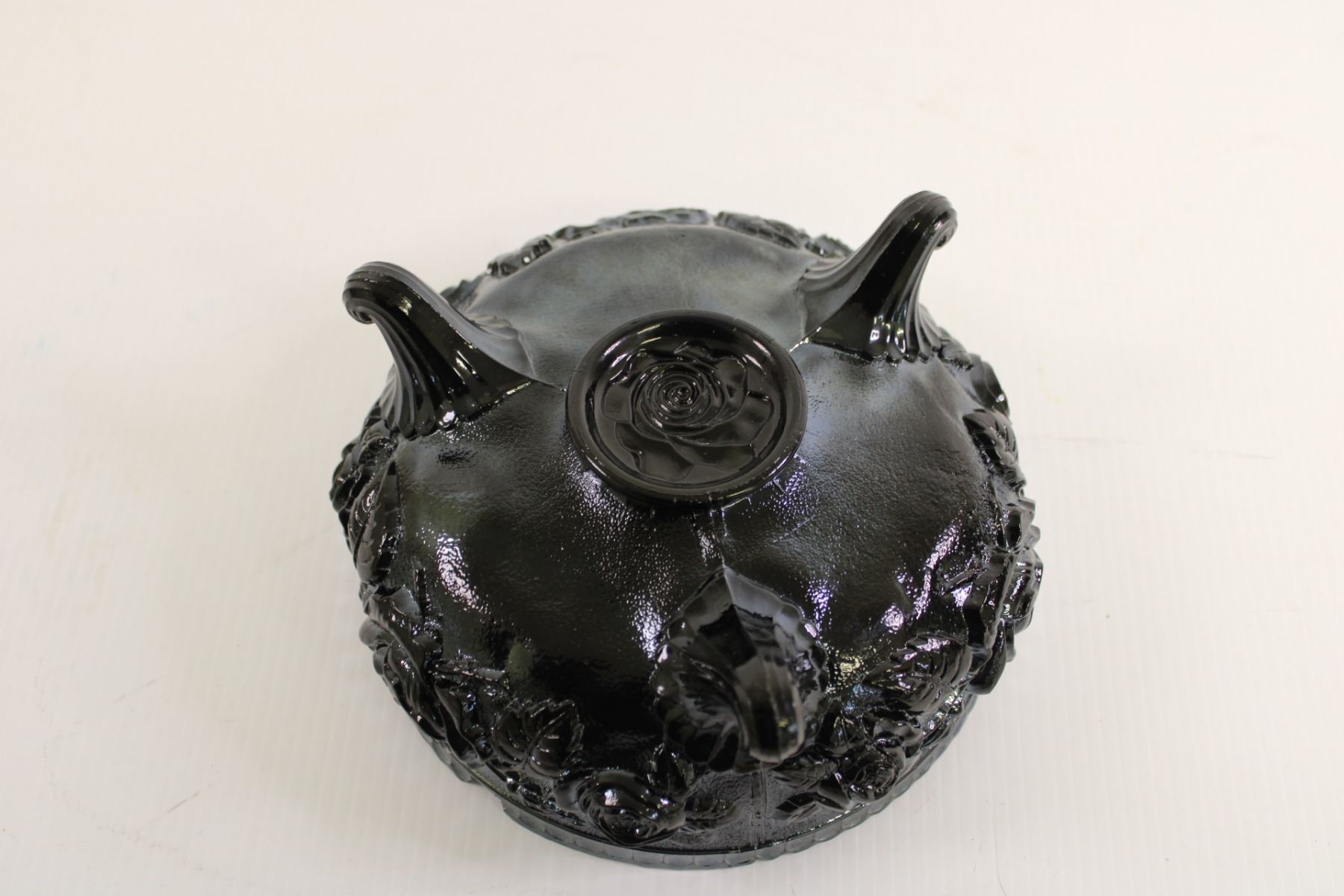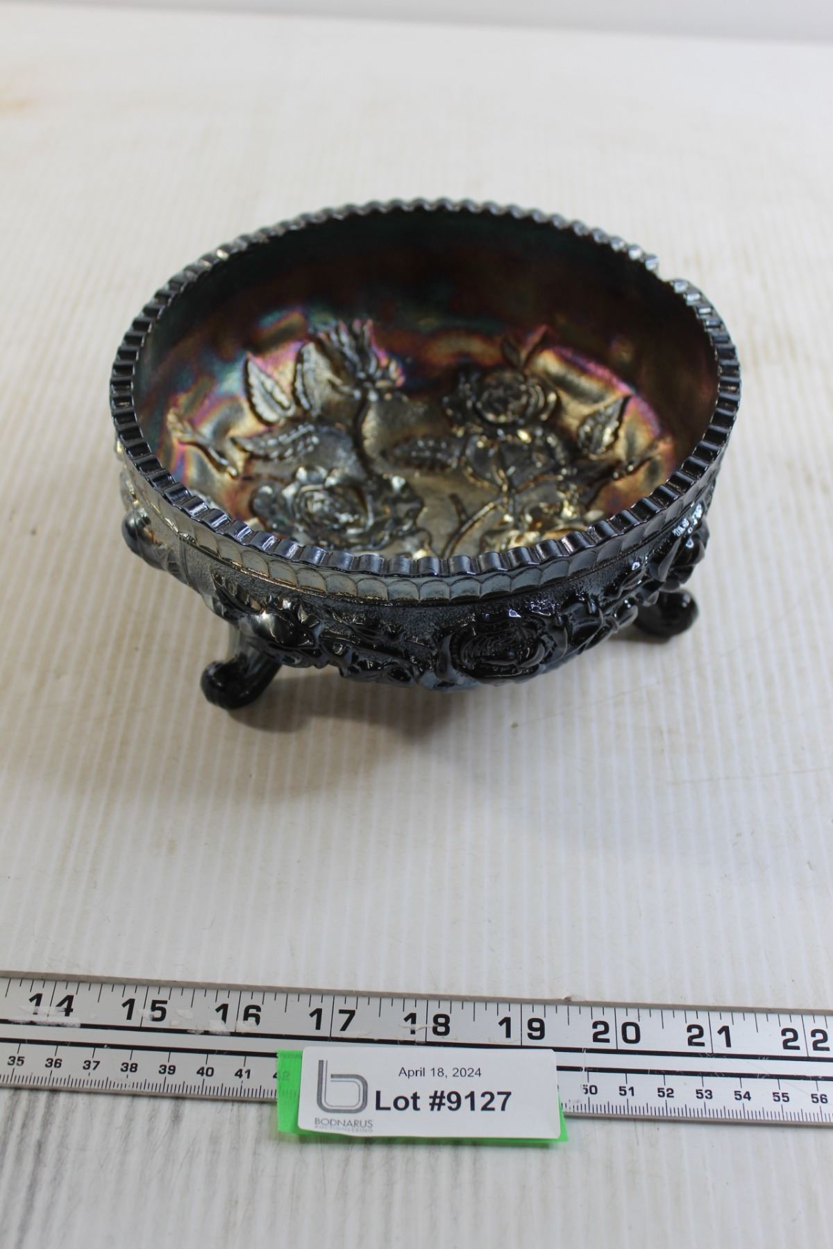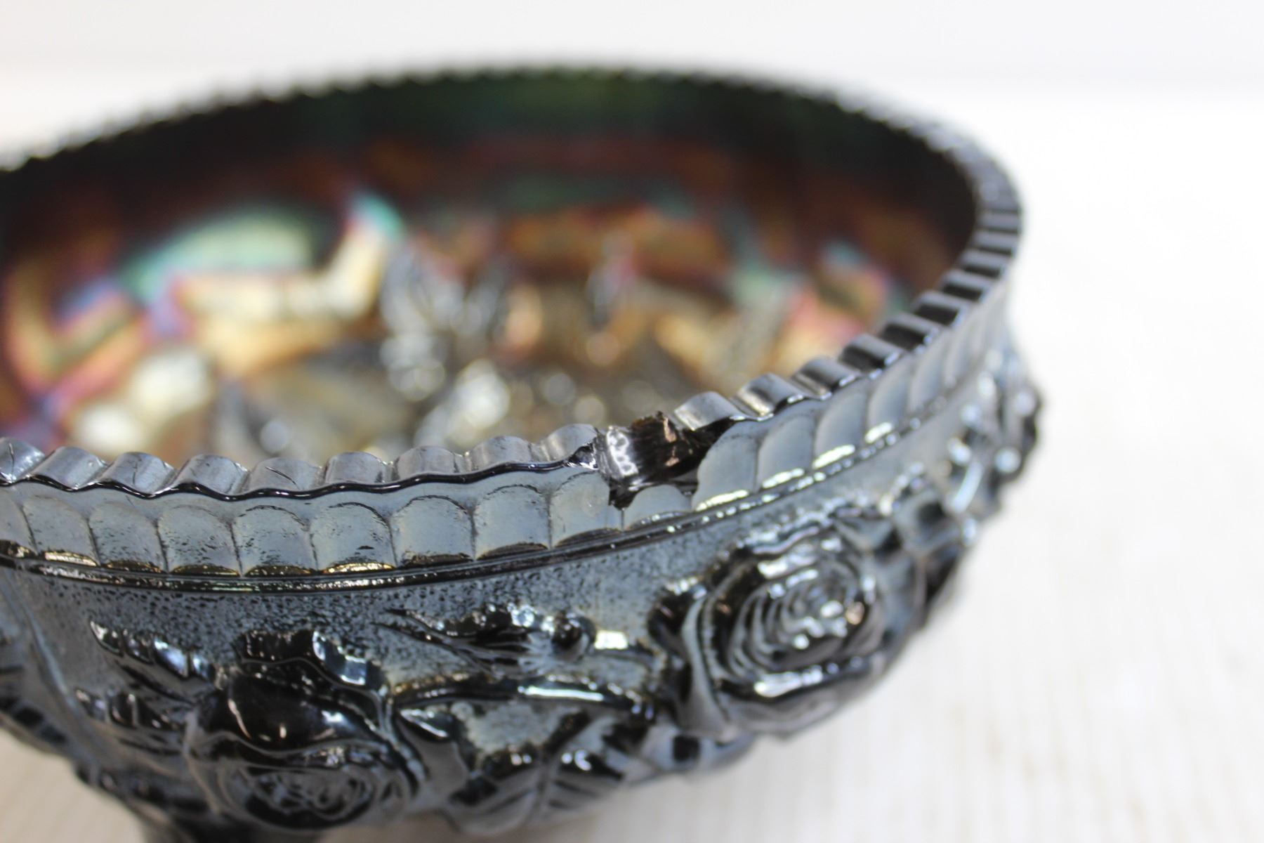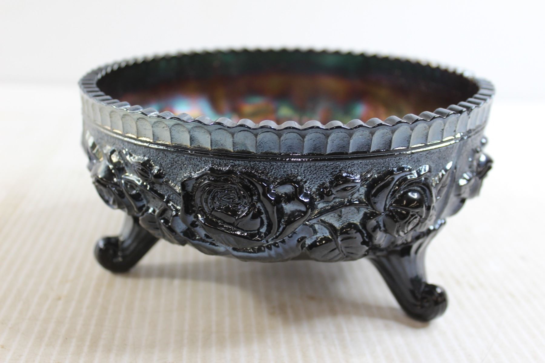 Black Amethyst Imperial Carnival Glass Footed Bowl Fernery - 7 1/2" Wide, Has Chip