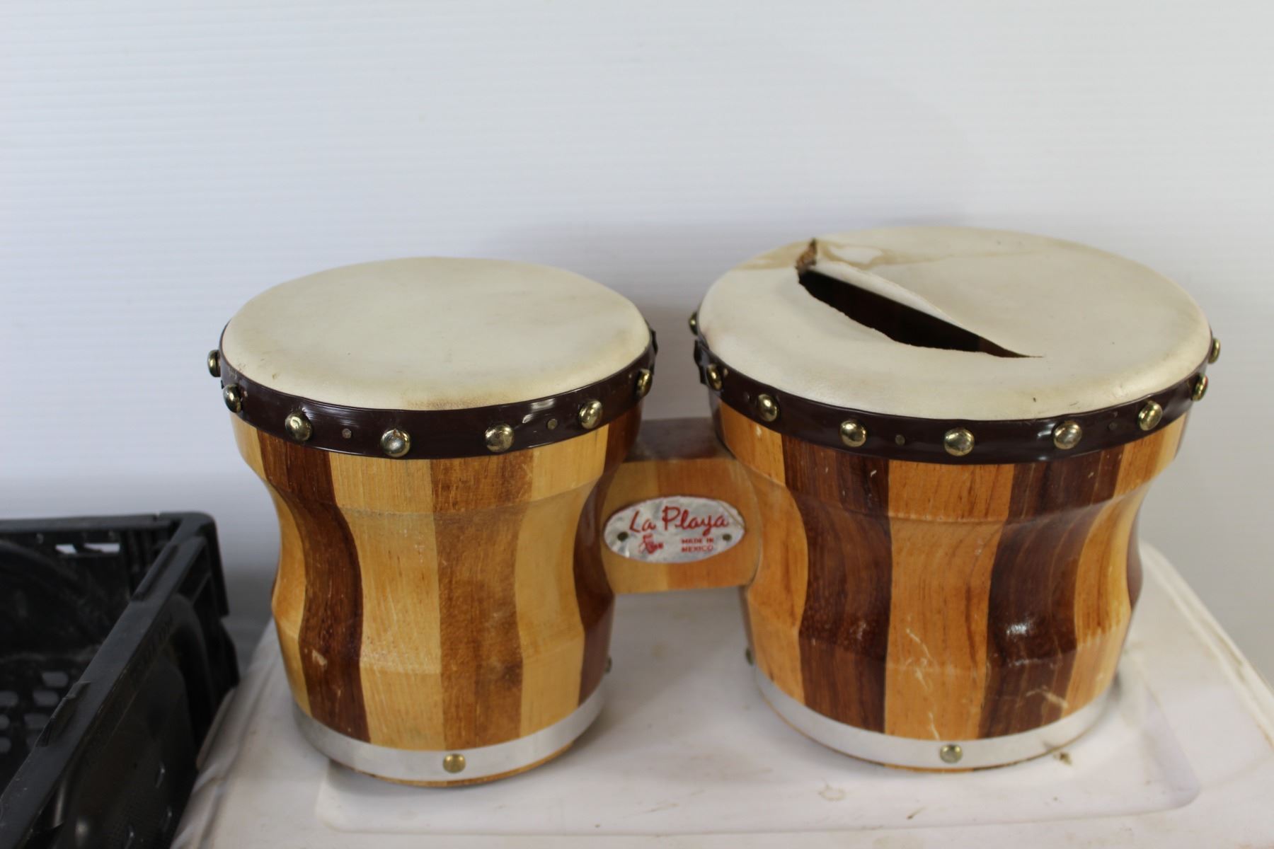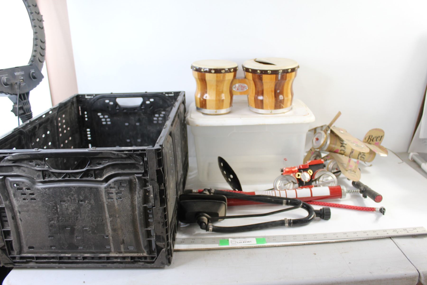 Black Crate, Bongos - One with a big crack, Ice Fishing Scoop, Plane and Bike Made out Of Cans, Pump, Plastic Tub