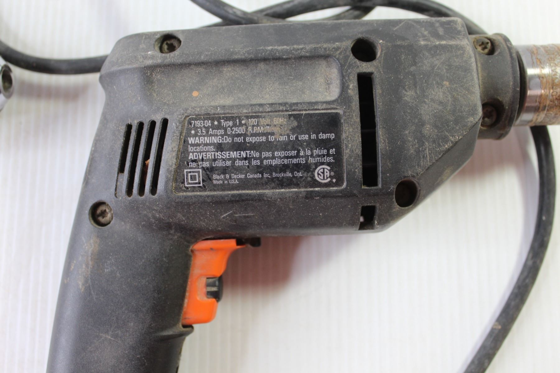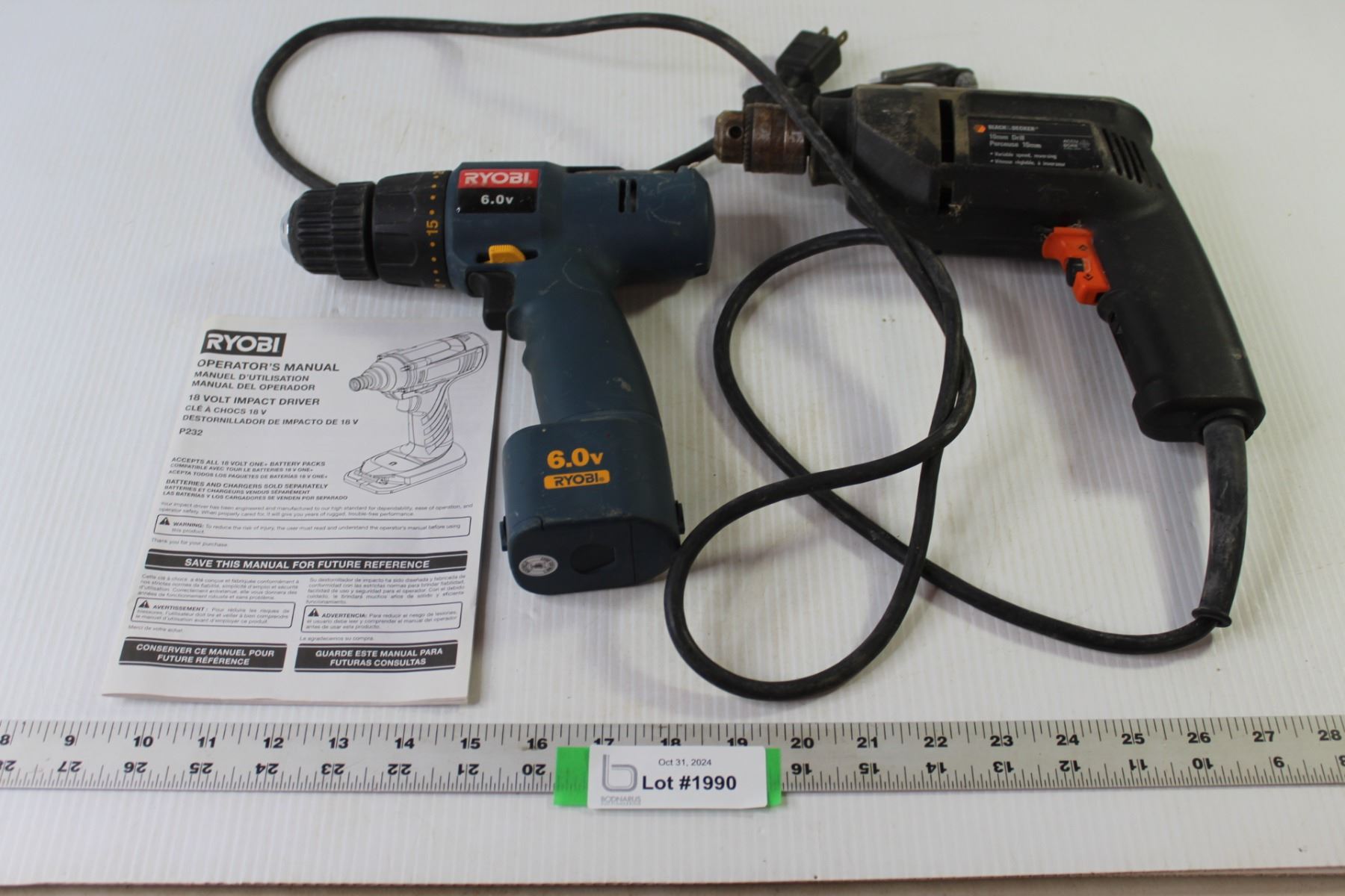 Black & Decker 10mm Variable Speed Drill (Operational), Ryobi Rechargeable Cordless Drill (No Adaptor, Batteries Are Dead - French Manual)