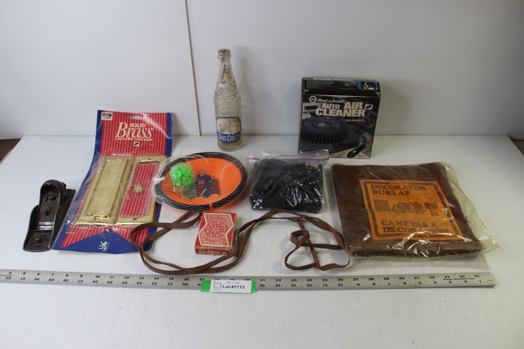 Black & Decker Auto Air Cleaner (NIB), Decorator Burlap (NIB), Intersel Solid Brass Mail Slots (NIB), Vintage Stanley Wood Planer, Assorted Games, Misc.