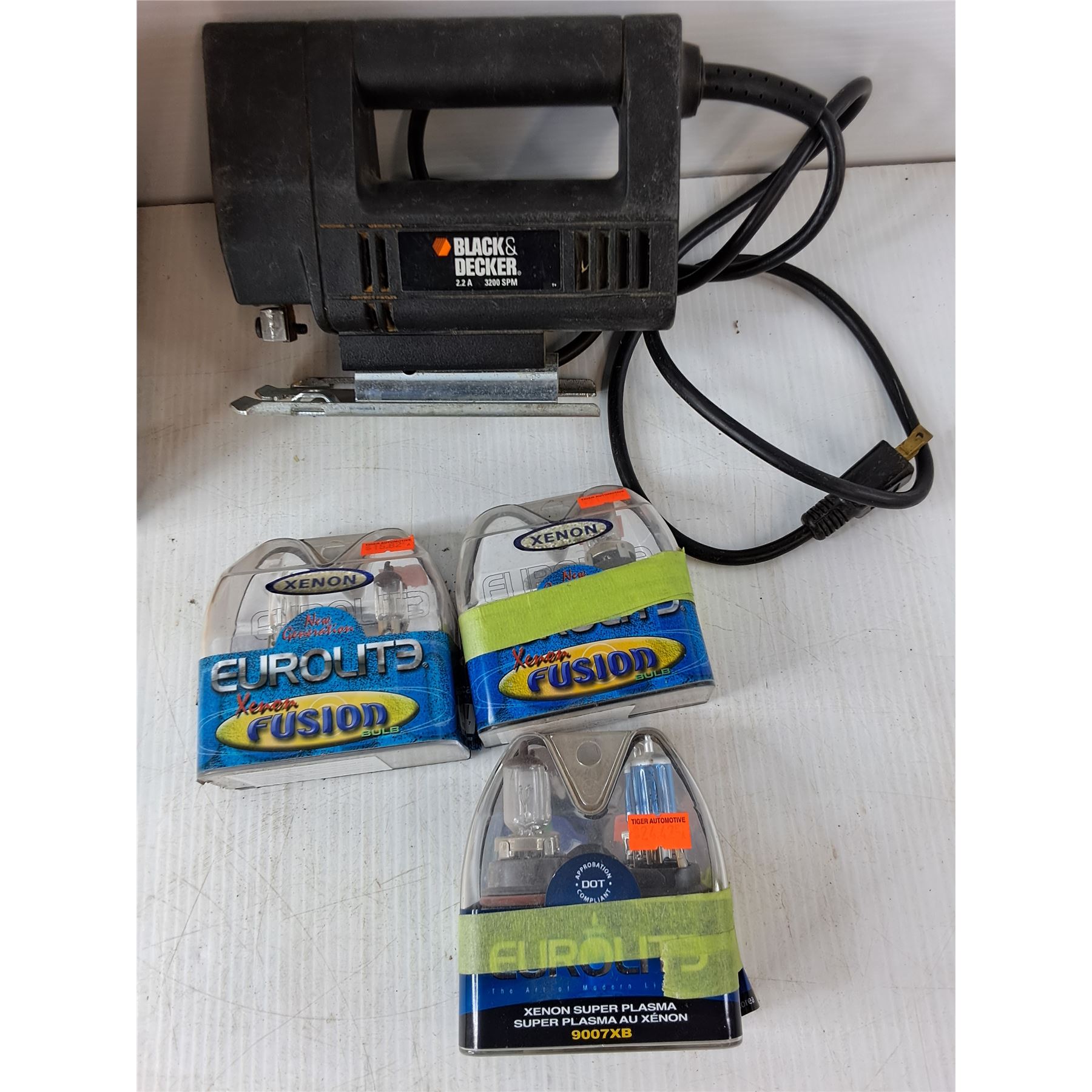 Black & Decker Jigsaw, Powers On/No Blade, Wood Toolbox 12  Tall x 14  Long, (5) Xenon Bulbs