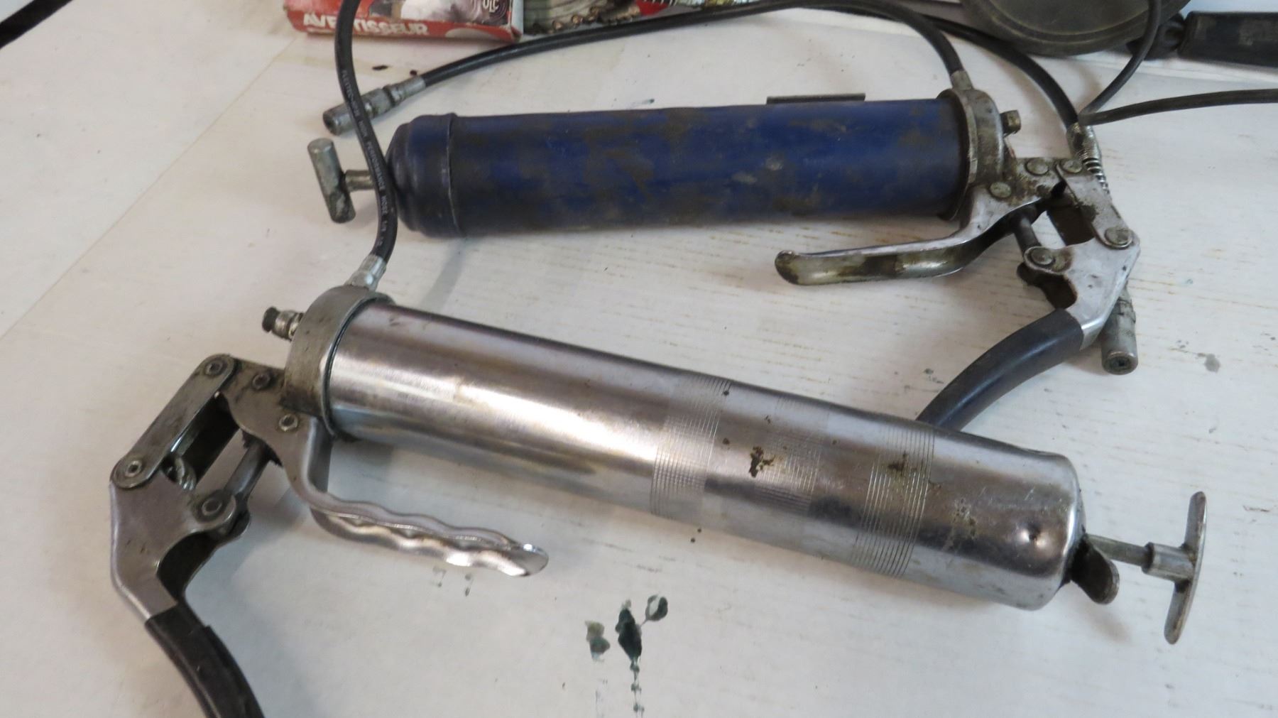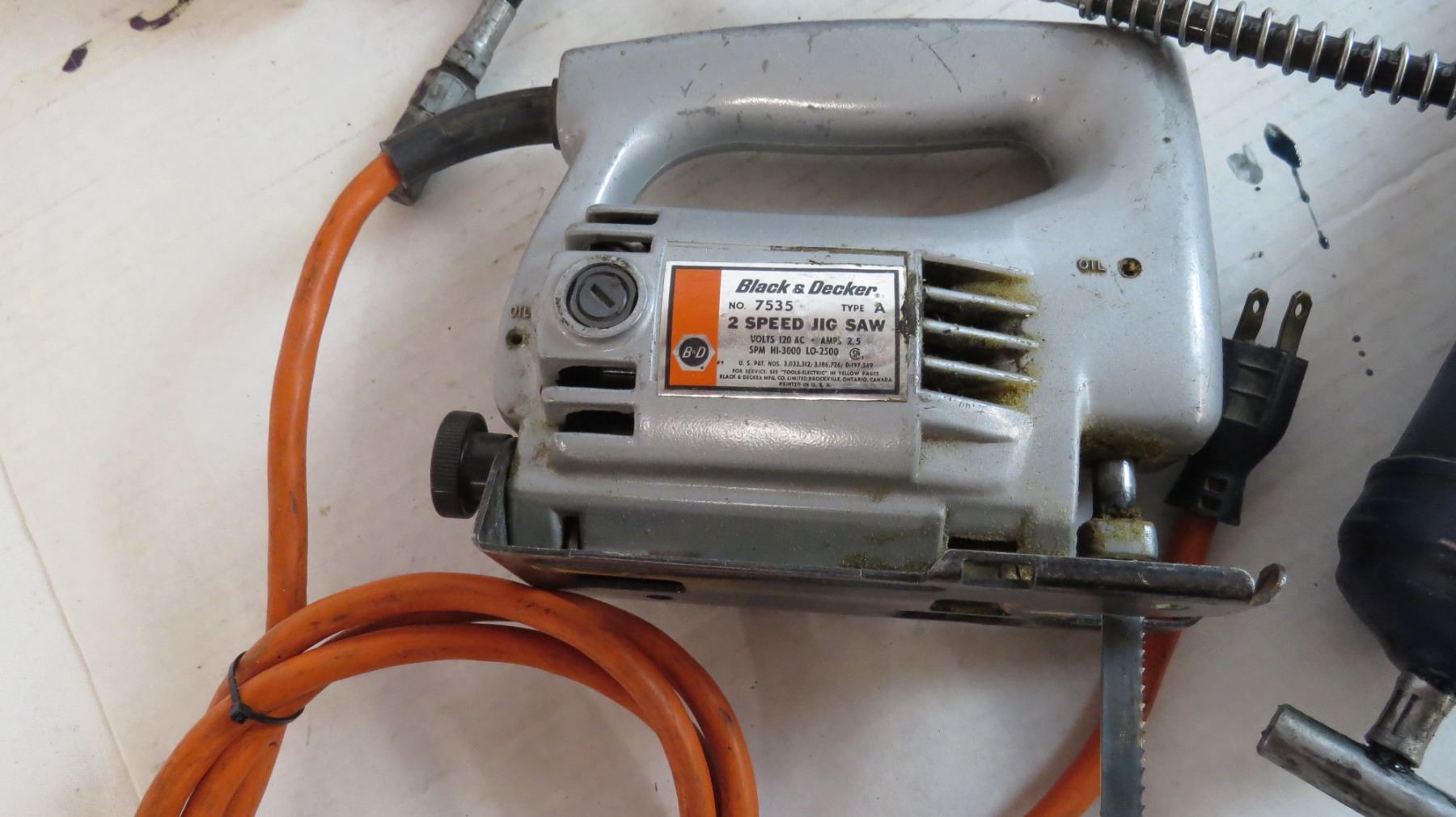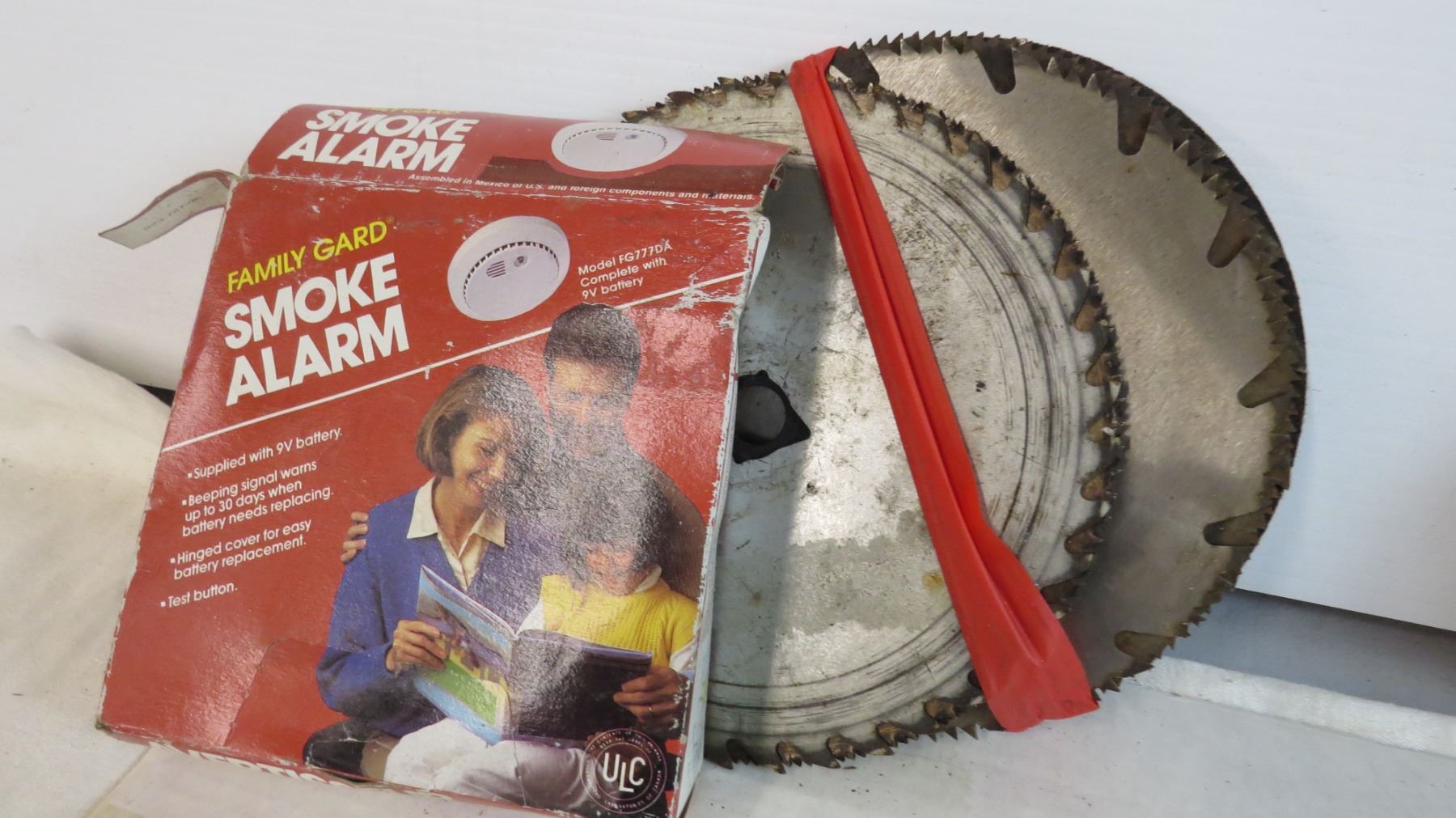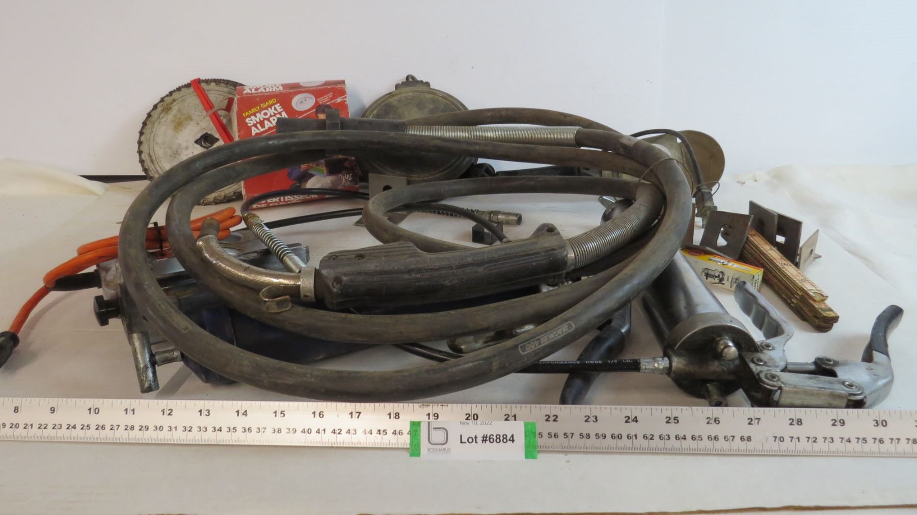 Black & Decker Jigsaw (works) - Welding Gun (damages) - Retractable Trouble Light (works) - (2) Grease Guns - Saw Blades - Smoke Alarm - Misc Items