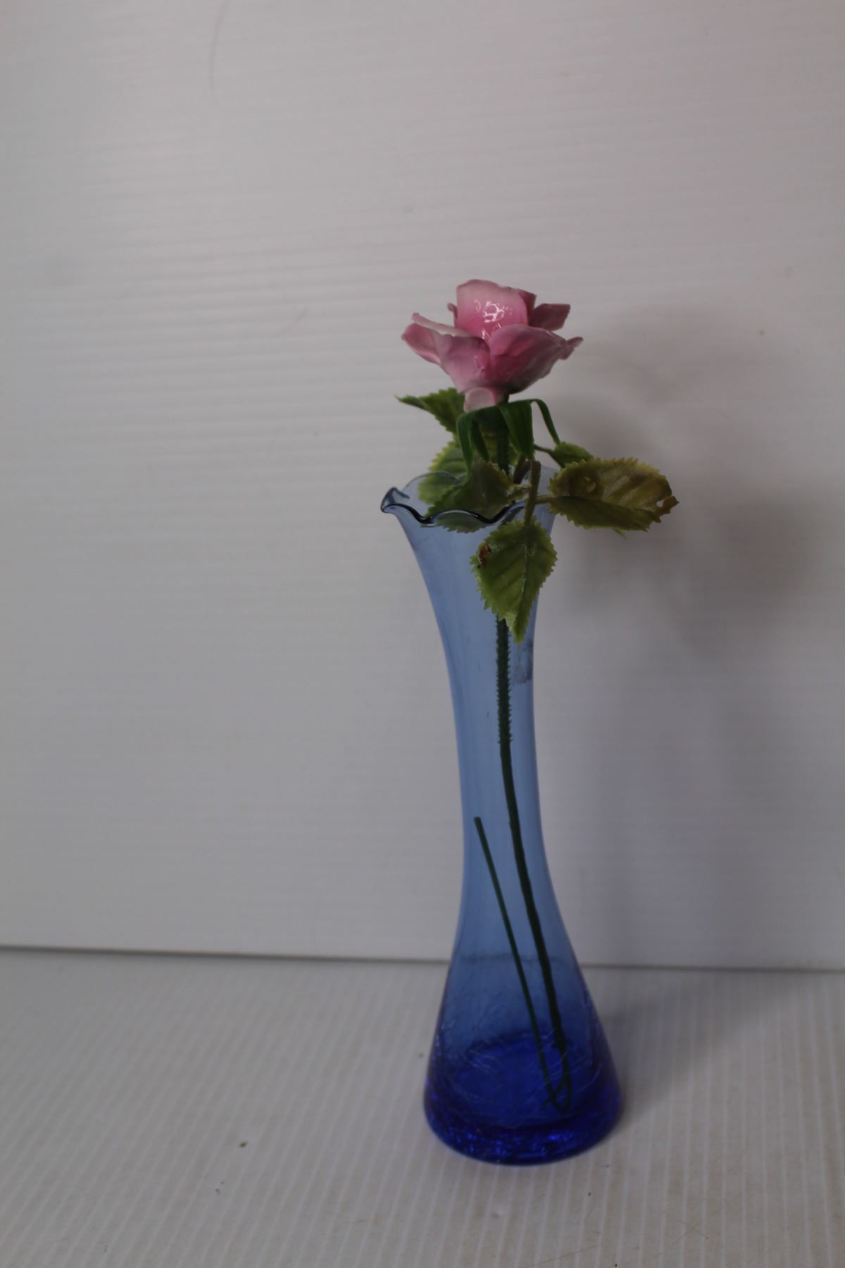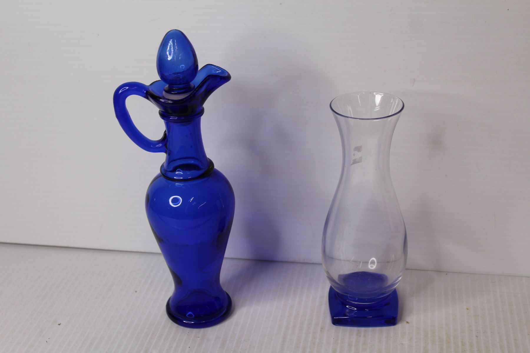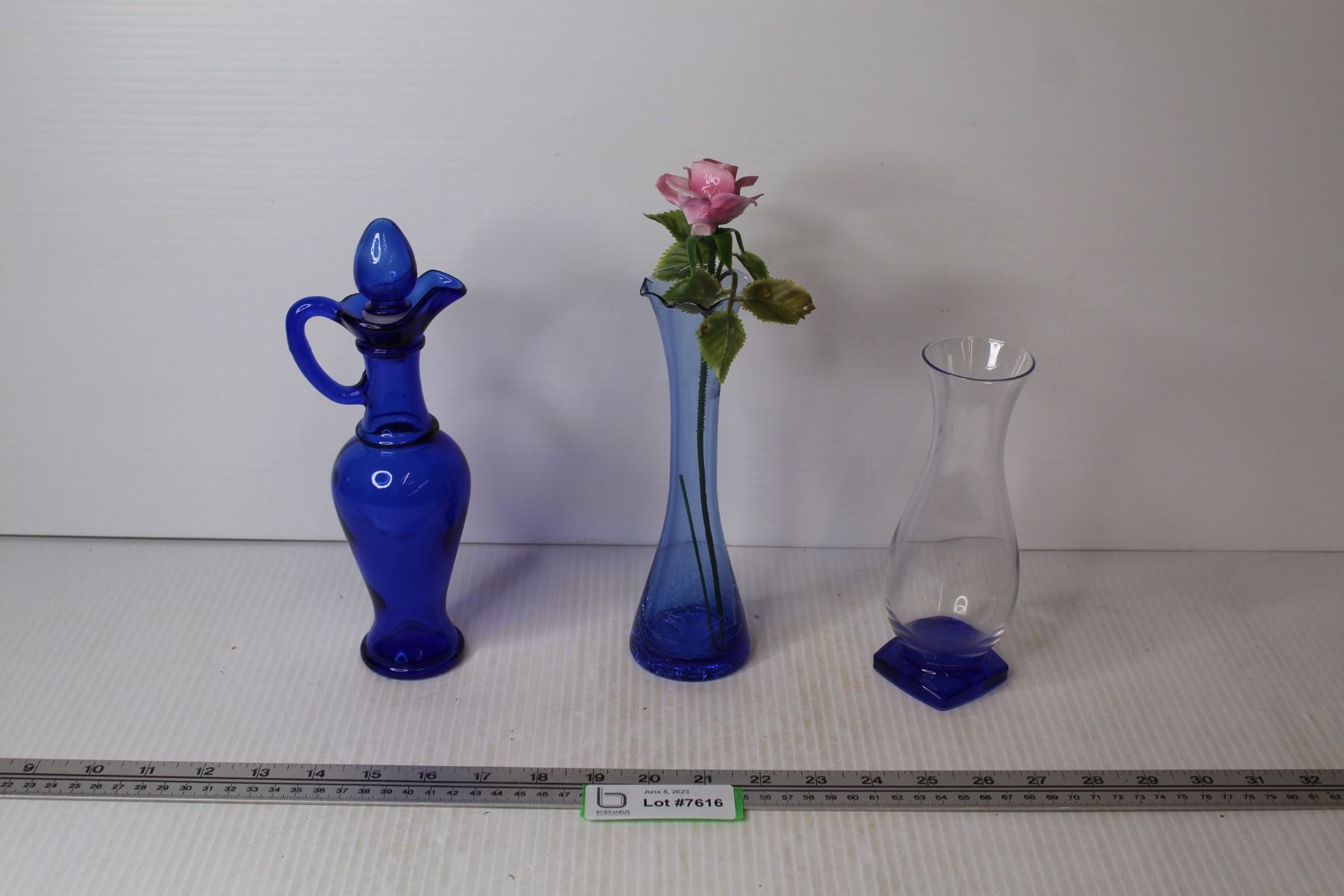 Blue Crackle Glass Vase + Blue Glass Oil Bottle and Vase