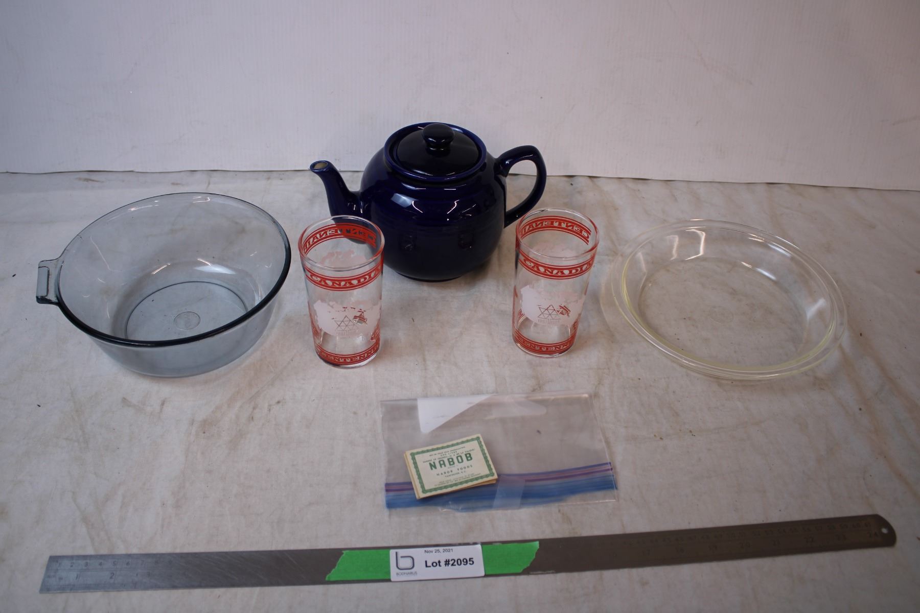 Blue Teapot, pair of 1967 centennial glasses, Pyrex Bowl + Pie Plate, Nabob Coupons (60’s)
