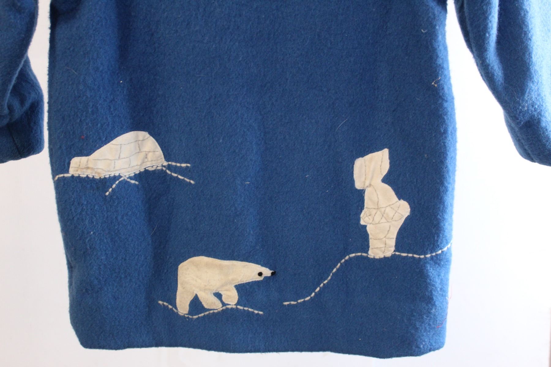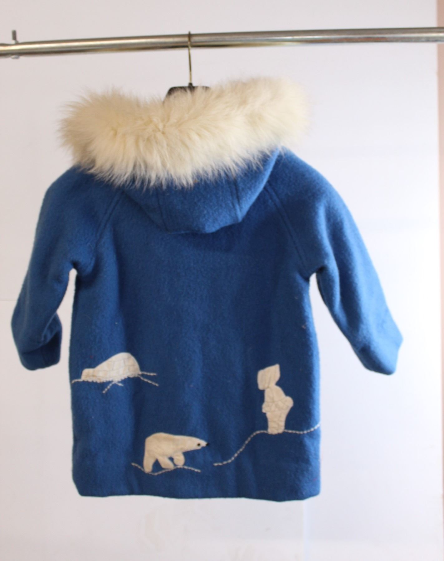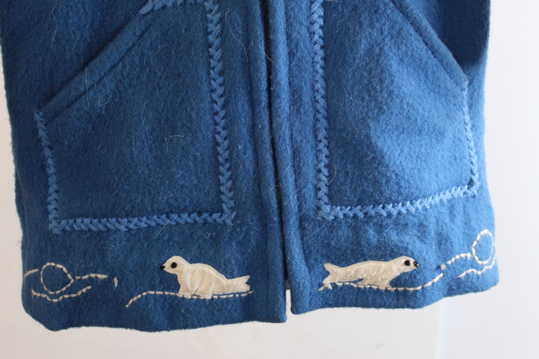 Blue Wool Parka with Real Fur Collar and Pom Poms 23" Long x 17.5" Wide