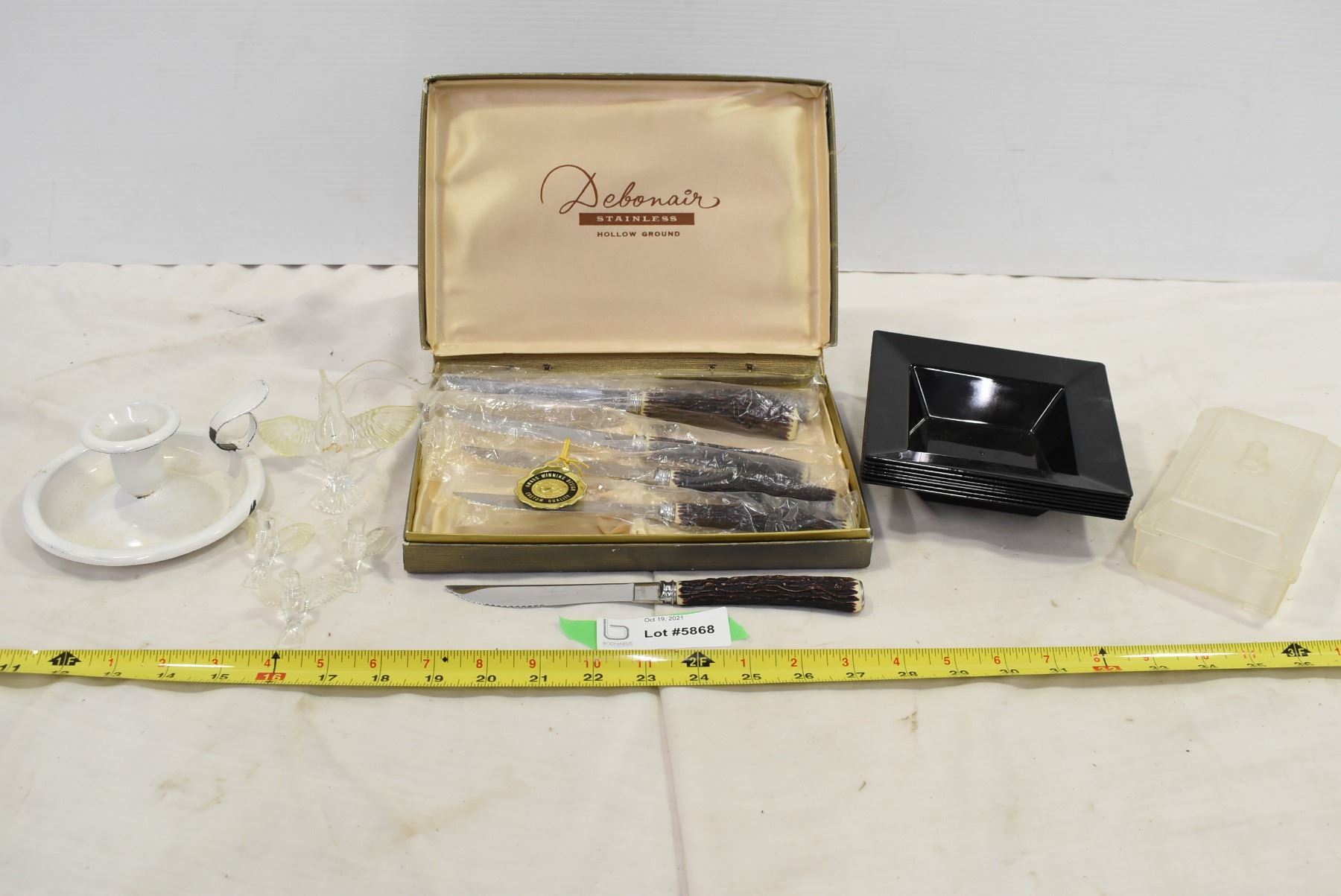 Bone Carved Knives, Plastic Dishes, Enamel Candle Holder, Glass Birds