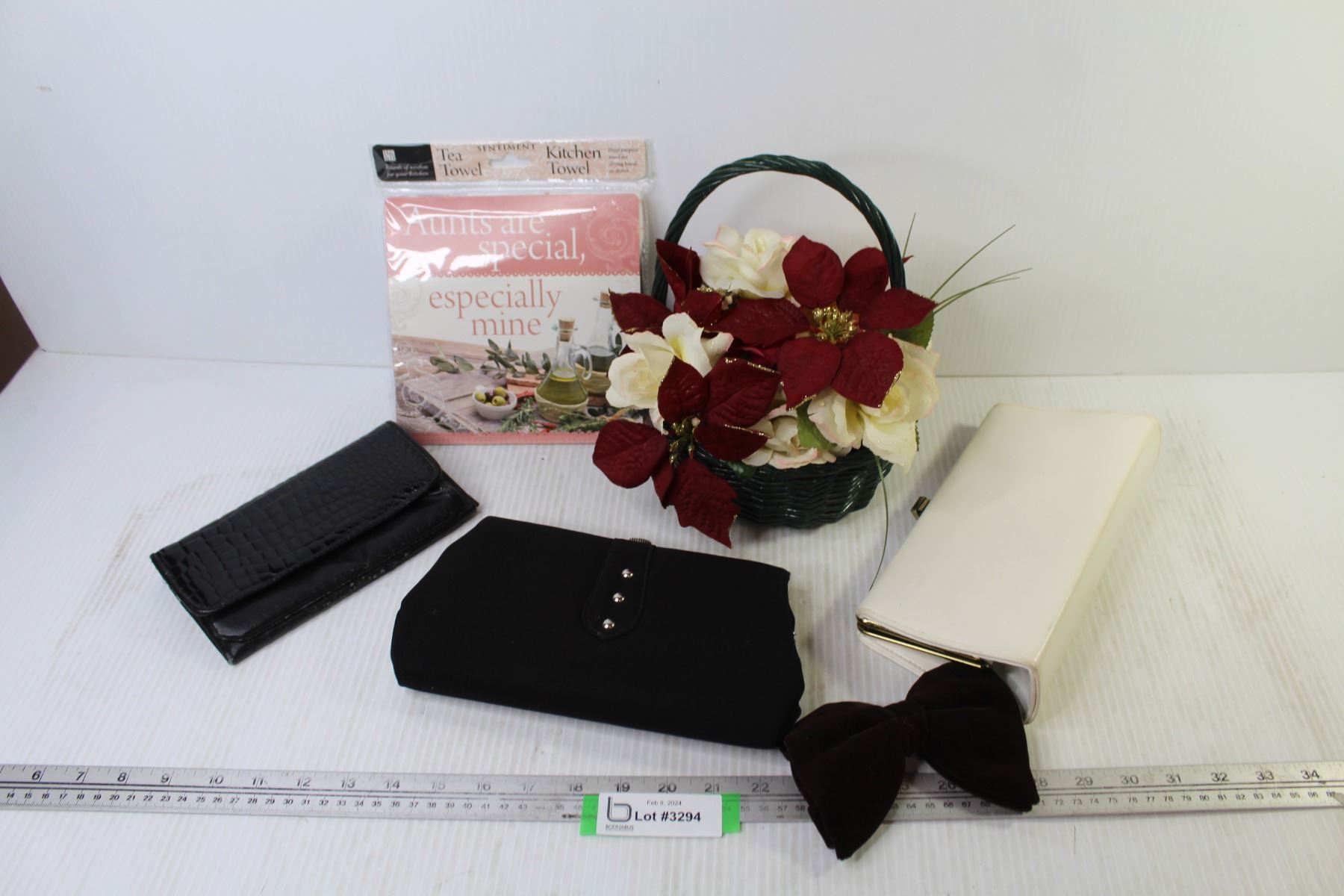 Bow Tie - Wallet - (2) Clutch Purses - Basket w/Flowers - Tea Towels (NIB)