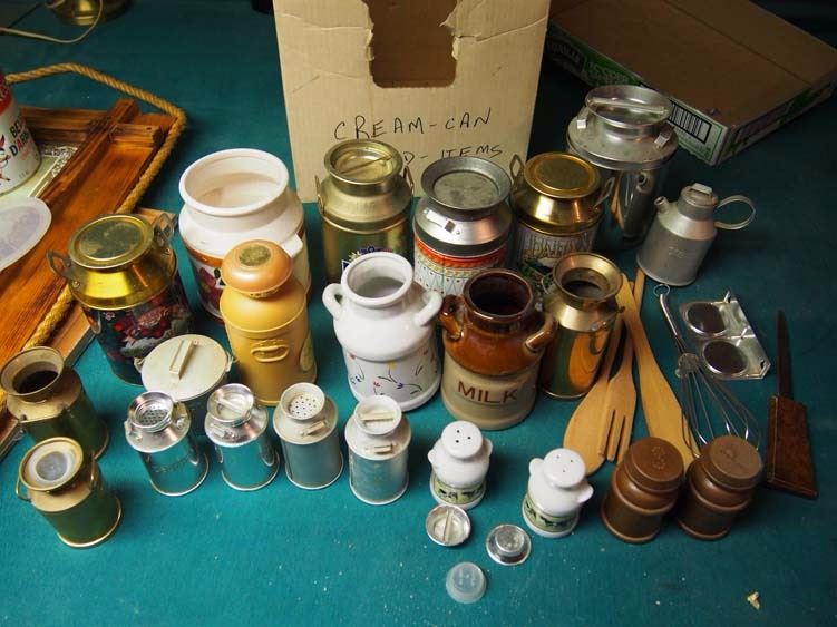 Box Full Of Cream Can Shaped Items, Salt And Peppers, Etc.