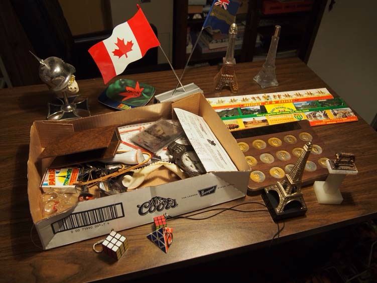 Box Full Of Misc. Items, Prime Minister Coins, Office Flags, Paris Aftershave, etc.