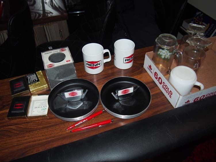 Box Full Of Renn Advertising Items, Ashtrays, Mugs, Zippo Measuring Tape
