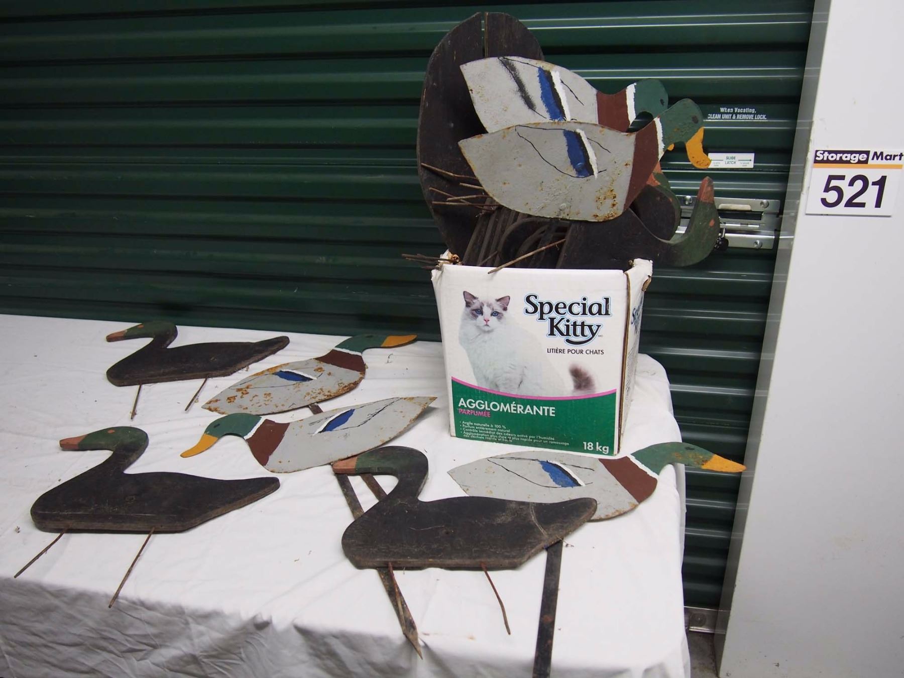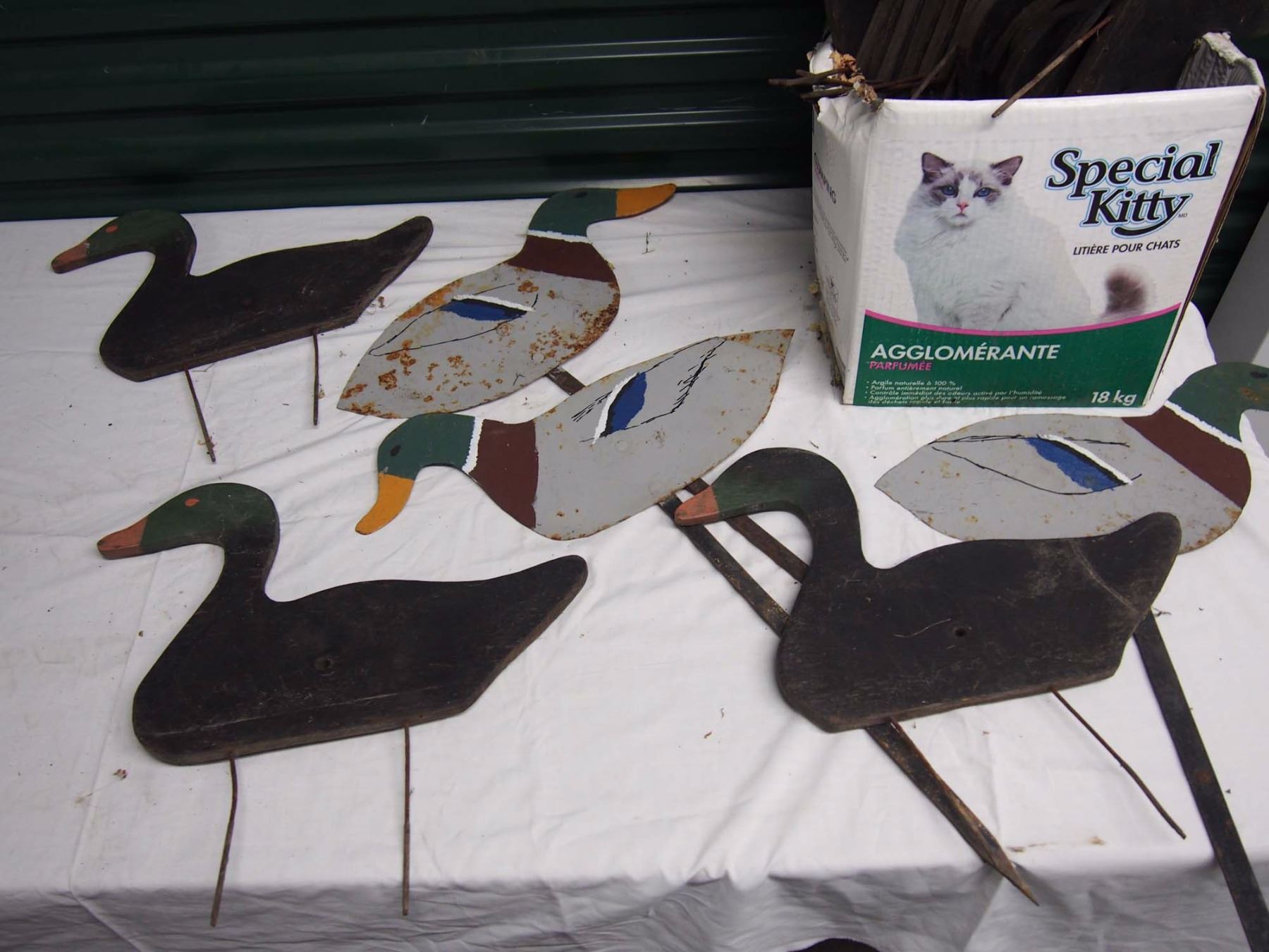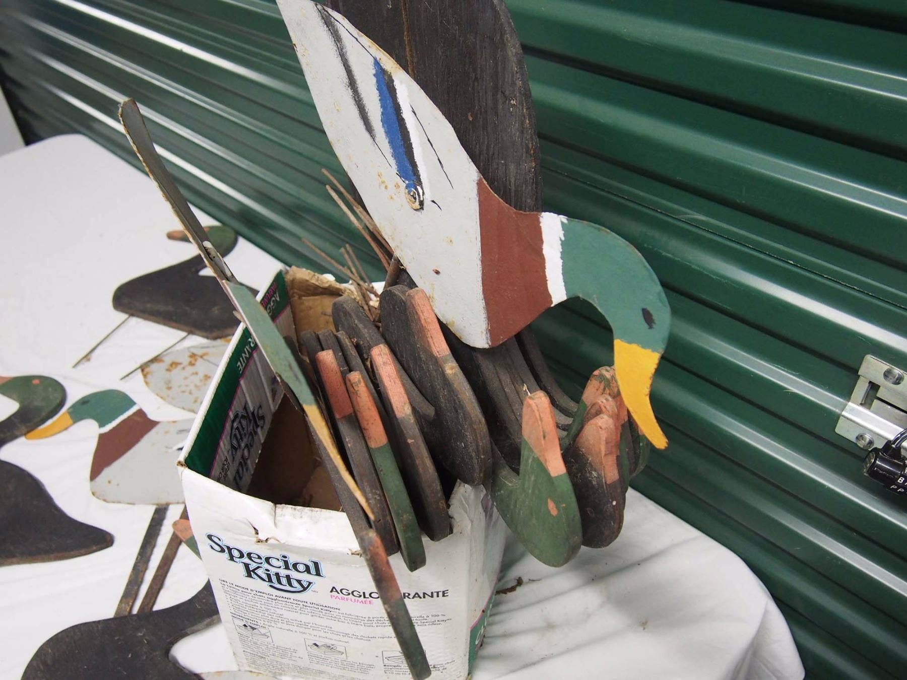Box Full Of Vintage Duck Decoys (14 Wooden) (5 Metal)
