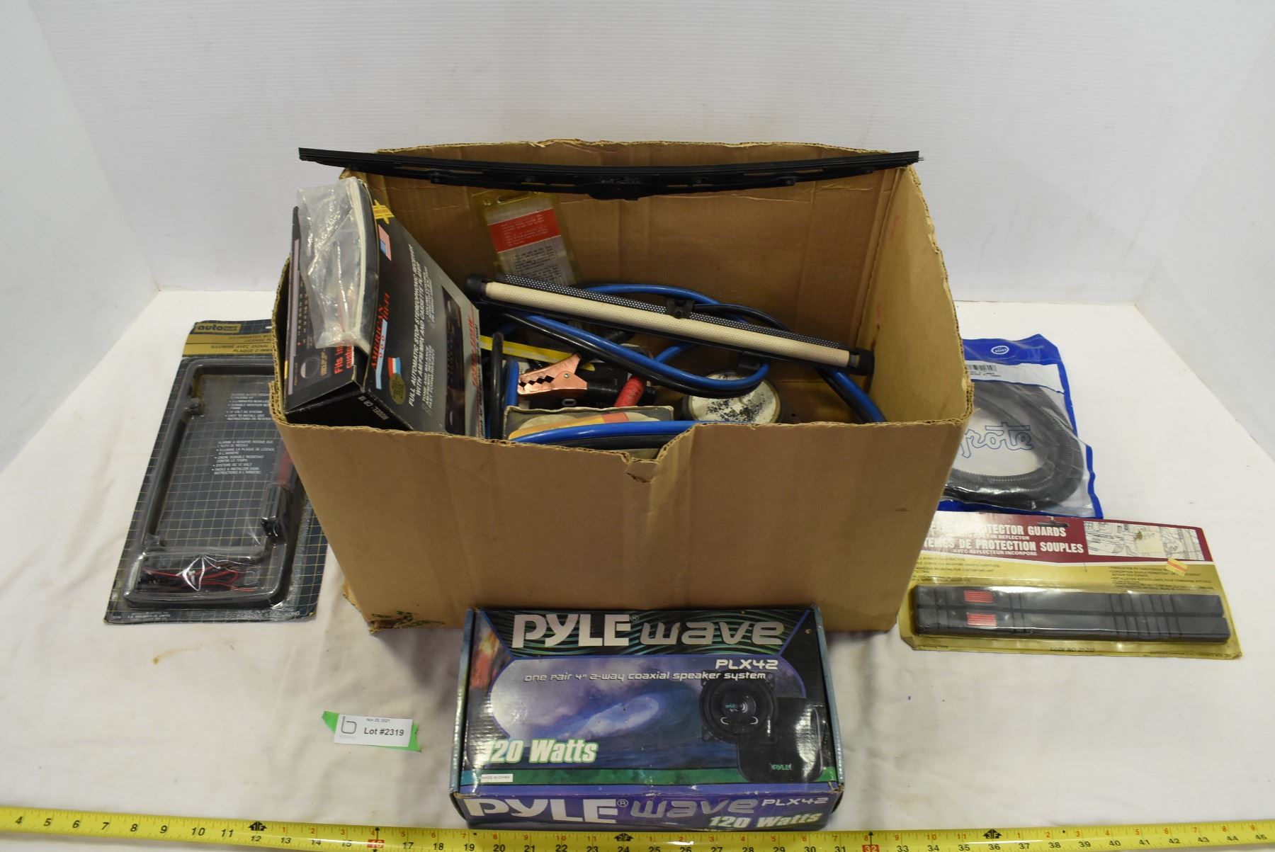 Box of Car Related Supplies/Items – Speakers, Wiper, Misc.