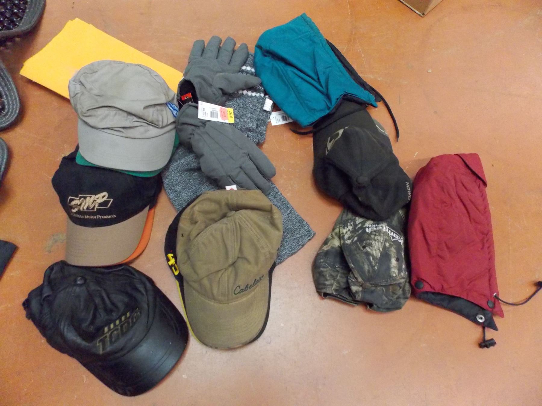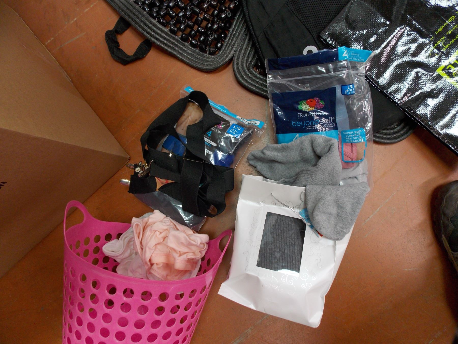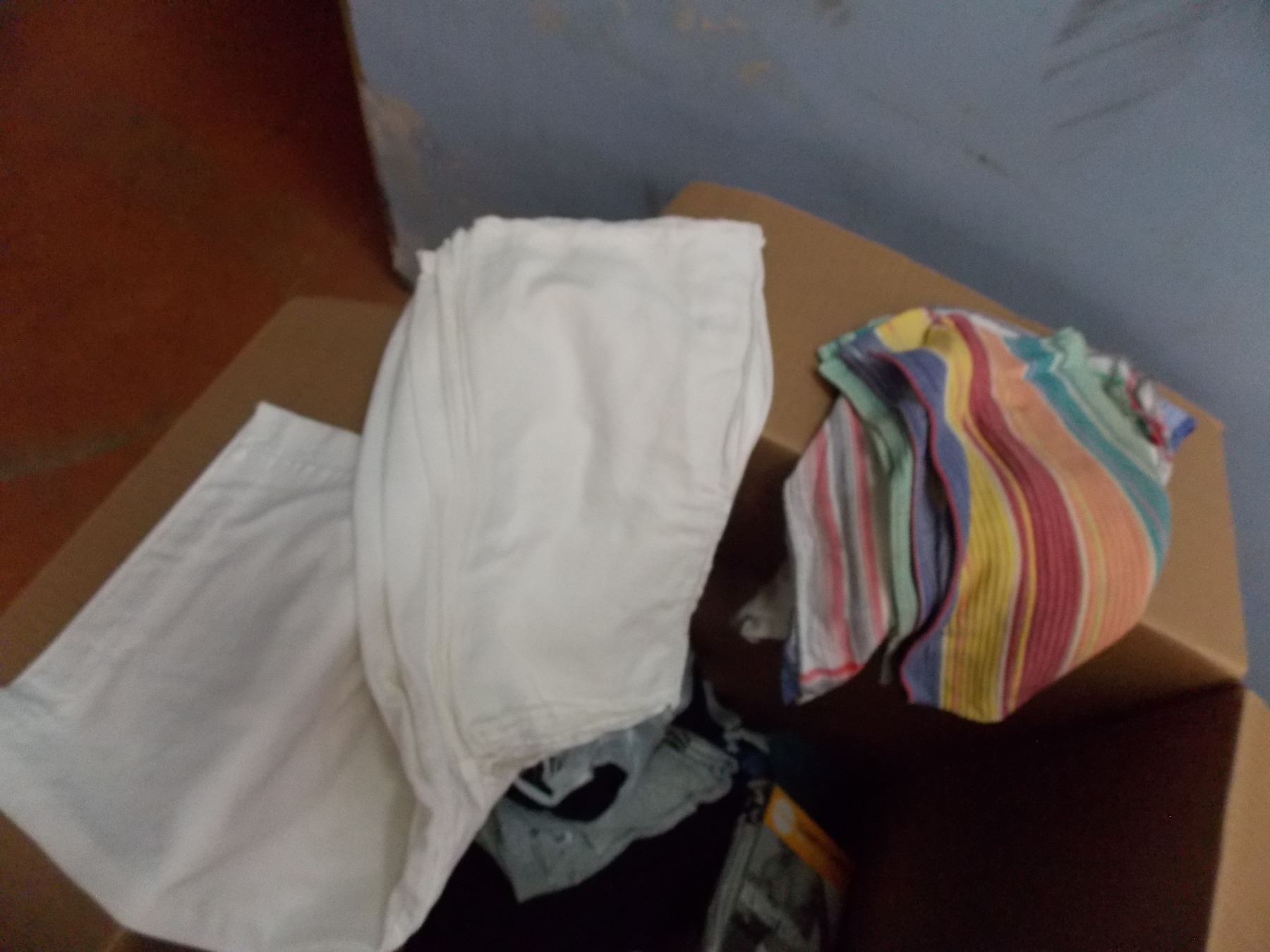 Box of Clothes, underwear (L), hats, hand towels, shammy's, car seat beads