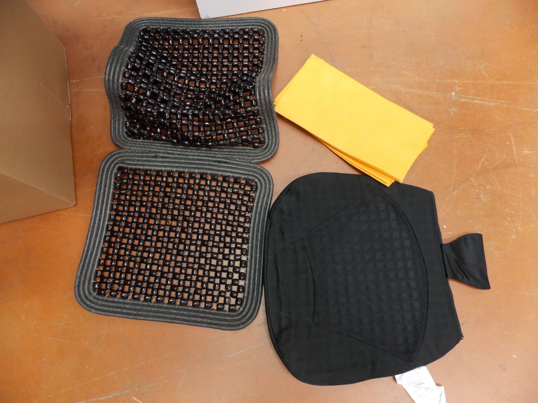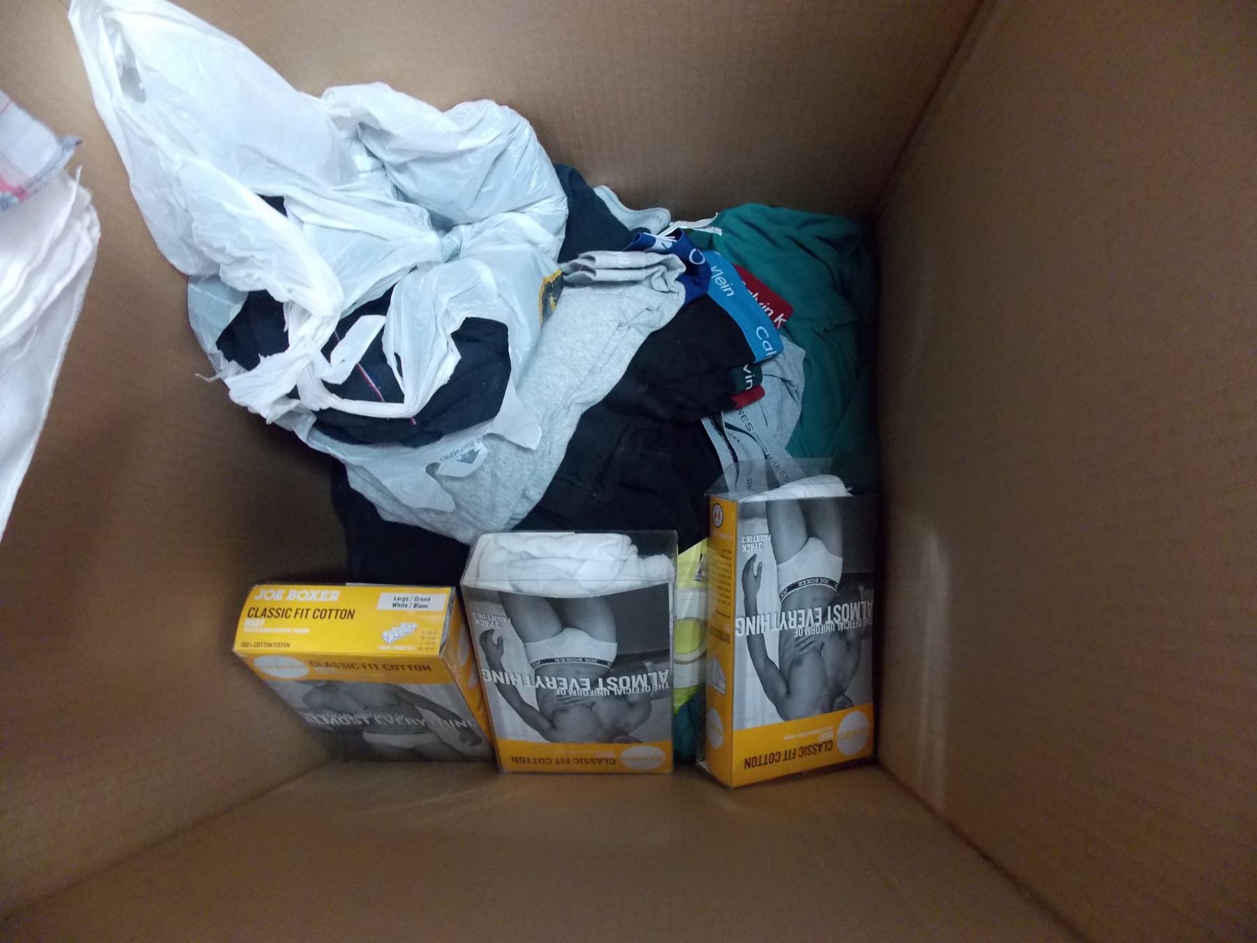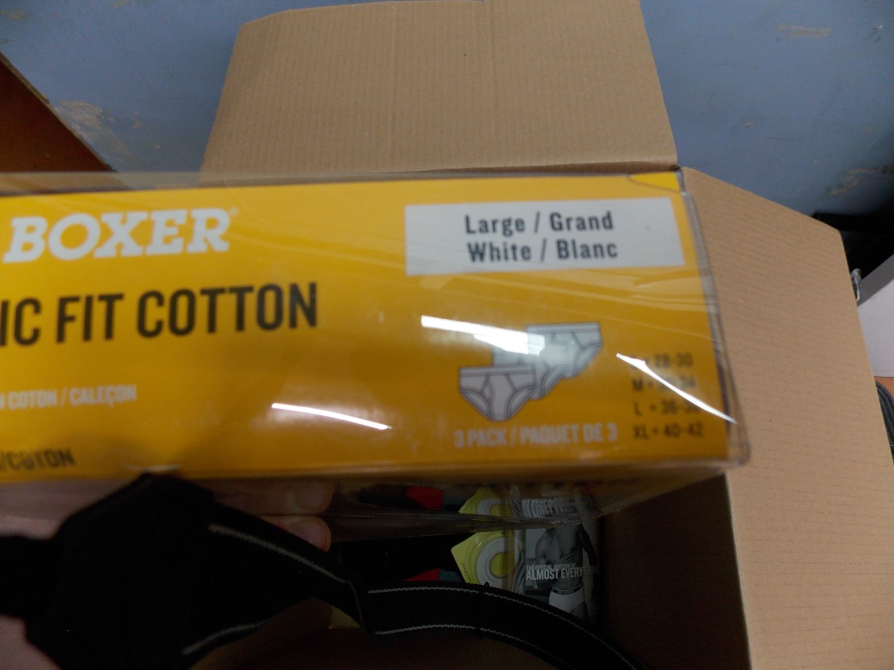 Box of Clothes, underwear (L), hats, hand towels, shammy's, car seat beads