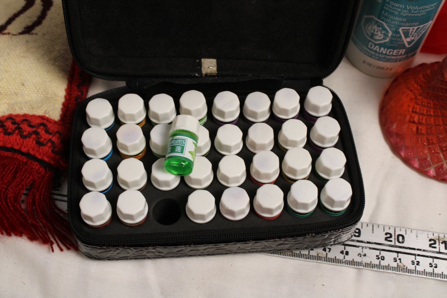 Box of bathroom related items, makeup, essential oils, vintage cell phone