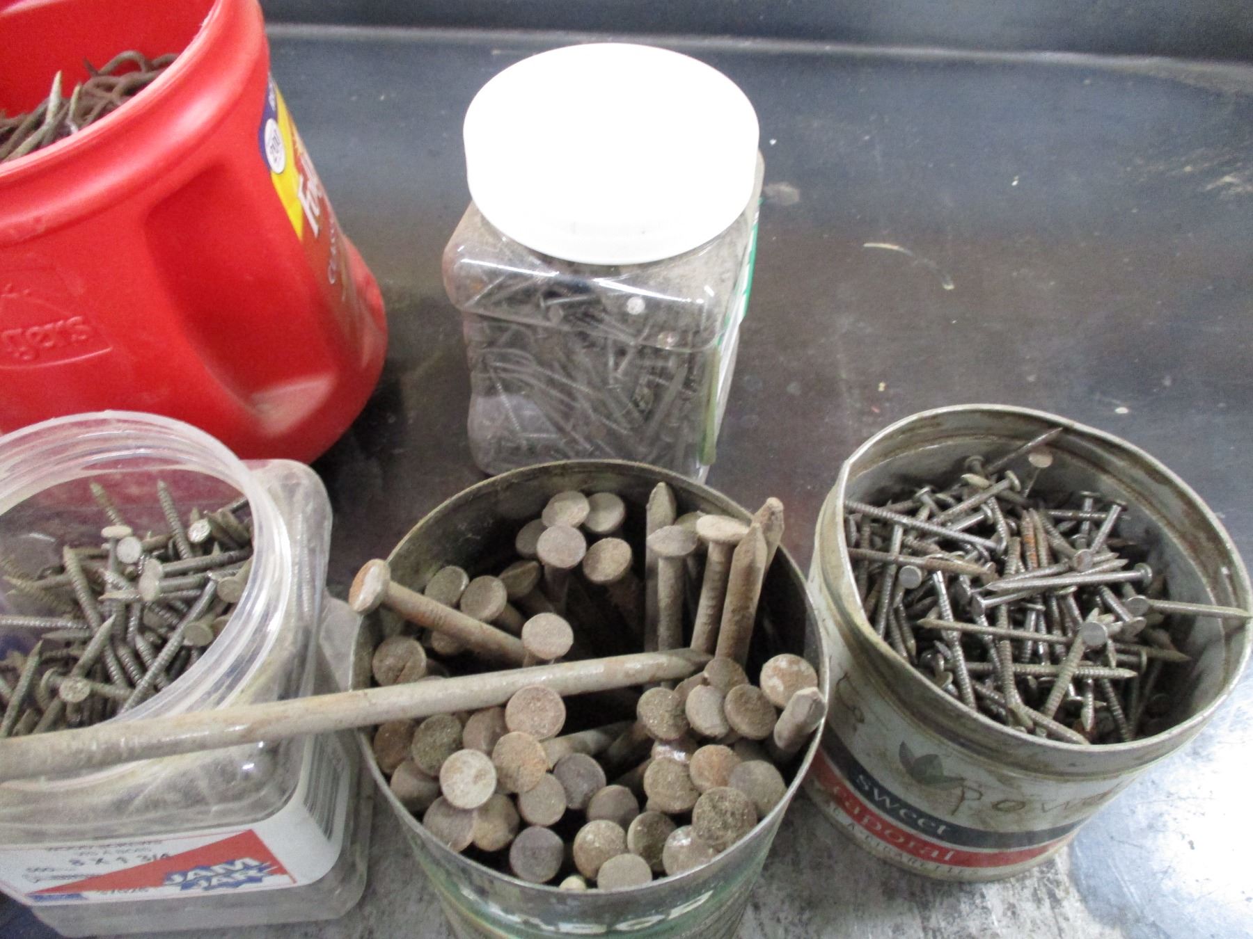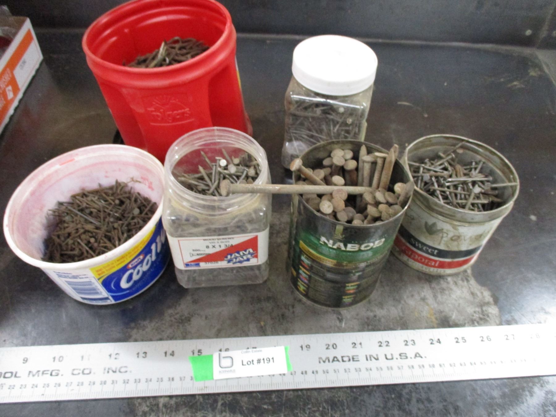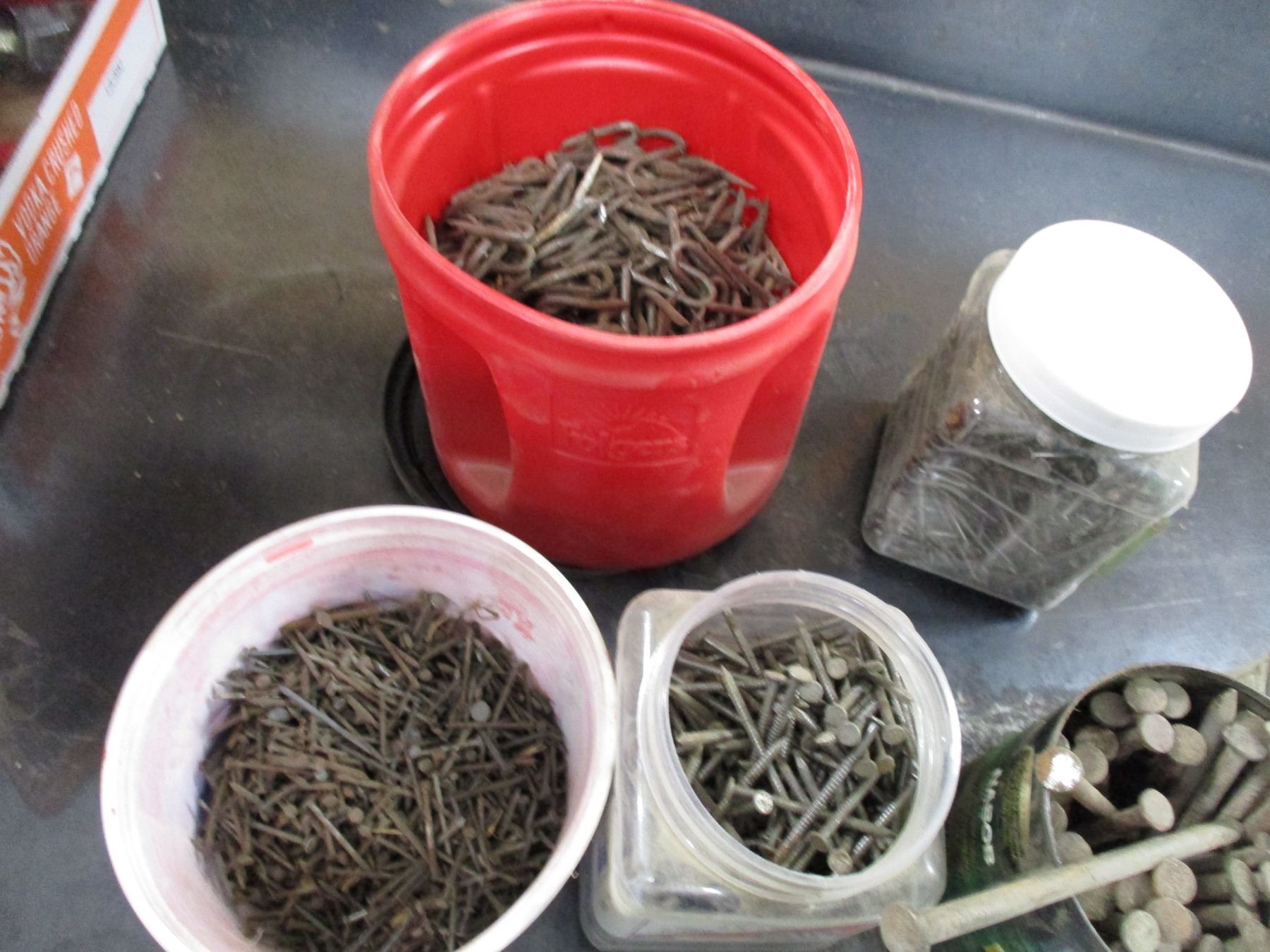 Box with (6) containers of various sized nails - 6" fence staples, etc