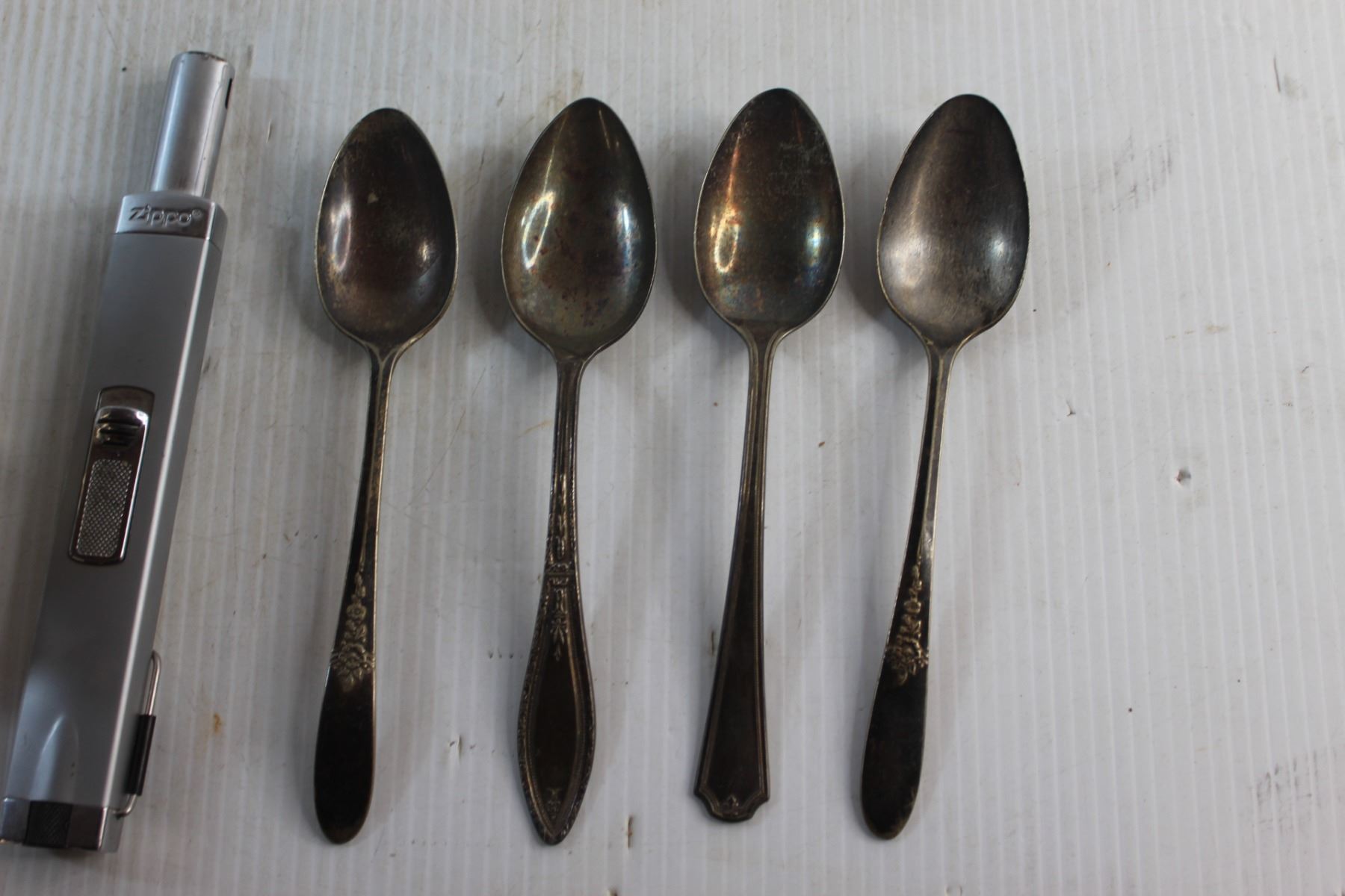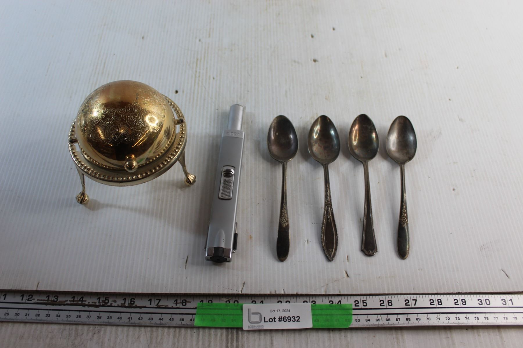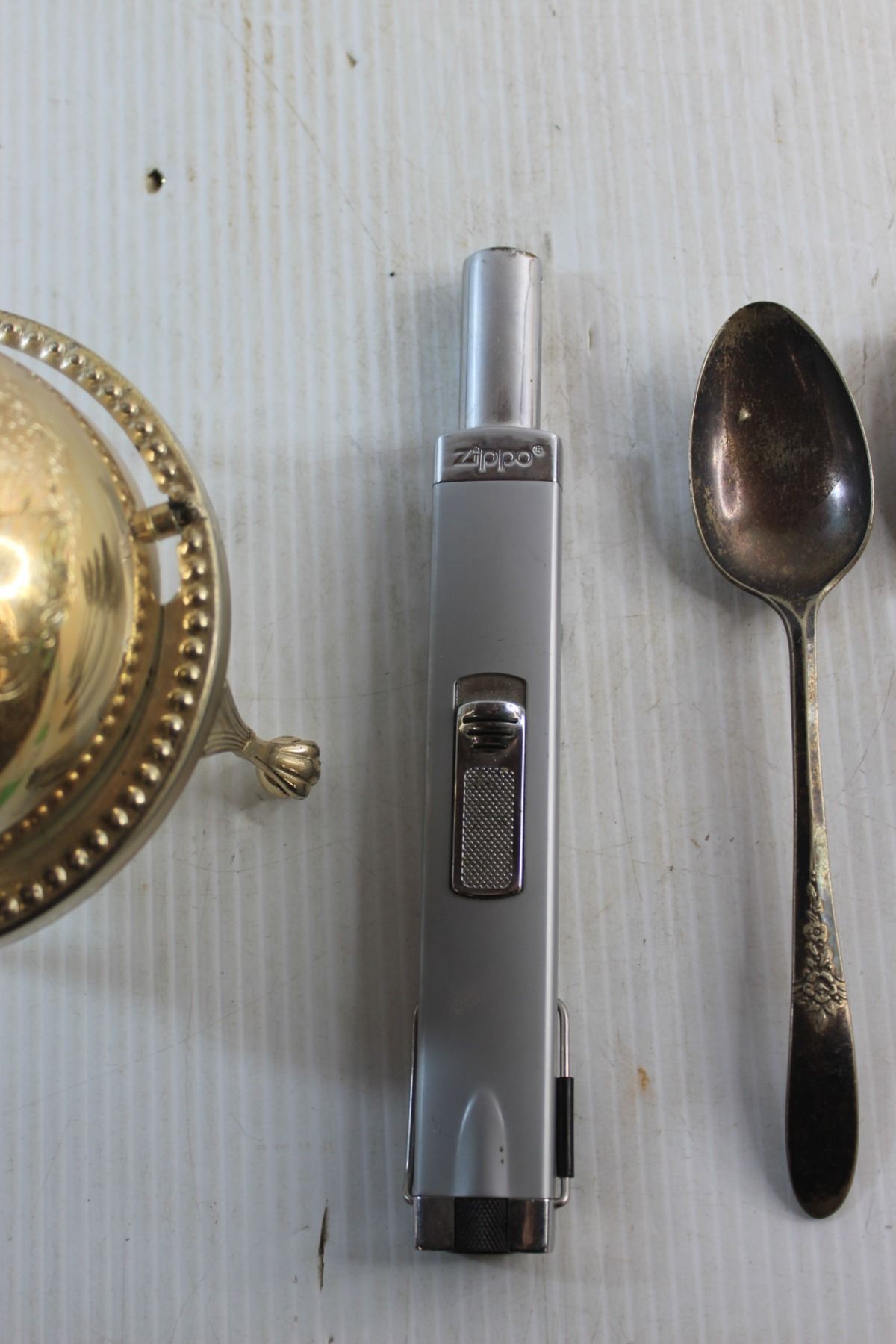 Brass Candy Dish, Zippo Stove Lighter - Tested and (4) Silver Vintage Spoons