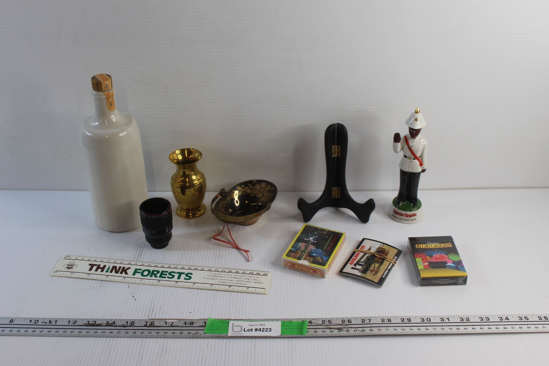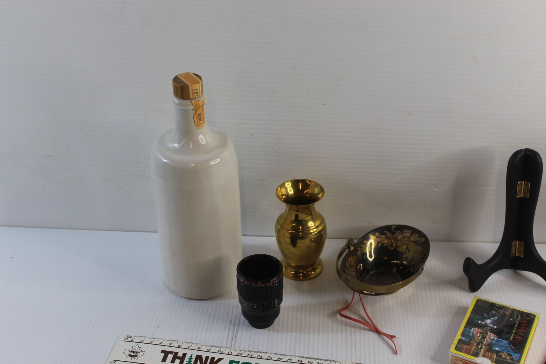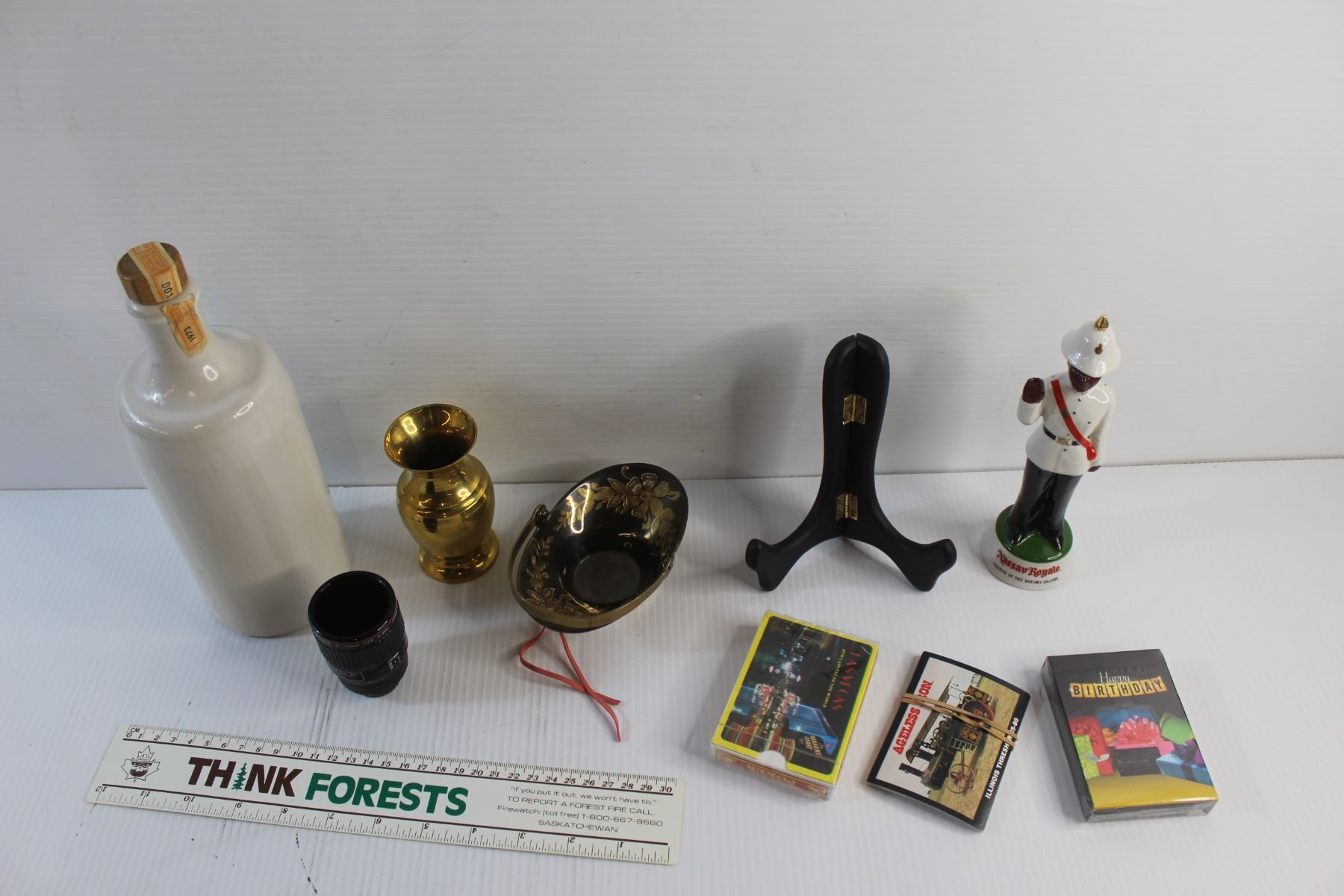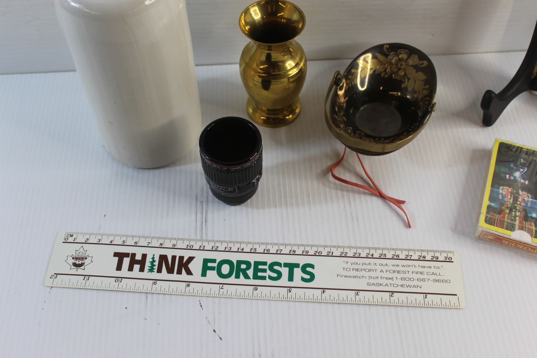 Brass Vase, Playing Cards, Ceramic Liquor Shot Cup, Plate Stand, Ruler and Misc