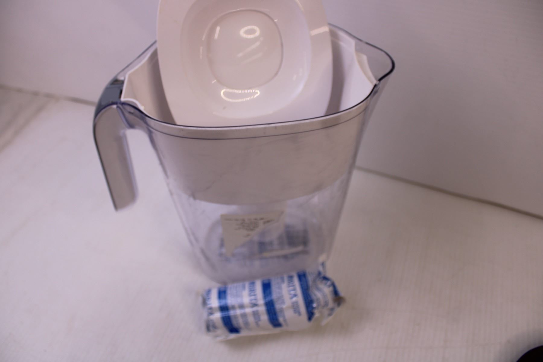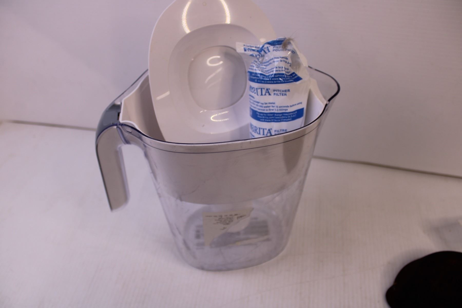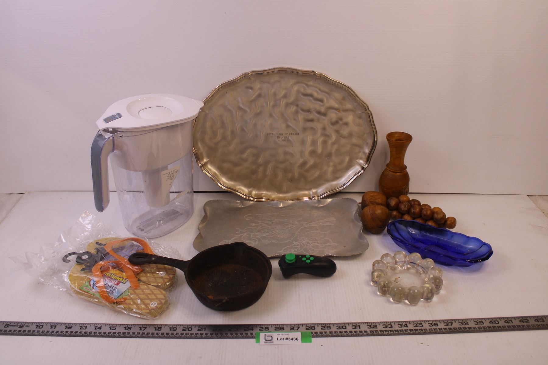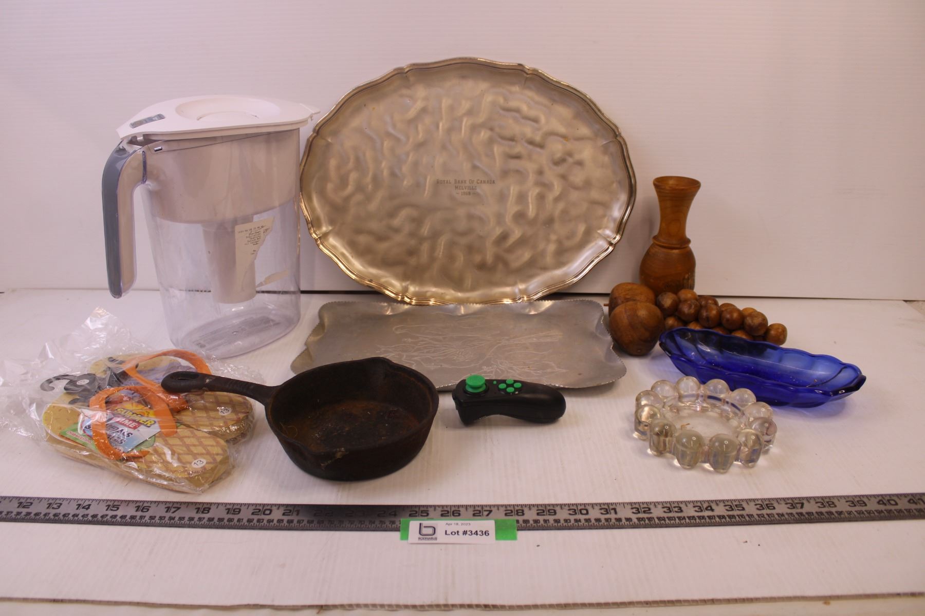 Brita Filter with new cartridge, 2 serving platters, wooden fruit decor, small cast irin pan, kids flip flops, 2 small serving dishes