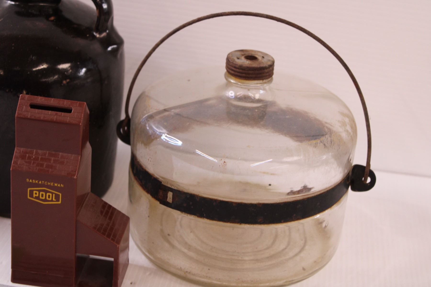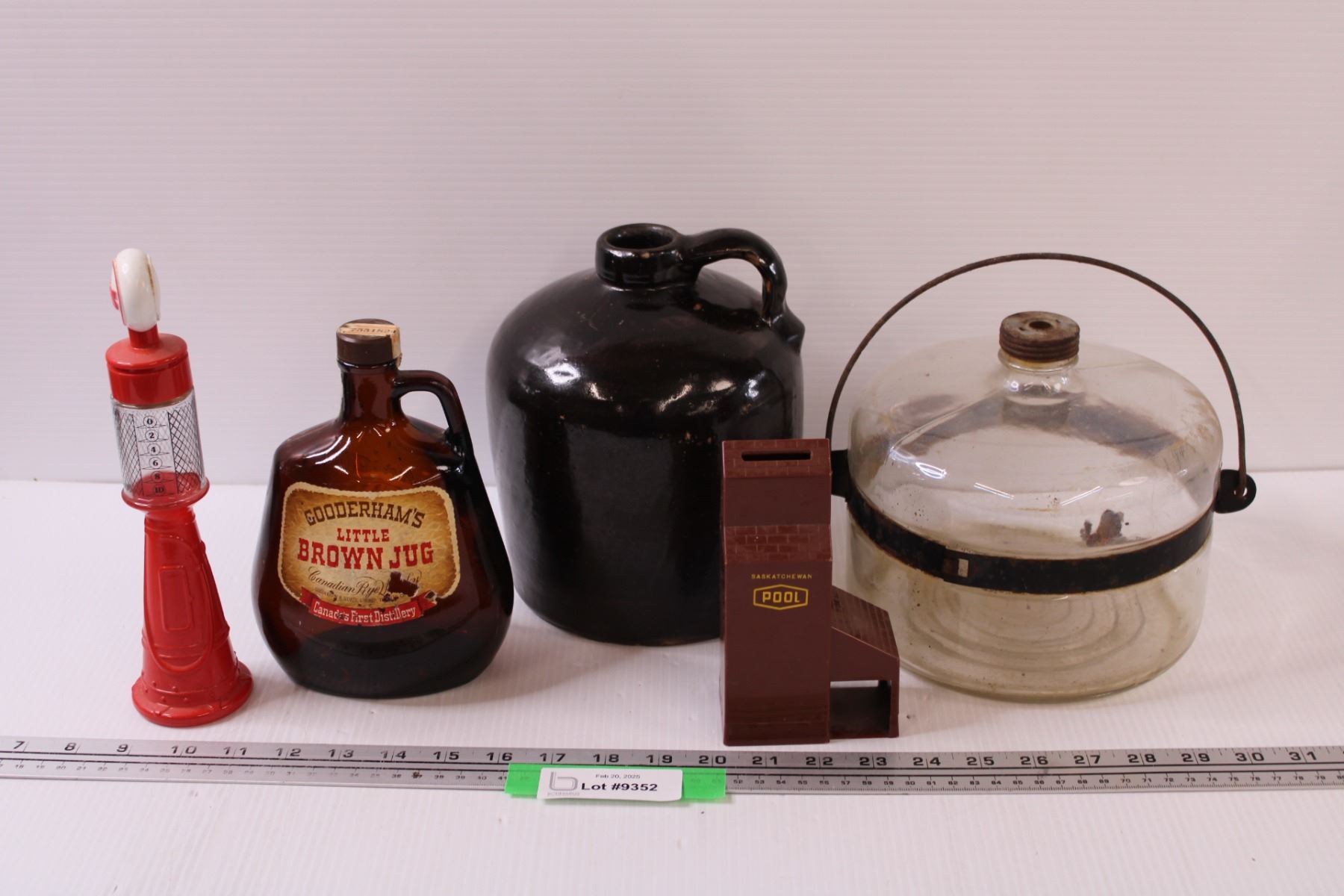 Brown Crock Jug, Little Brown Jug, Gas Replica Figurine, Sask Pool Coin Bank, Clear Antique Kerosene