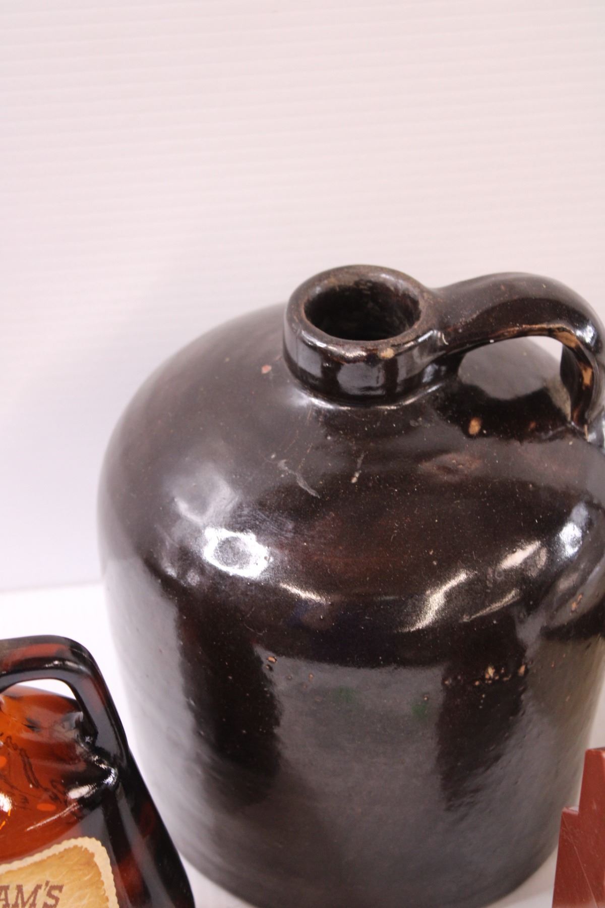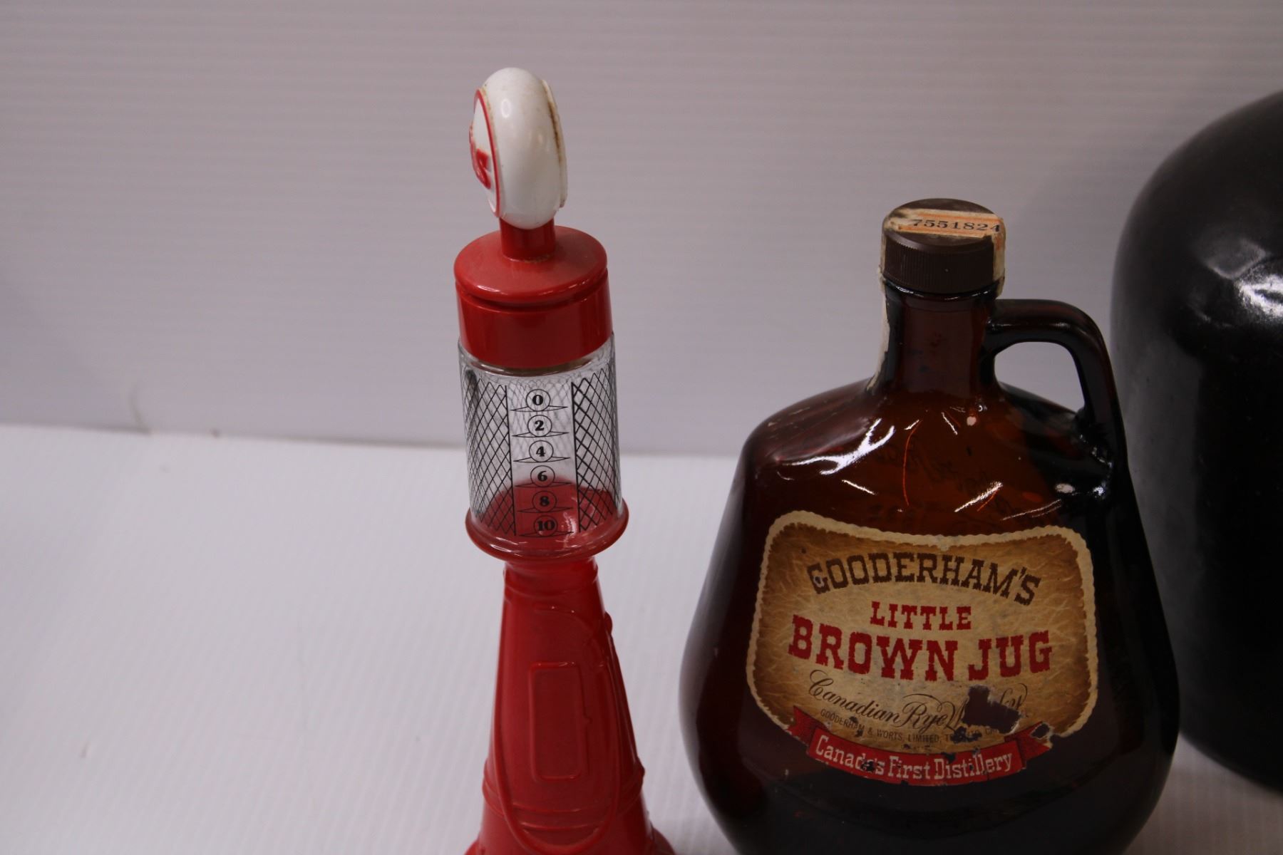 Brown Crock Jug, Little Brown Jug, Gas Replica Figurine, Sask Pool Coin Bank, Clear Antique Kerosene Dip Bottle