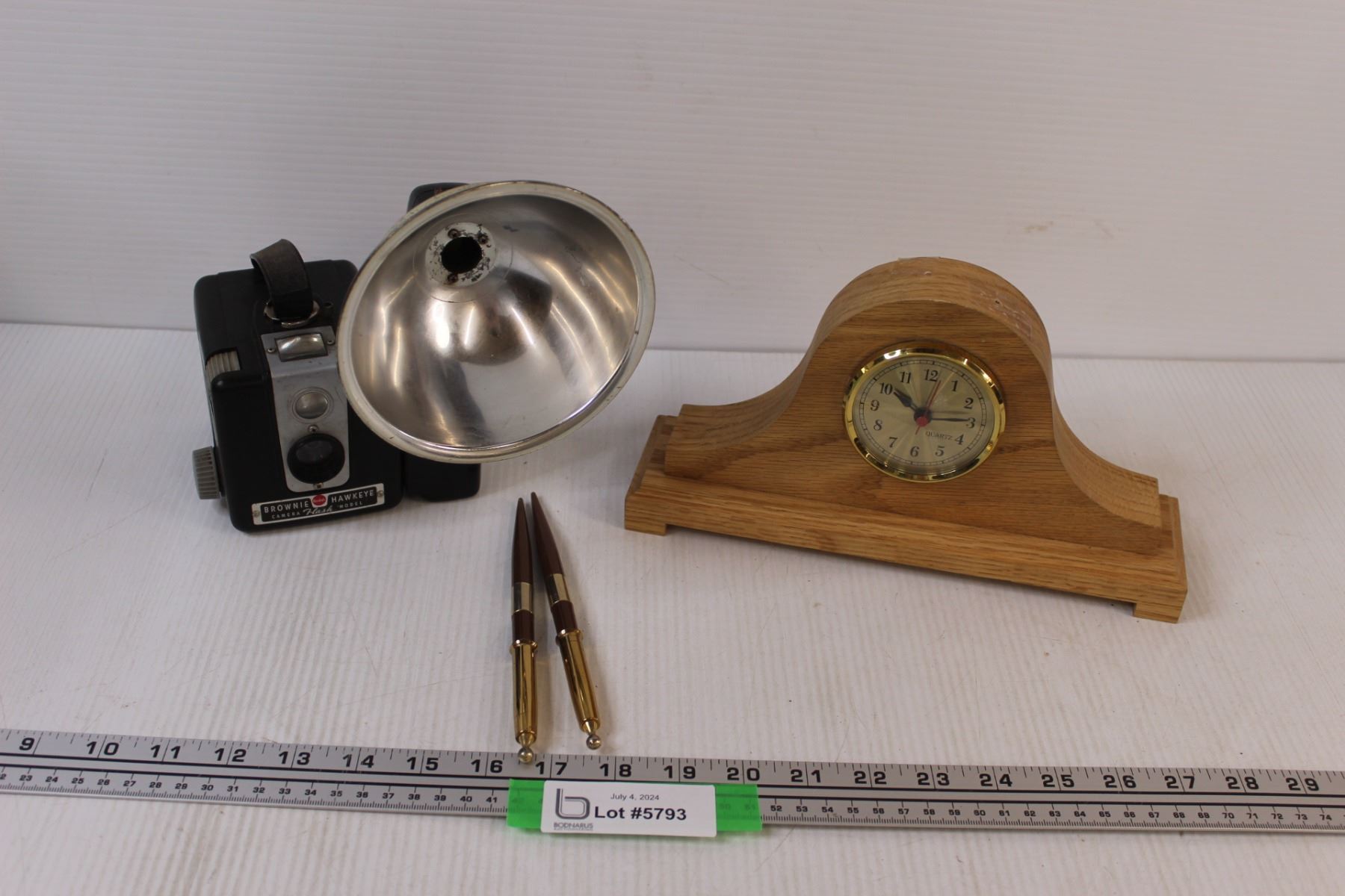 Brownie Kodak Vintage Camera (as is) Mantle Clock - Works & (2) Desk Pens
