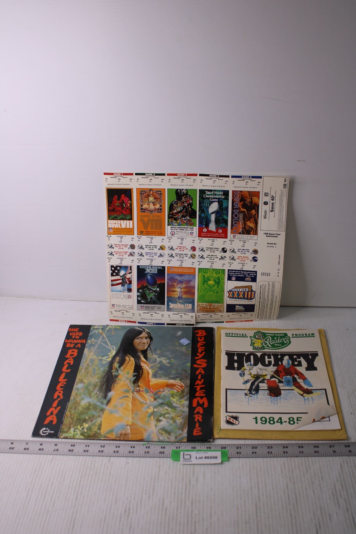Buffy Saint Marie Vinyl Record, Raiders Hockey Magazine and Super Bowl Item
