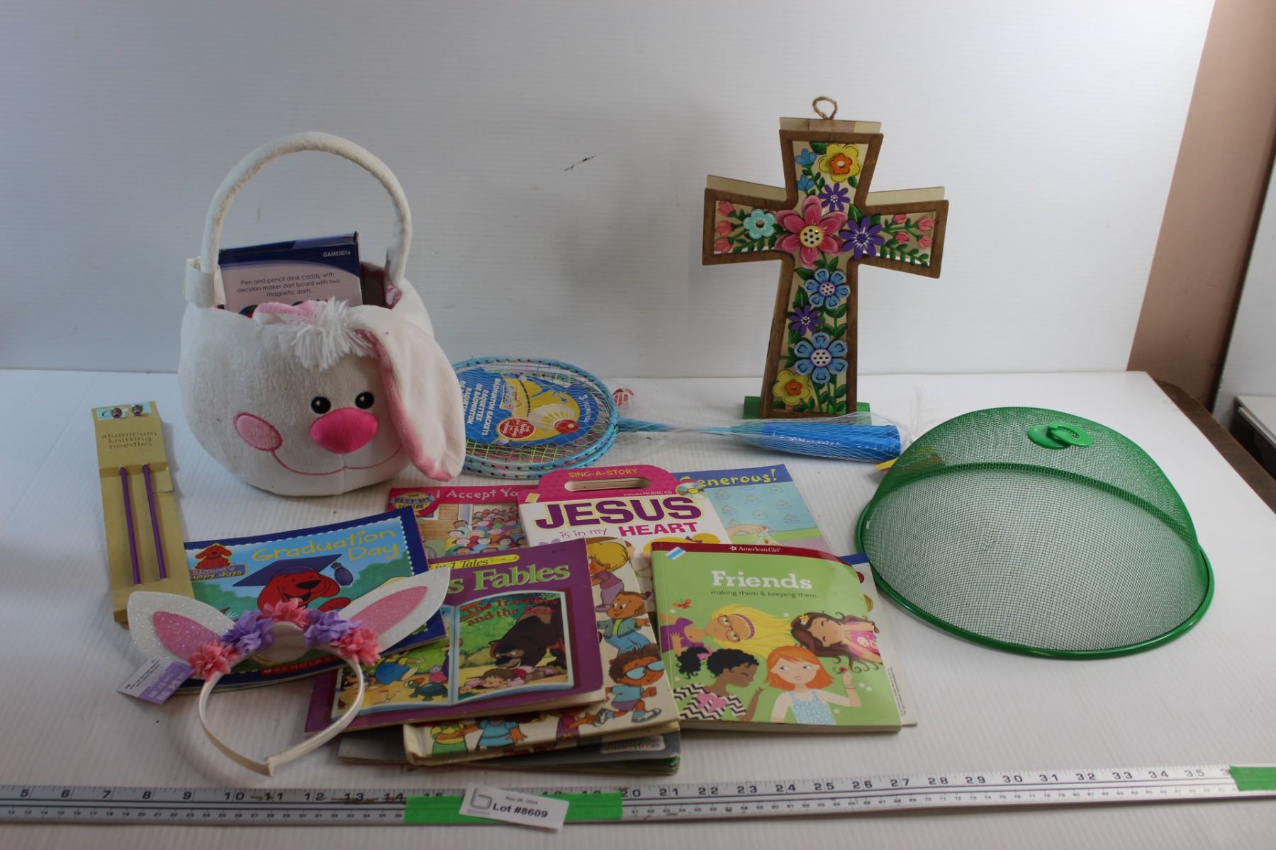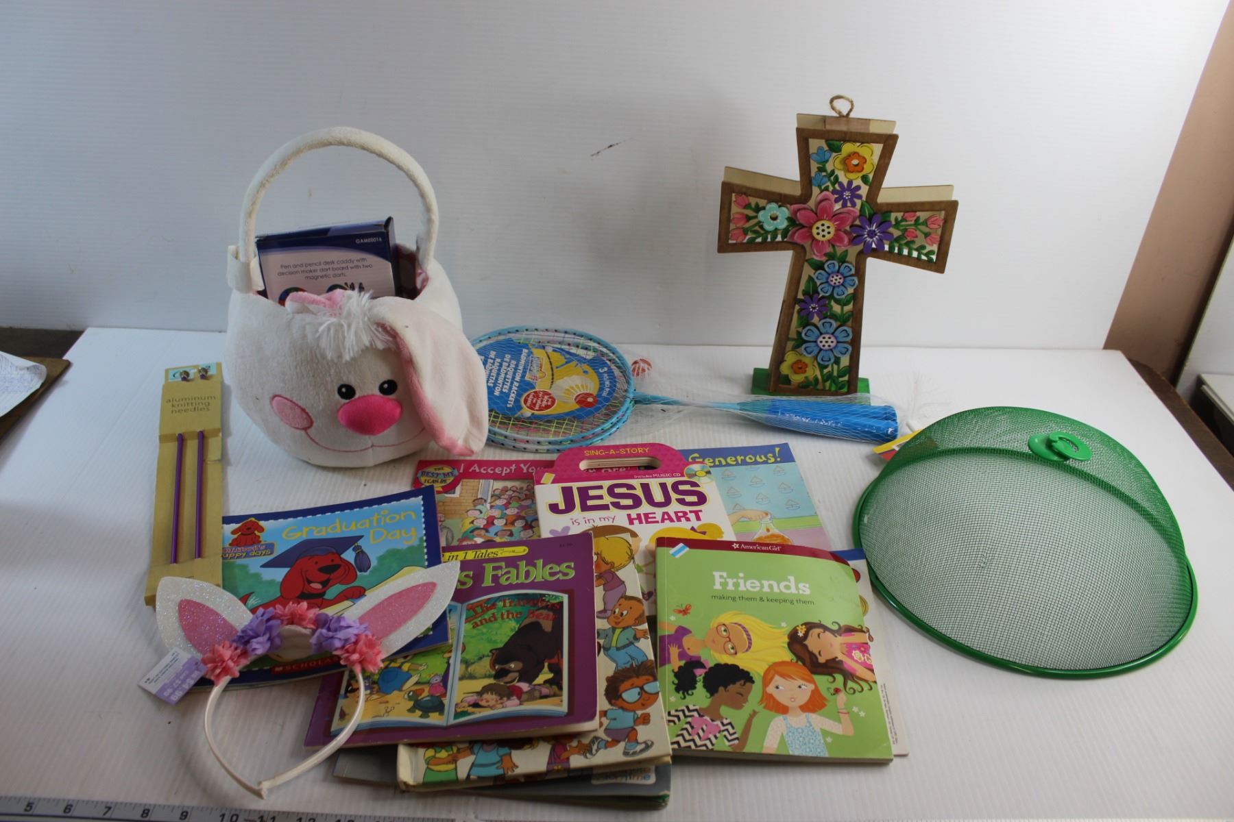 Bunny Basket, Kids Books, Cross Wall Decor, Knitting Needles and Badminton Set