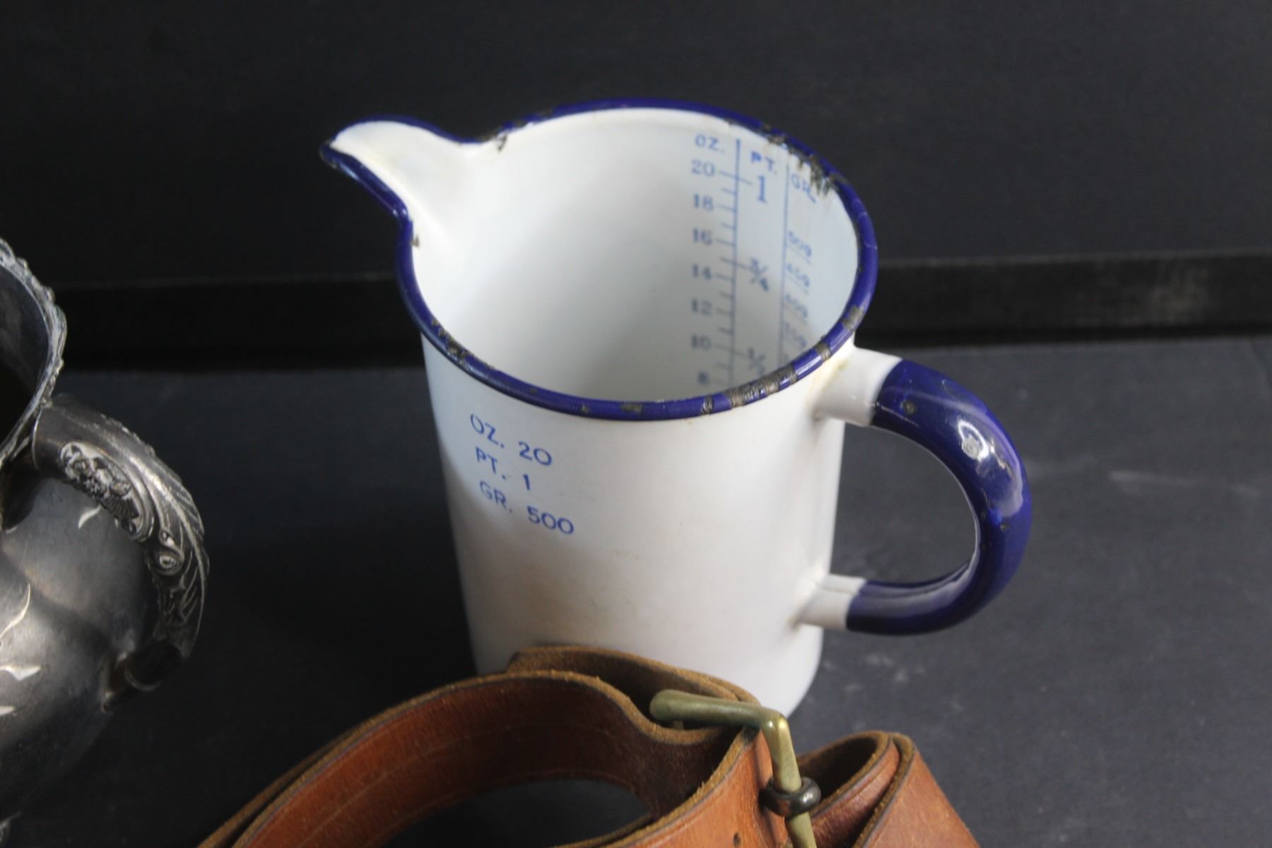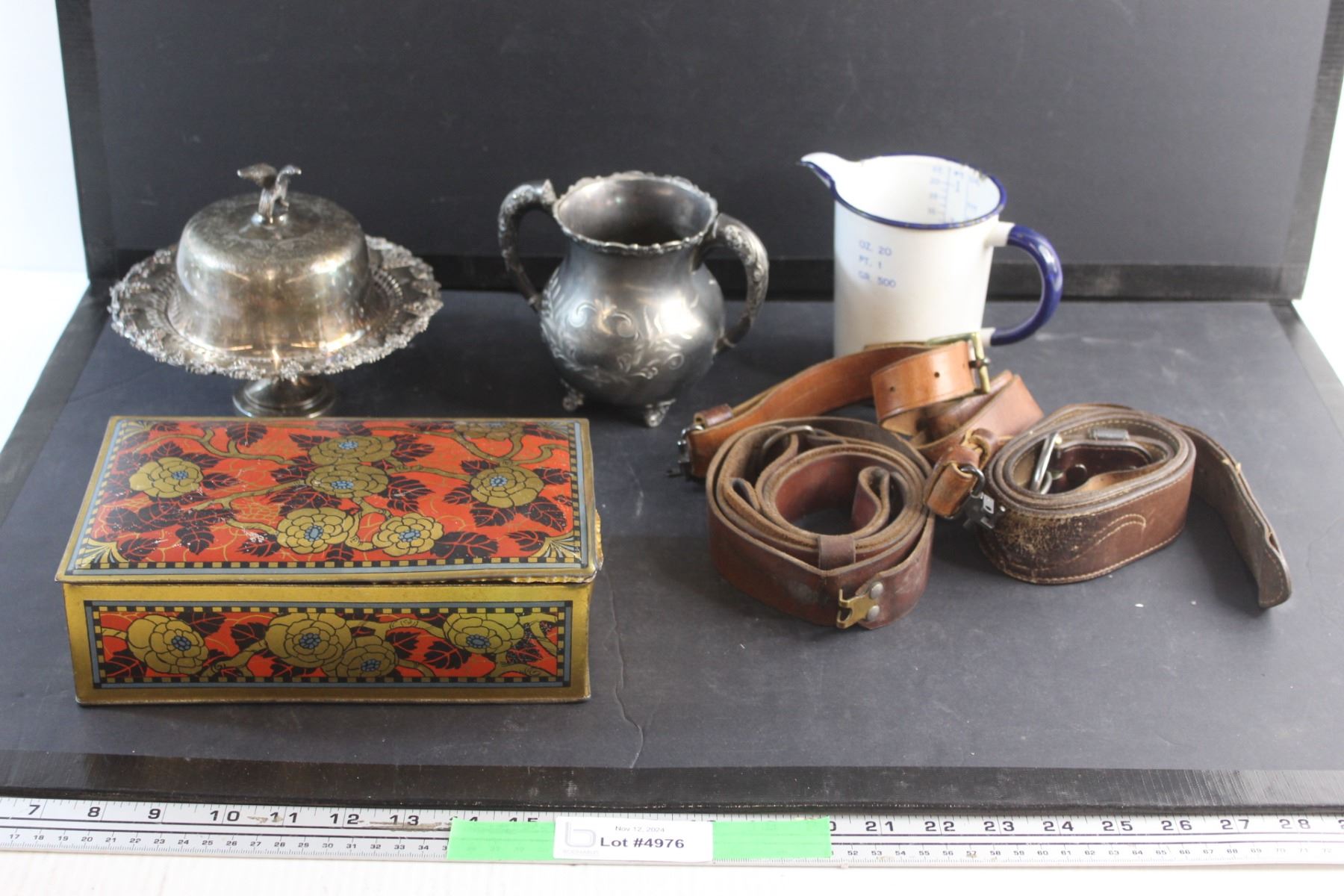 Butter Dish, Vase, (3) Leather Belts, Measuring Enamel Cup and a Jewelry Box